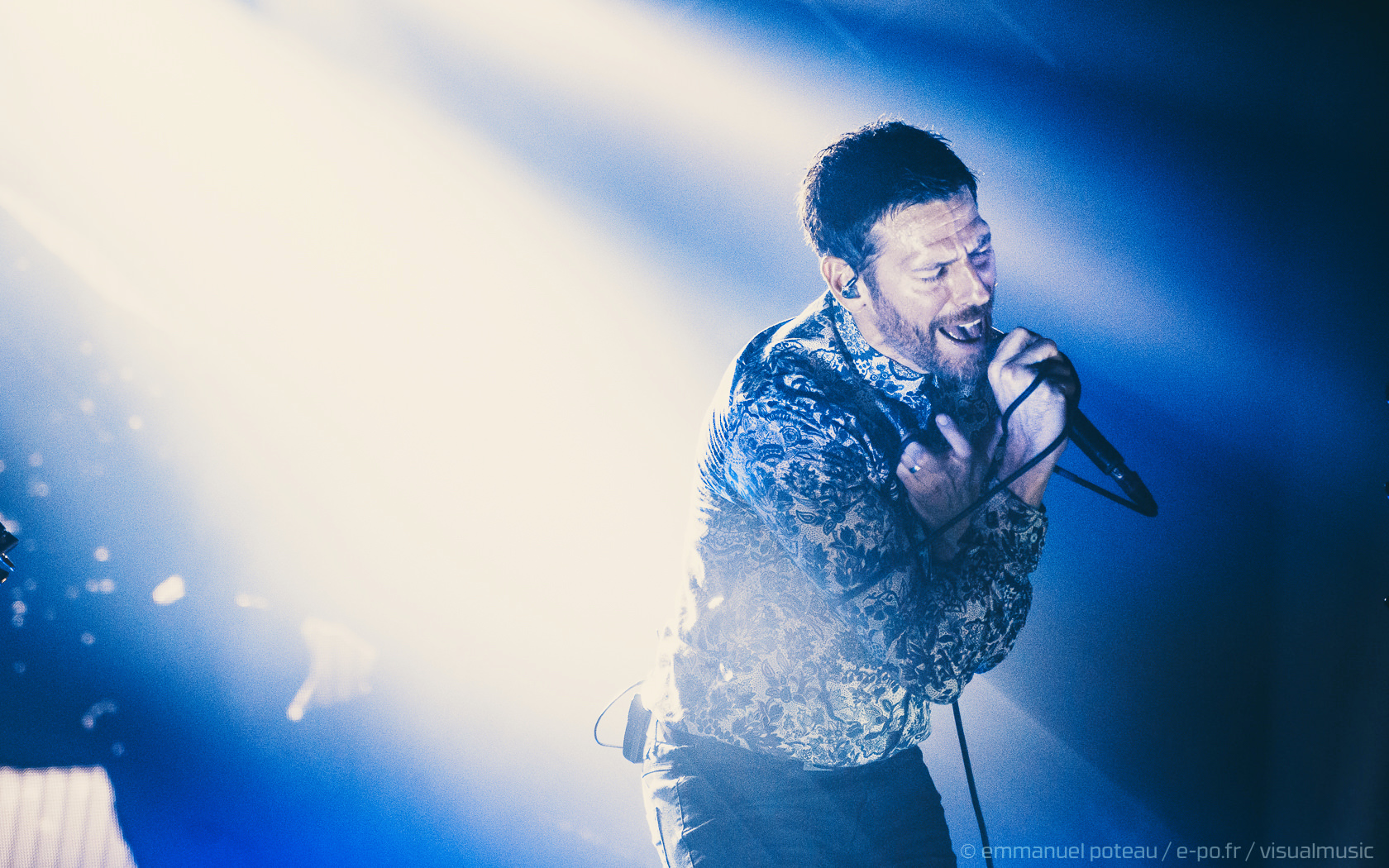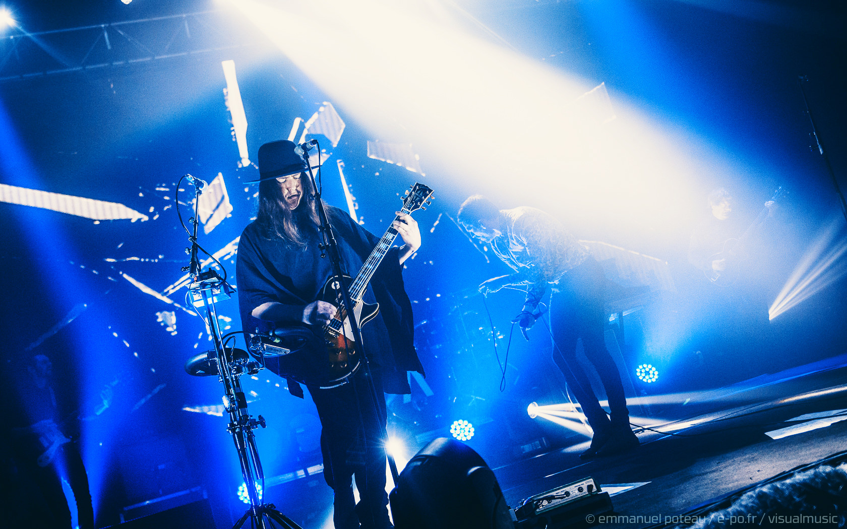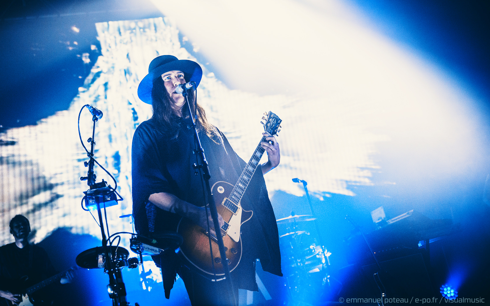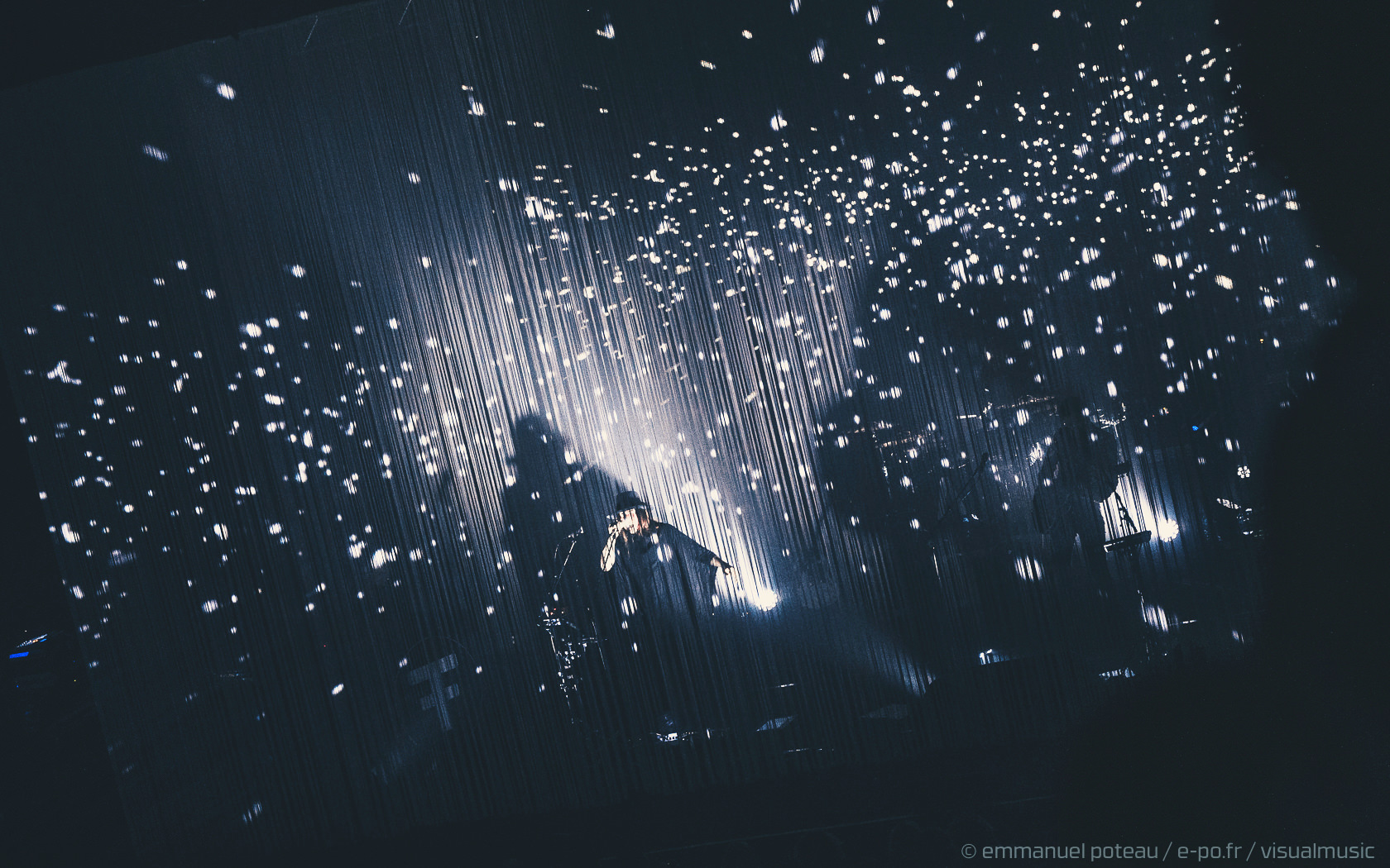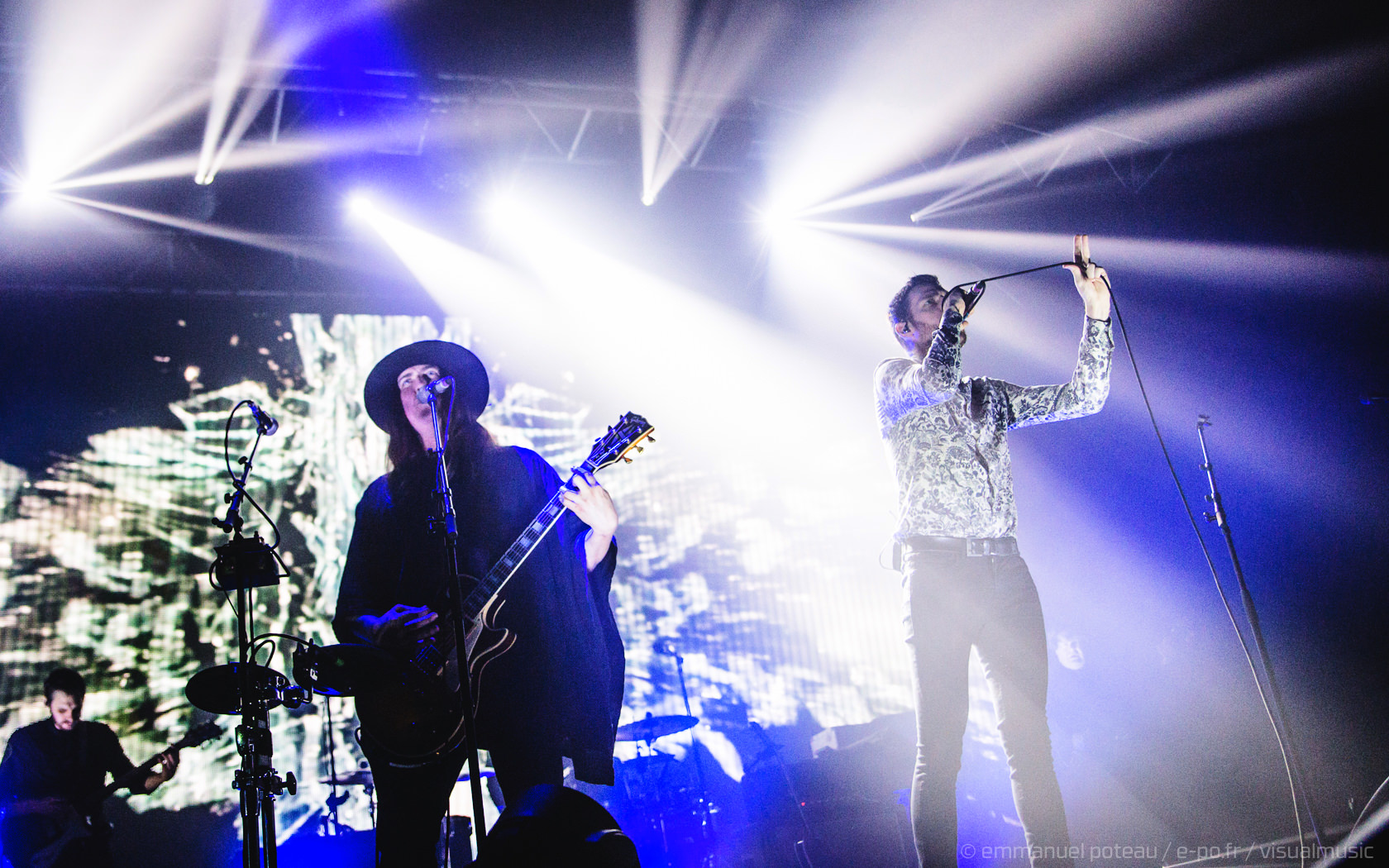 La première chose qui surprend et que l’on n’avait pas vue venir, le groupe a disposé un écran de fines cordes blanches servant ainsi de film de projection sur les premiers titres. Très pratique pour installer leur atmosphère visuelle (bien qu’un peu flippant pour le photographe en place ce soir mais au final, qui aura aussi ses avantages esthétiques). En attendant le groupe attaque sur « Driving In Nails » qui s’appuie sur un environnement visuel fait de glitches, de répétions électro, des flashs visuels, « WELCOME » s’inscrit en grand sur le rideau de projection, les anglais posent ici le décor d’un dernier album oppressant, une intro noire pour une soirée qui s’avérera, en fait, extrêmement lumineuse !