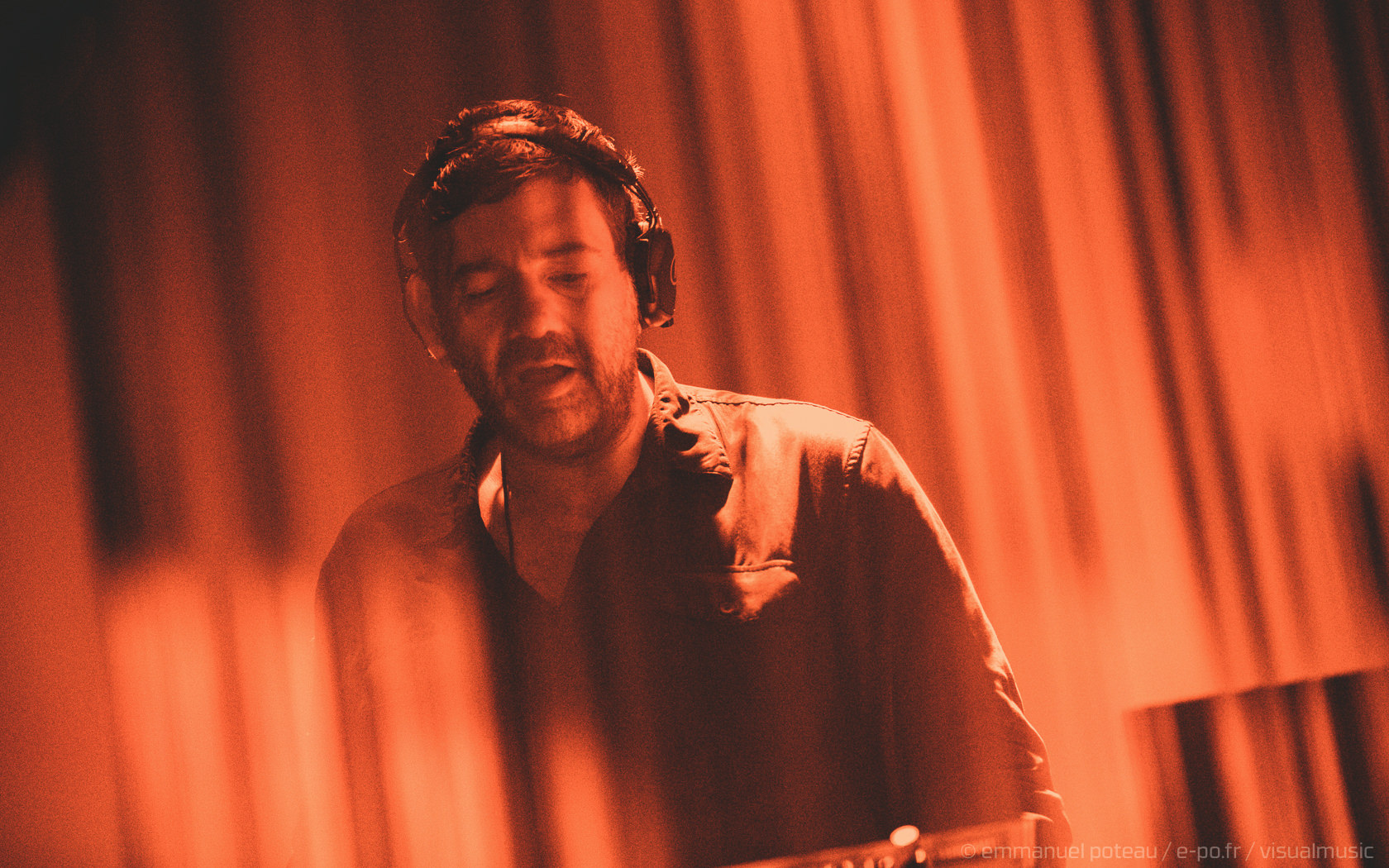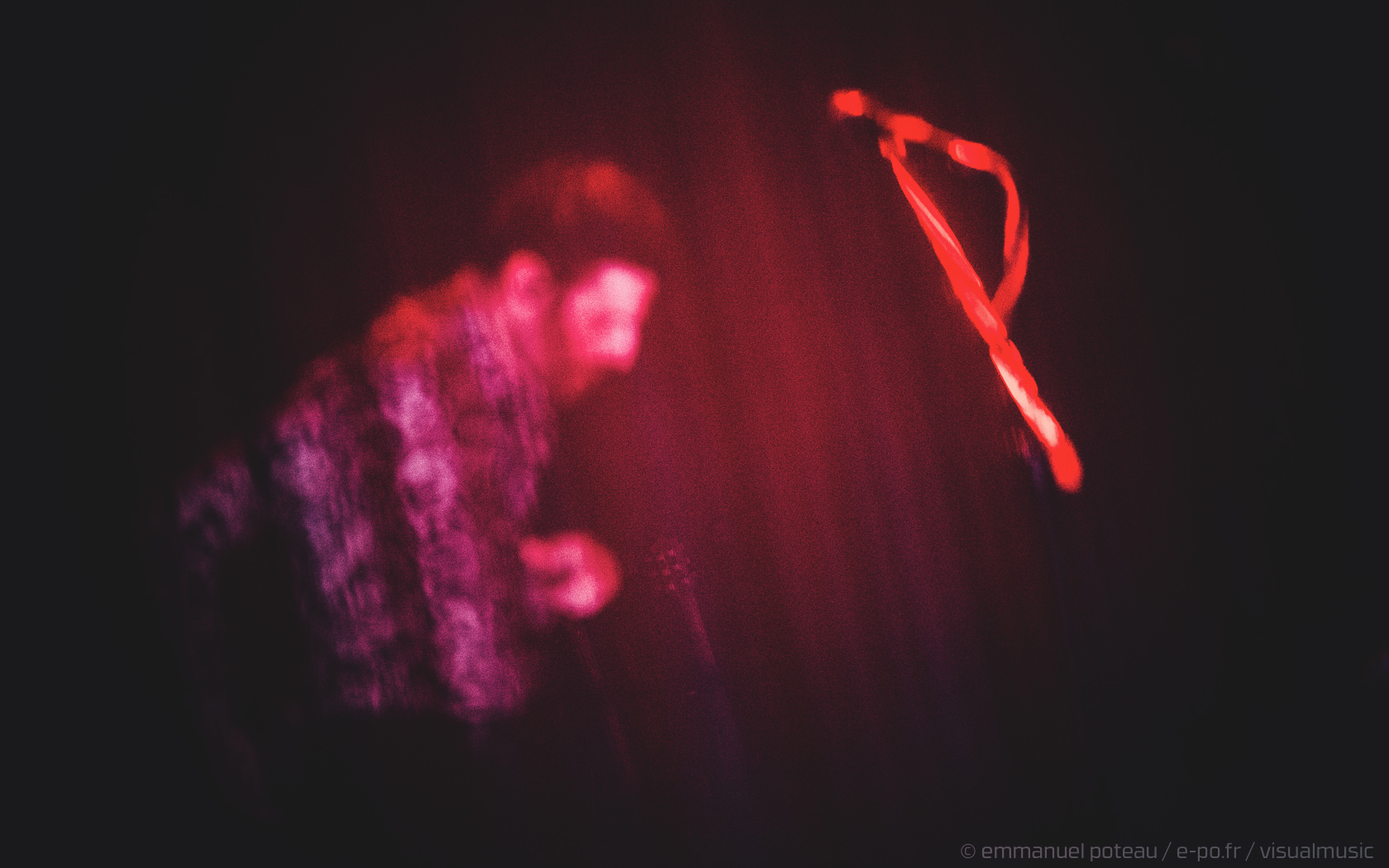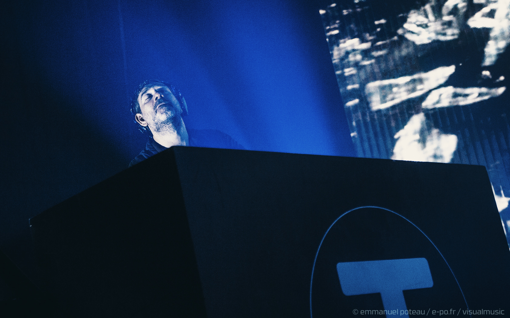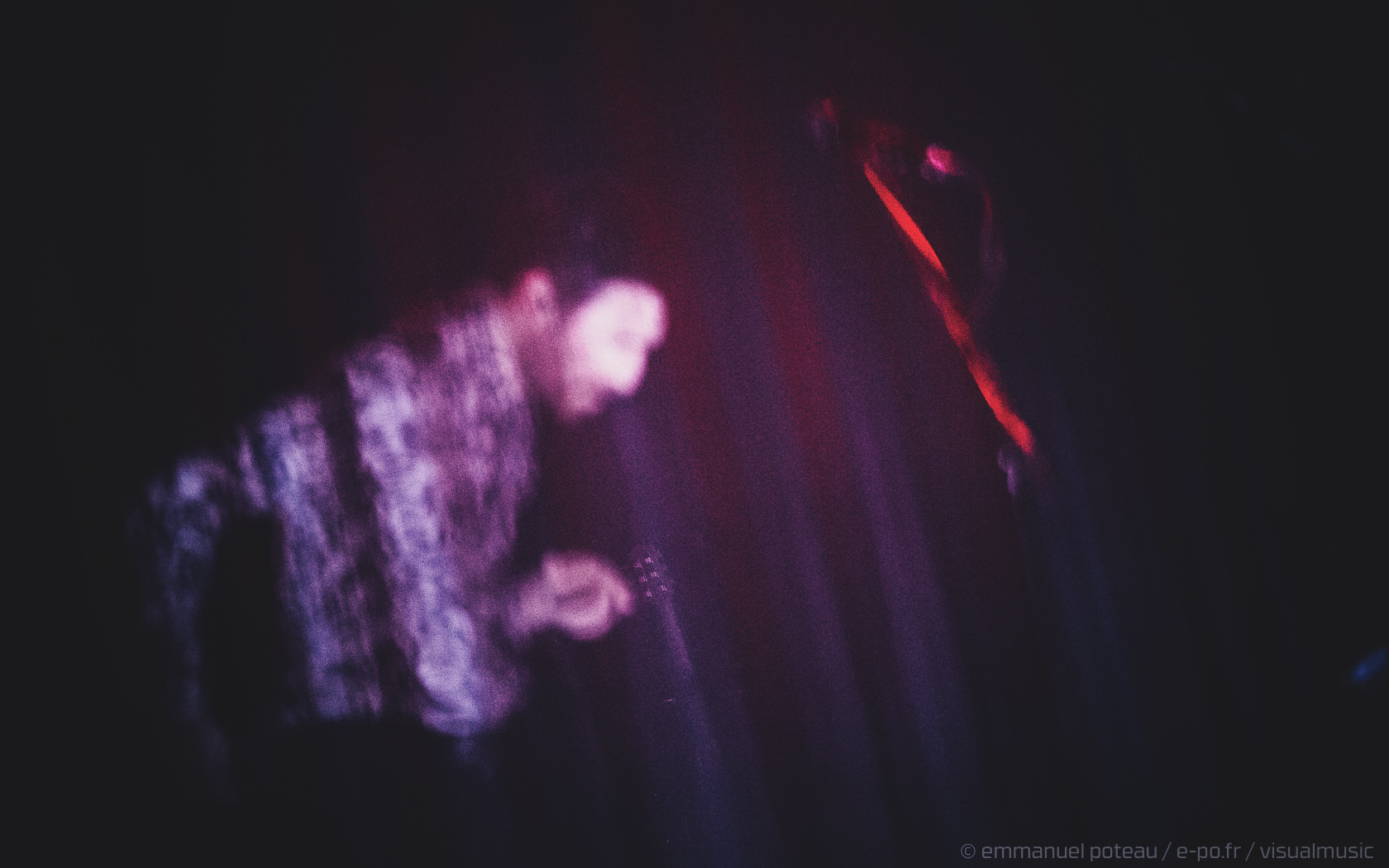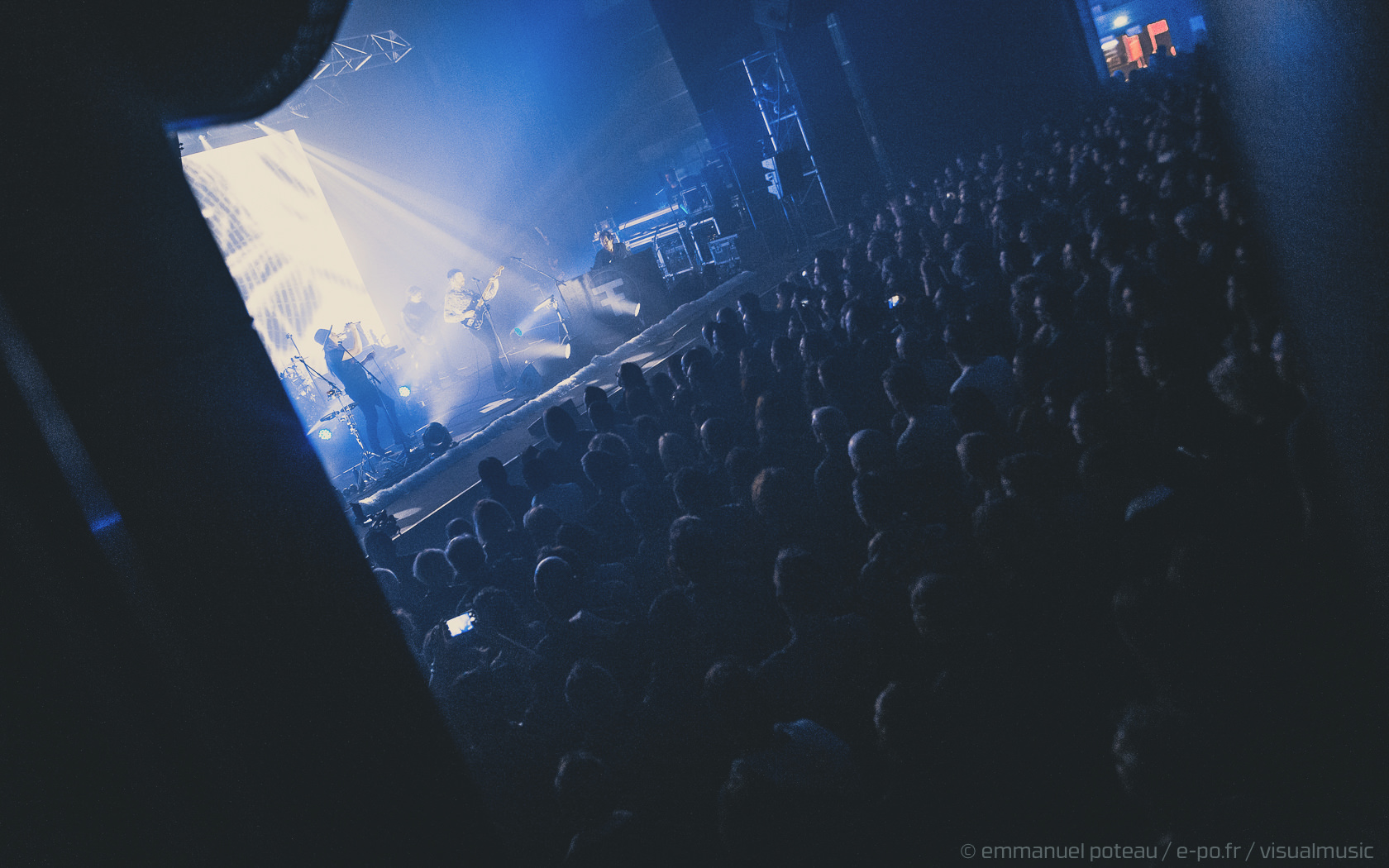 La première chose qui surprend et que l’on n’avait pas vue venir, le groupe a disposé un écran de fines cordes blanches servant ainsi de film de projection sur les premiers titres. Très pratique pour installer leur atmosphère visuelle (bien qu’un peu flippant pour le photographe en place ce soir mais au final, qui aura aussi ses avantages esthétiques). En attendant le groupe attaque sur « Driving In Nails » qui s’appuie sur un environnement visuel fait de glitches, de répétions électro, des flashs visuels, « WELCOME » s’inscrit en grand sur le rideau de projection, les anglais posent ici le décor d’un dernier album oppressant, une intro noire pour une soirée qui s’avérera, en fait, extrêmement lumineuse !