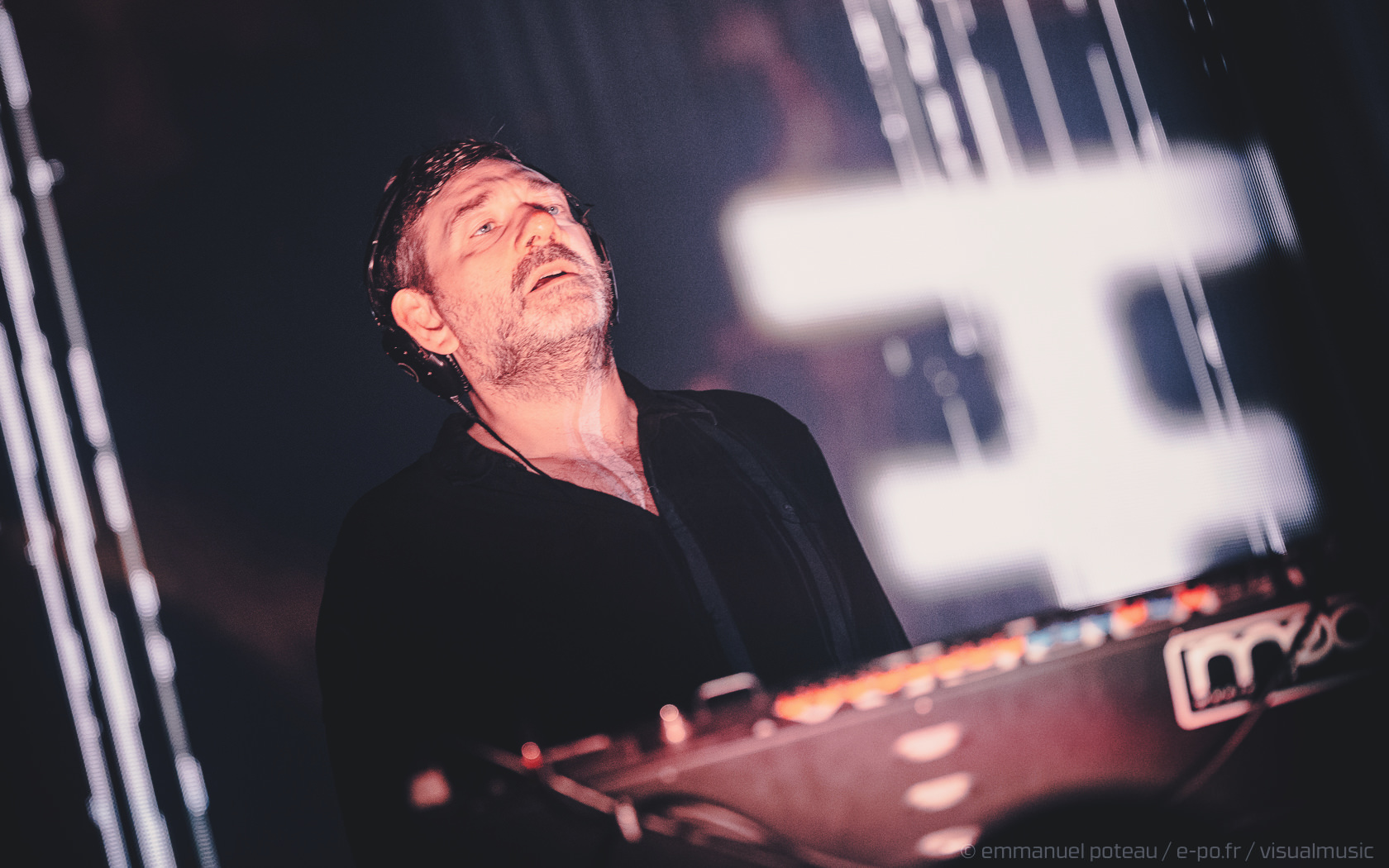 En attendant, sur les premiers titres, le groupe évolue dans l’obscurité, écran géant en fond visuel, et projections au premier plan sur une intro principalement dédiée au dernier album avec 4 titres, coup sur coup, issus de « False Foundation », derrière son clavier, Darius Keeler, membre permanent du collectif bat la rythmique d’un va et vient permanent du bras, une gymnastique qu’il tiendra tout le concert d’ailleurs (salut, c’est la tendinite). Mais il est vrai que, nous aussi, on a envie de secouer les avant-bras en mode Orangina sur les « Kings Of The False Foundation » servi par un Dave Pen tranchant à souhait dans le chant, titre qui s’enchainera avec un « Fuck U » de fort bon aloi et durant lequel le rideau finira par tomber, révélant le groupe au grand jour, il faut dire que ce soir le groupe va littéralement livrer une performance de haute volée, maitrisée, bien balancée, et appuyée par un excellent jeu de lumières. J’insiste car souvent cela passe assez inaperçu mais ici, la formation ne se fait aucunement envahir par son écran et c’est bien une scénographie très soignée, propre et au service de la performance que l’on pourra apprécier de bout en bout. Appréciable.