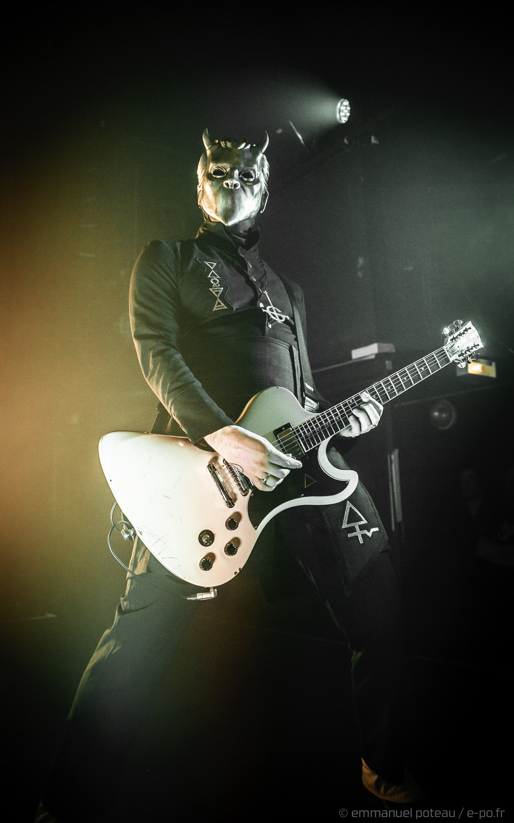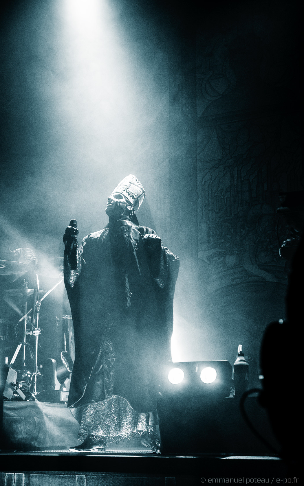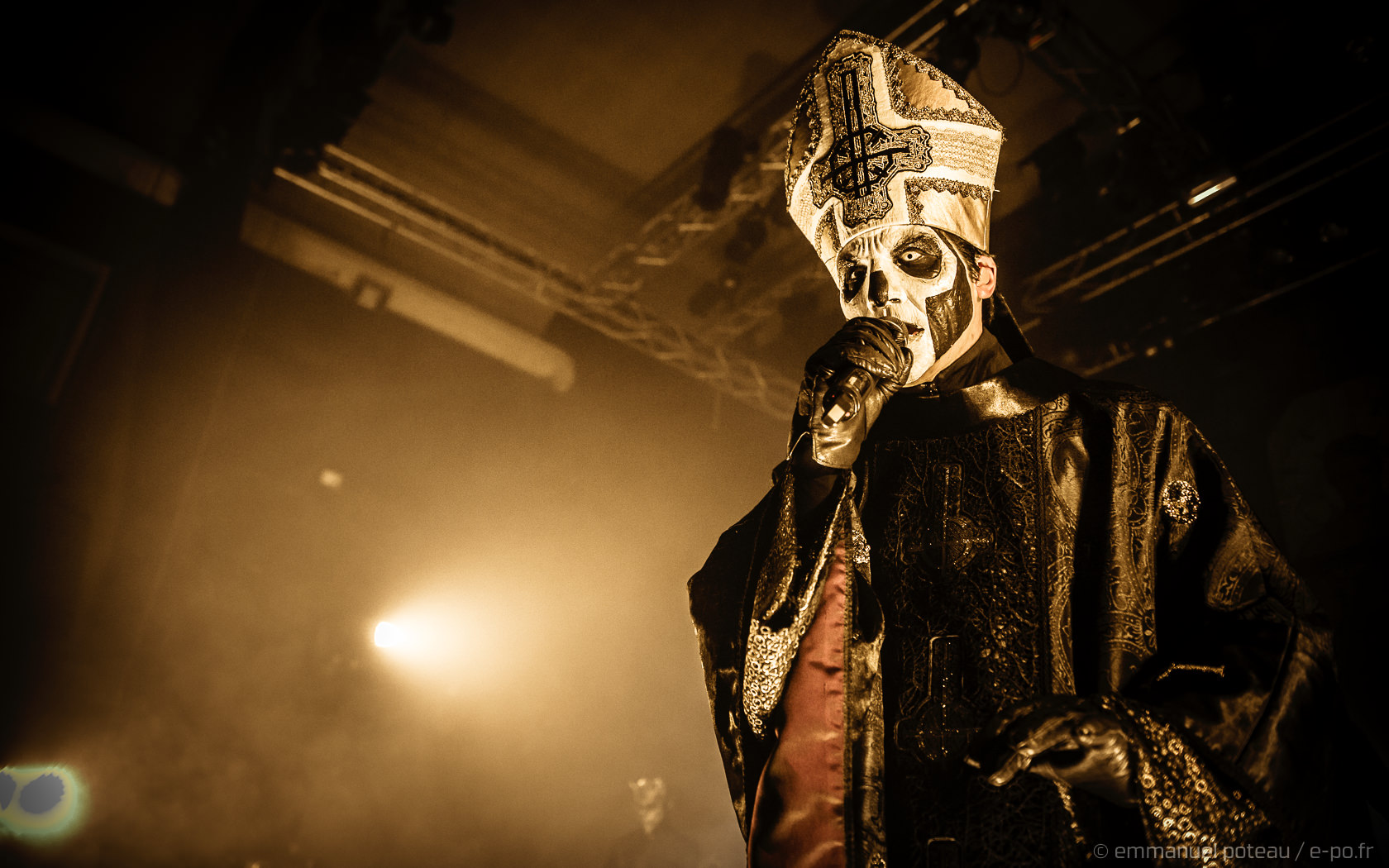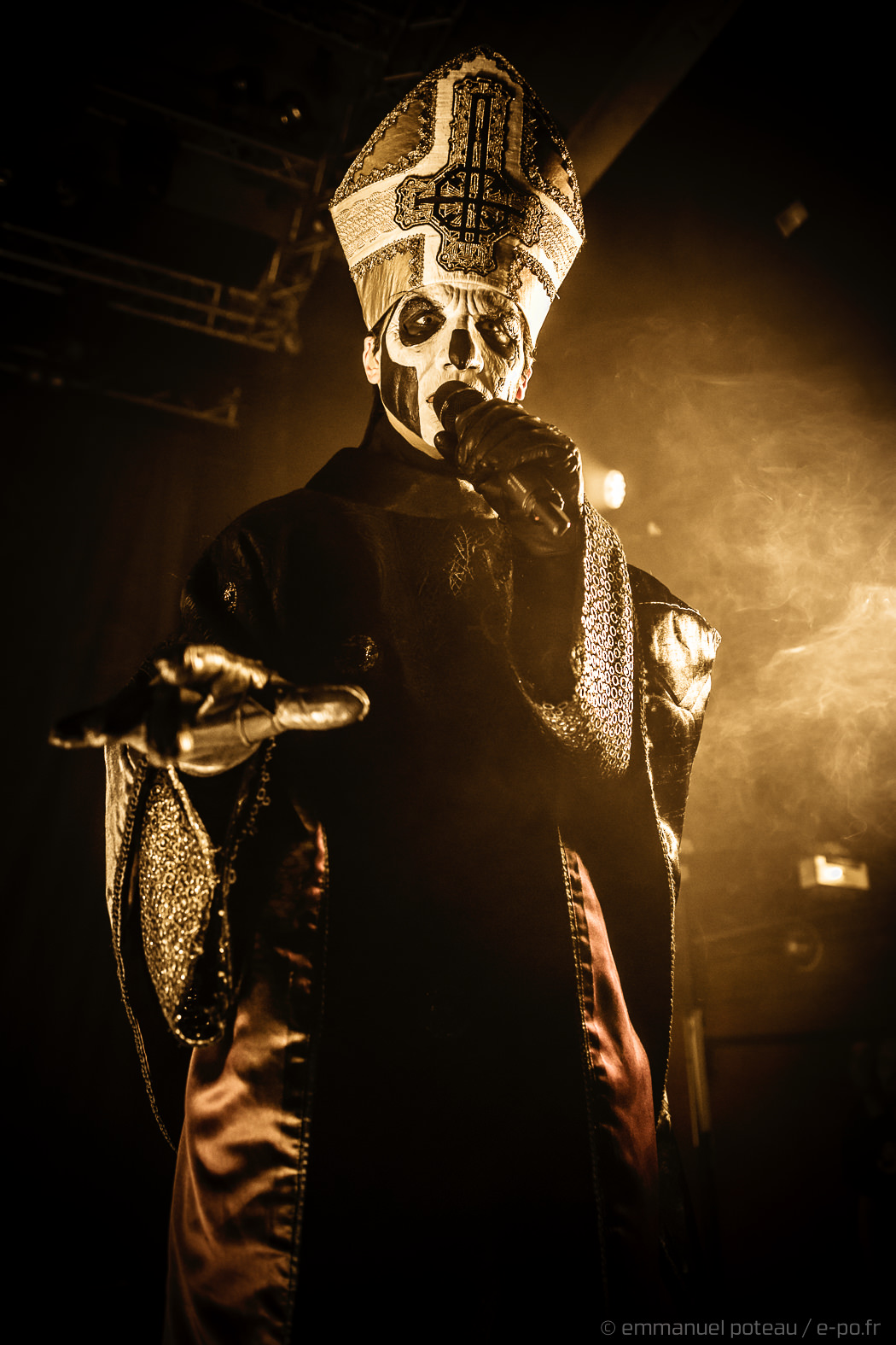 Très vite, on comprend que la cérémonie de ce soir va être à la hauteur des attentes, les goules sont entrées de plein pied dans le show, ça tourne beaucoup, ça claque furieusement du pied sur scène pour marquer les tempos, Papa met en avant ses musiciens, d’ailleurs, j’avoue avoir rarement vu un groupe où chaque membre semble se soucier de l’autre et de sa reconnaissance. Et le temps des premiers titres comprenant, Emeritus arbore sa toge, ce n’est qu’à l’issue d’une dizaine de titres qu’il lâchera son habit papal pour quelque chose de moins chaud (très certainement) et un costume moins grandiloquent. N’en reste pas moins une scénographie ultra léchée avec un Papa et des goules proches du public. Les interactions sont nombreuses, comme quand le vil serviteur du Démon décide de faire passer ses « Sisters Of Sin » dans les premiers rangs. Certainement deux jeunes pécheresses alpaguées dans la compacte foule des impies aux aurores de la messe.