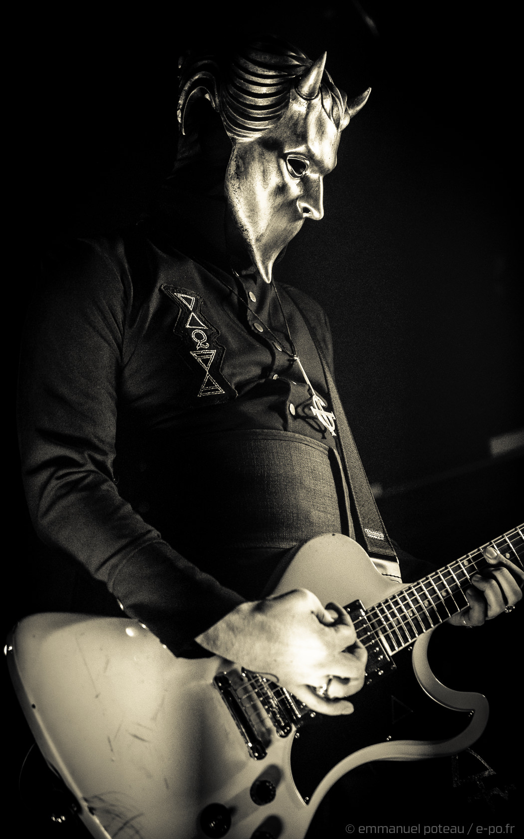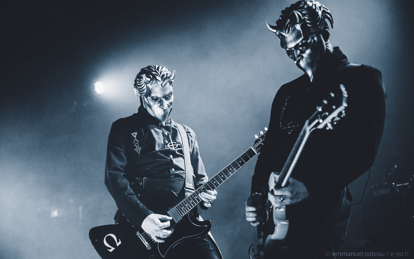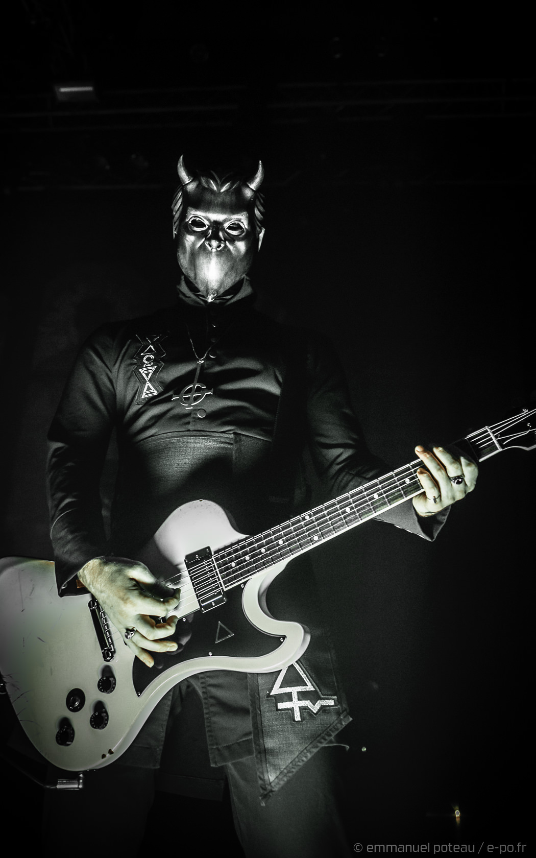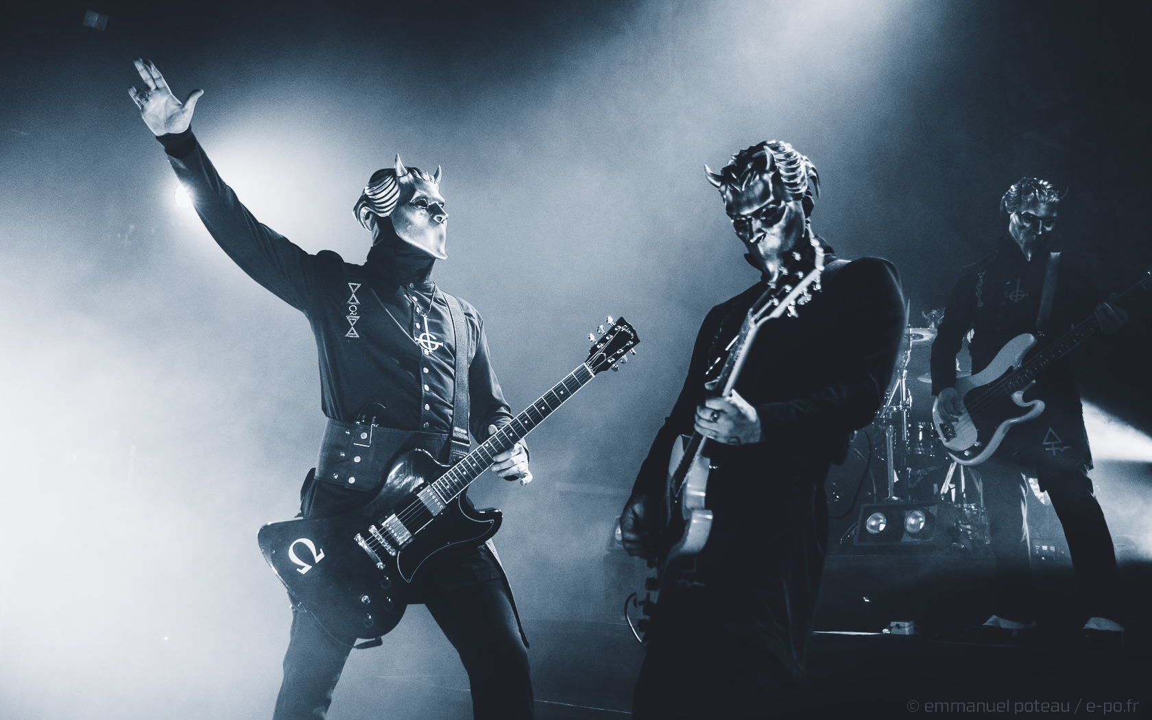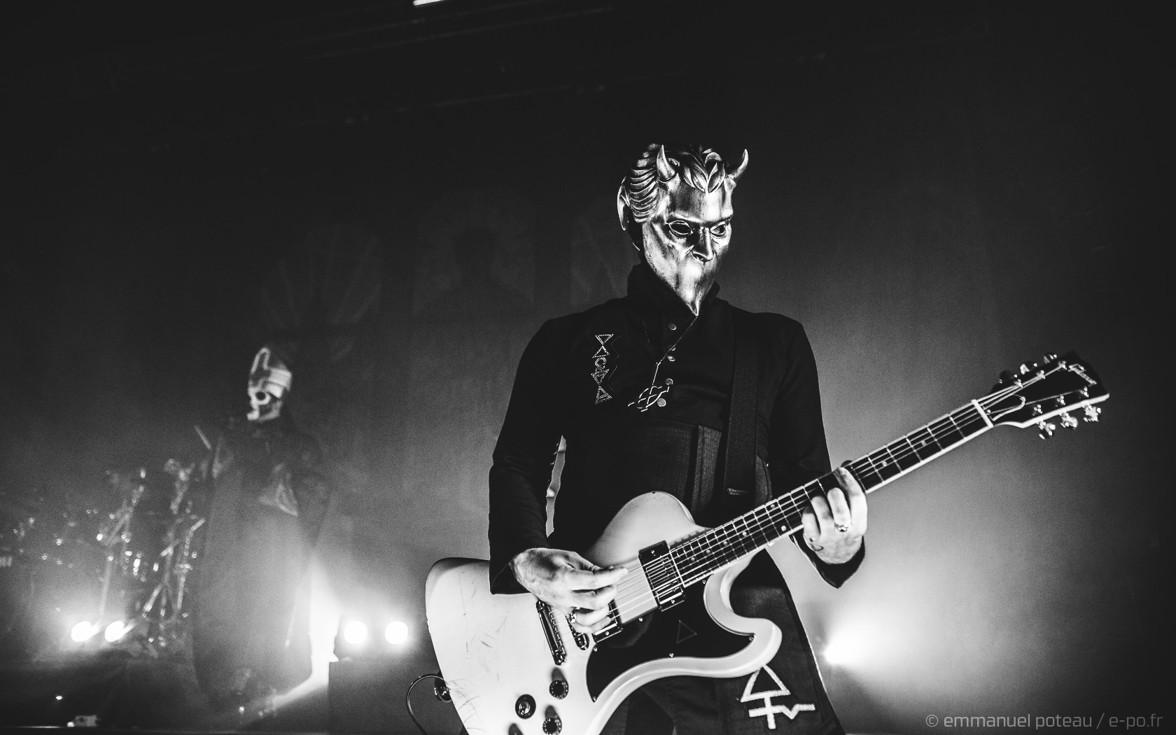 Très vite, on comprend que la cérémonie de ce soir va être à la hauteur des attentes, les goules sont entrées de plein pied dans le show, ça tourne beaucoup, ça claque furieusement du pied sur scène pour marquer les tempos, Papa met en avant ses musiciens, d’ailleurs, j’avoue avoir rarement vu un groupe où chaque membre semble se soucier de l’autre et de sa reconnaissance. Et le temps des premiers titres comprenant, Emeritus arbore sa toge, ce n’est qu’à l’issue d’une dizaine de titres qu’il lâchera son habit papal pour quelque chose de moins chaud (très certainement) et un costume moins grandiloquent. N’en reste pas moins une scénographie ultra léchée avec un Papa et des goules proches du public. Les interactions sont nombreuses, comme quand le vil serviteur du Démon décide de faire passer ses « Sisters Of Sin » dans les premiers rangs. Certainement deux jeunes pécheresses alpaguées dans la compacte foule des impies aux aurores de la messe.