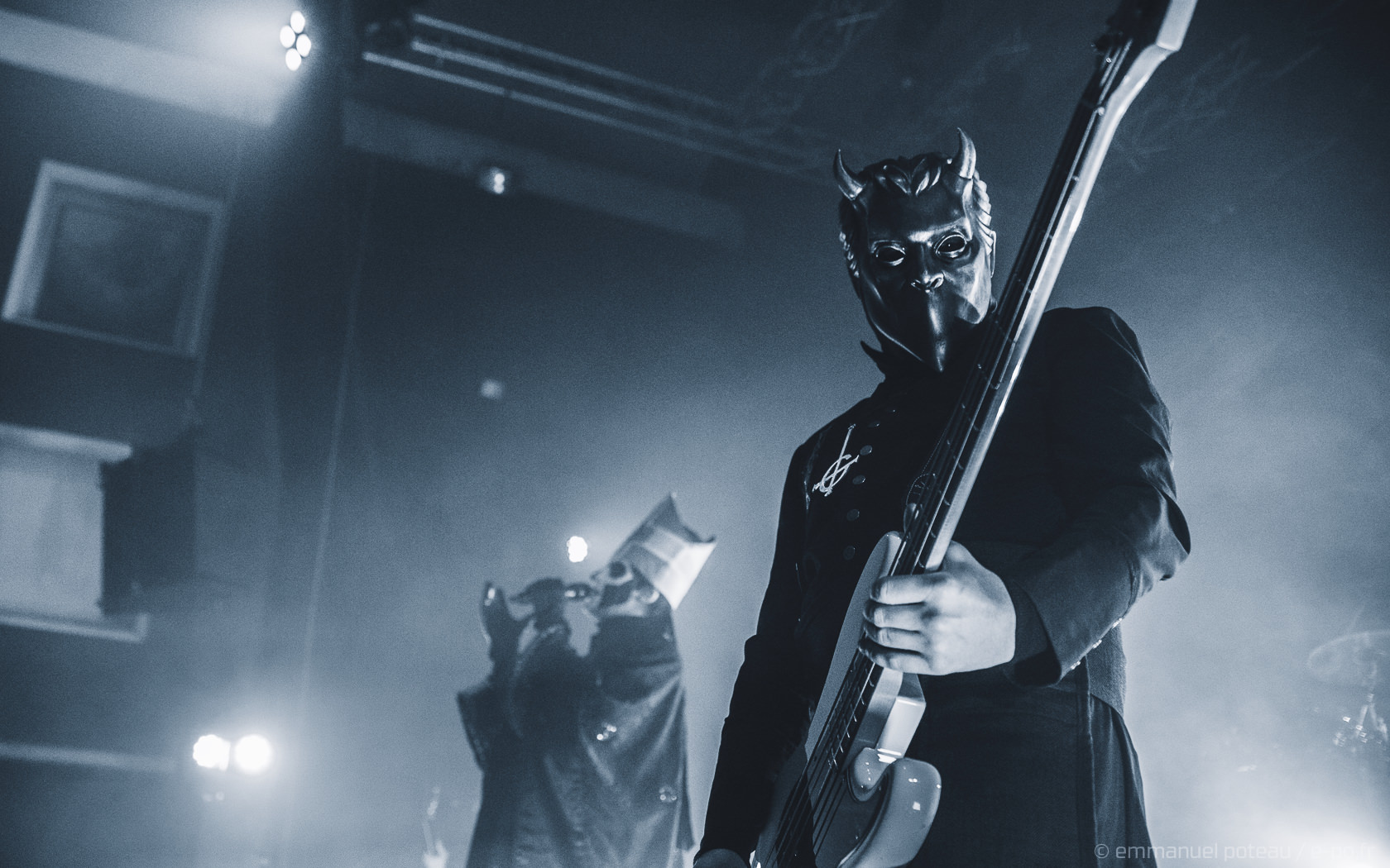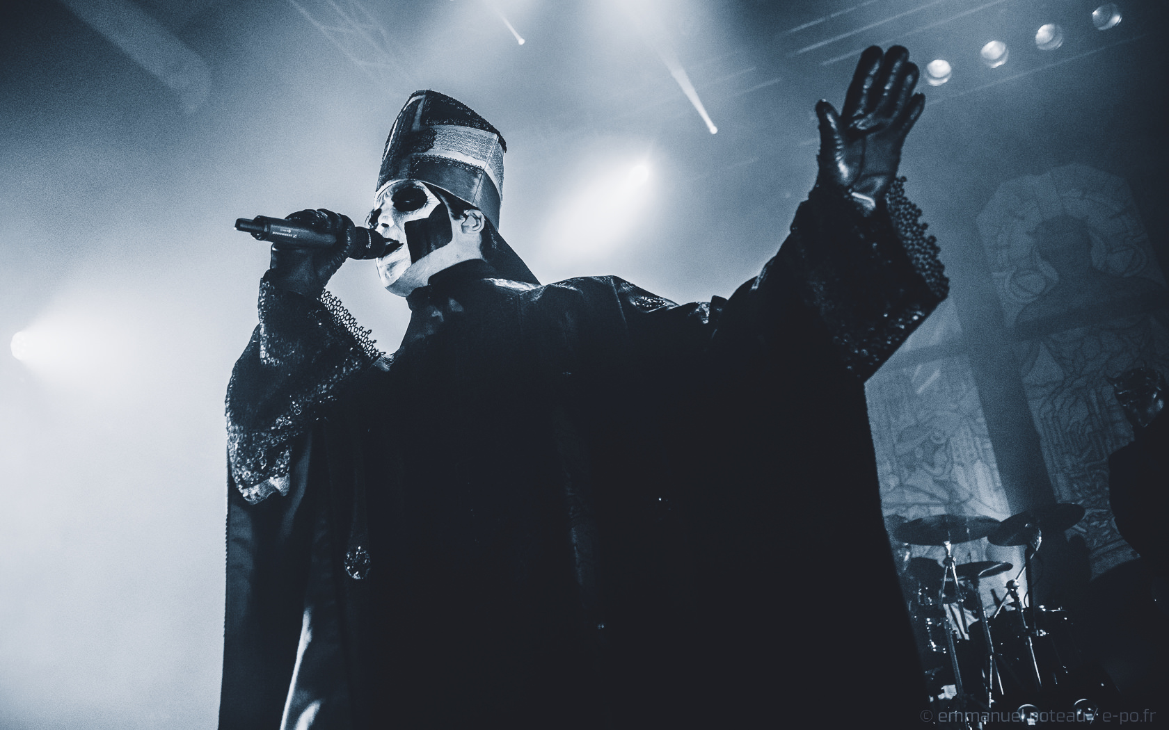 Puis, les choses se précisent, le groupe entrant sur la musique de Jocelyn Pook, « Masked Ball », célèbre titre exploitée dans le Eyes Wide Shut de Stanley Kubrick. Les goules sans nom prennent alors place sur scène, ornée d’un superbe artwork reprenant l’univers expressionniste de Meloria. C’est sur « Spirit« , que Papa débarque et même s’il ne s’agit que de la seconde date de la tournée 2016, on sent que les mecs ont pas mal tourné les mois précédents puisque tout semble ultra rodé.