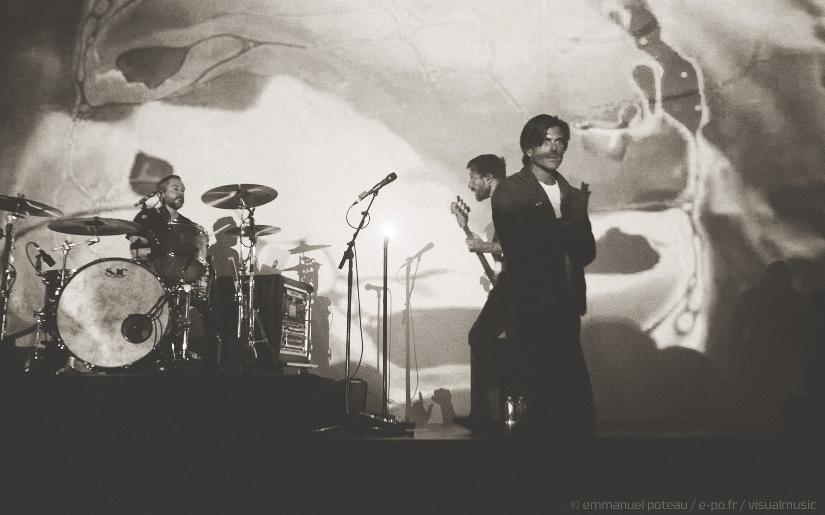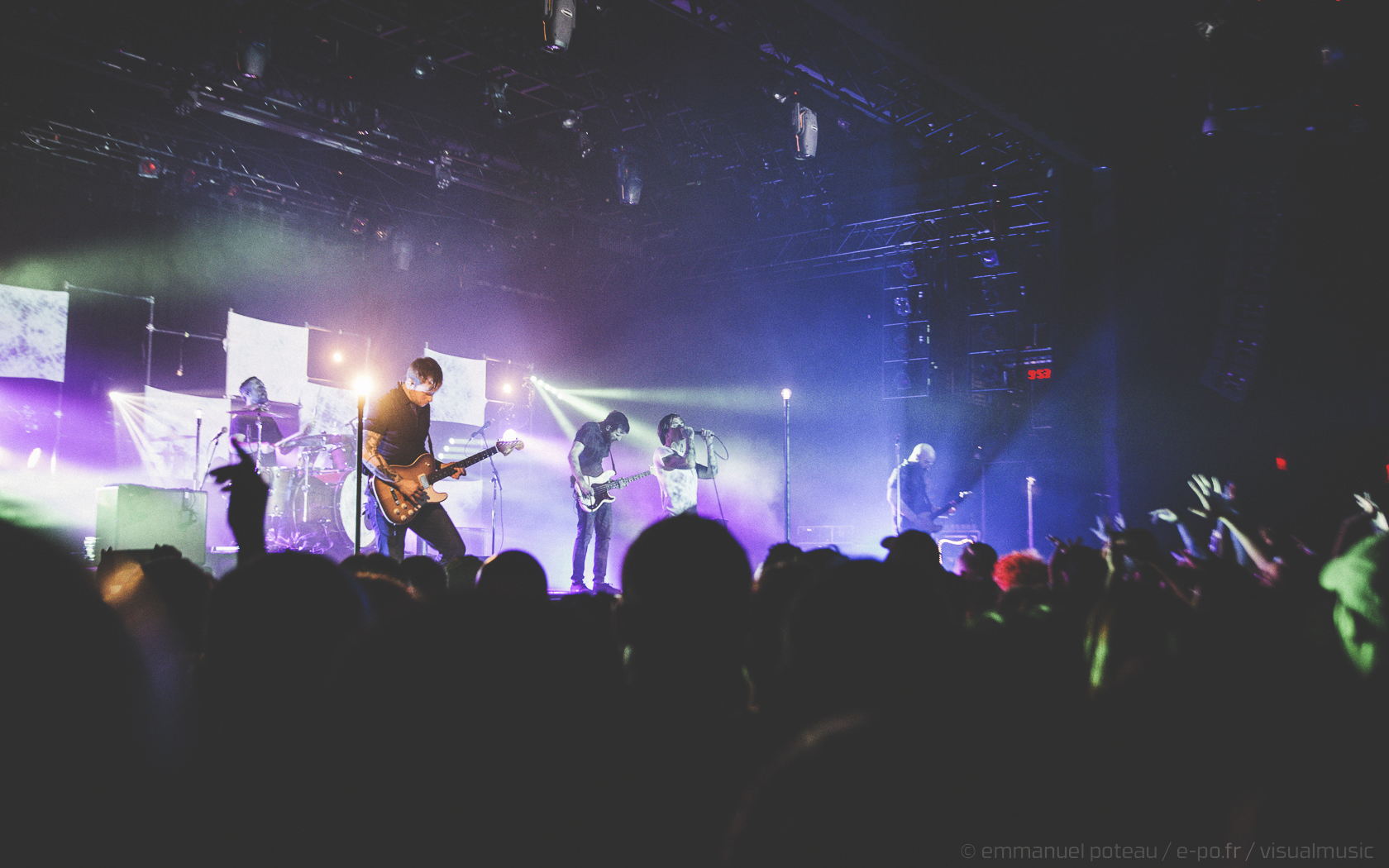 Au final, c’est donc à 21h30, une éternité quand on patiente depuis 16h30 devant la salle, que Circa Survive fait son entrée. Et bordel, que ça fait plaisir. Enfin ! Voir le groupe jouer devant une salle quasi complète, quand chez nous, ils remplissent difficilement une salle de 500 places comme en 2010. Pas de doute, les fans dévoués, tatoués du logo du groupe, font leur maximum pour approcher le devant de la scène. Une scène sur laquelle seront projetés des effets vidéos psychédéliques, fondant un peu plus encore le groupe dans la salle pour ne faire qu’un avec l’enceinte et son public.