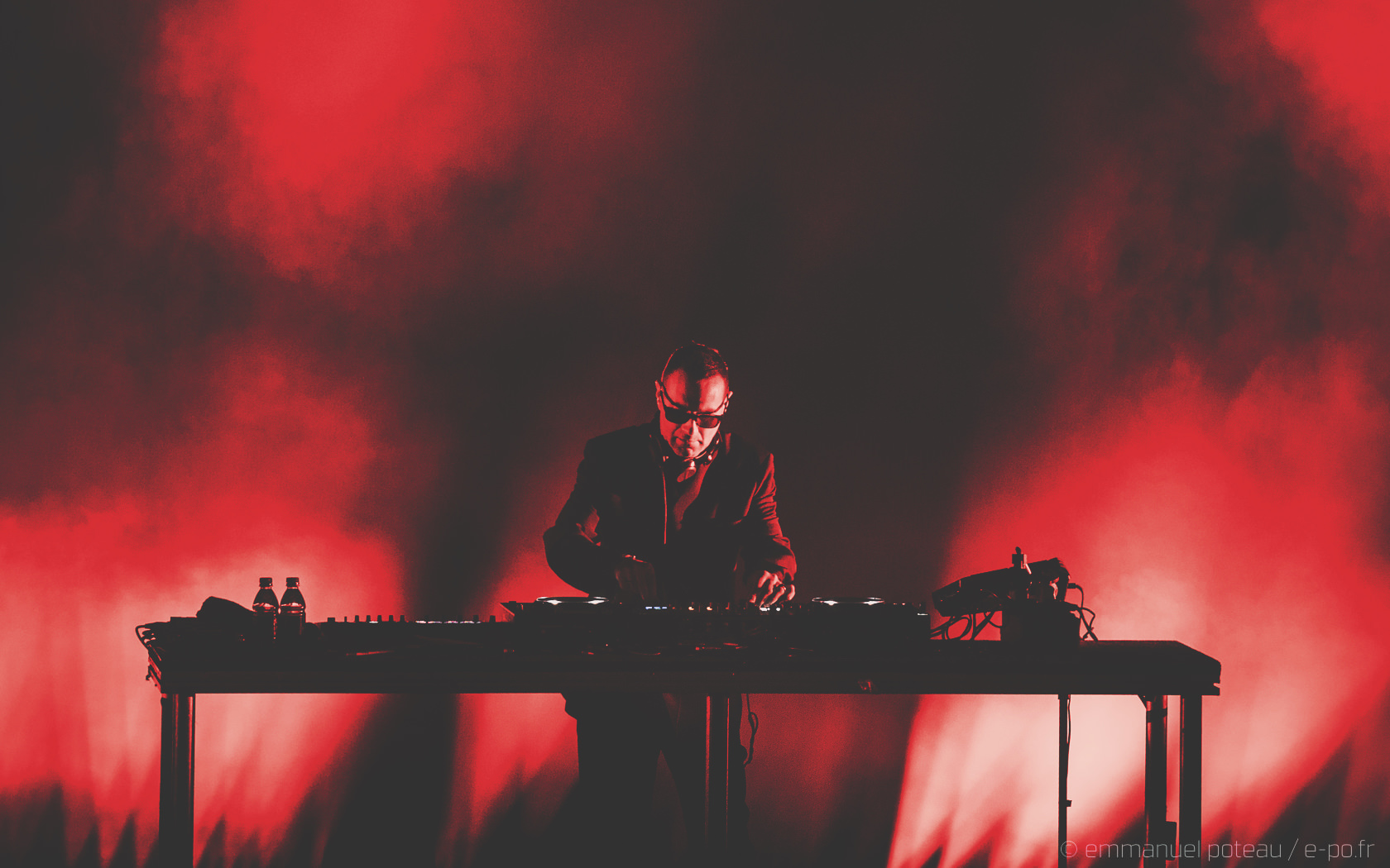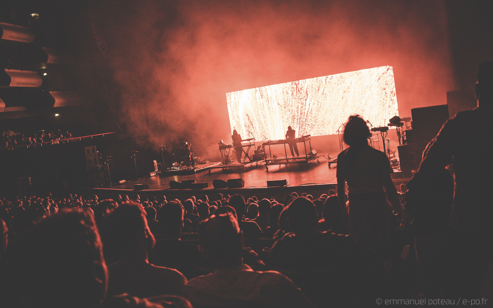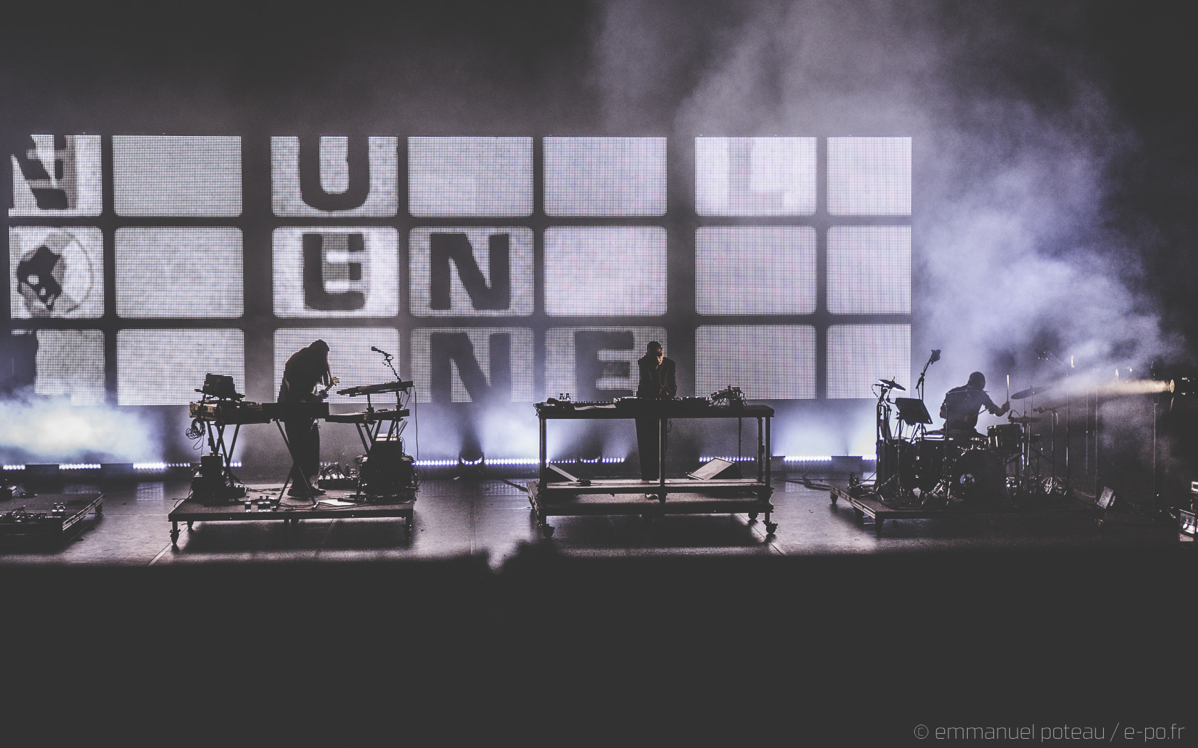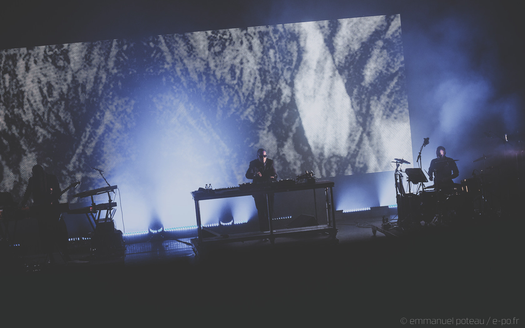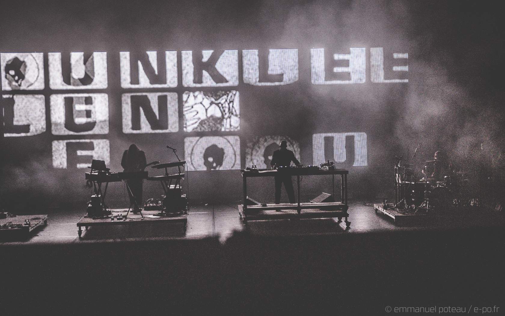 Et j’avoue. Là, je suis passé à côté d’un truc ! Juste avant, on m’a signalé que le concert se verrait interrompu par un entracte, je me suis dit « mais non, y a pas d’entracte sur un concert, ça ne devait pas être ça ». Après une honnête première partie assurée par Skinny Pelembé, c’est donc James Lavelle accompagné de 3 musiciens qui va prendre possession de l’espace. L’homme fort du label MoWax se positionne, à son habitude, derrière les platines tout en étant accompagné d’un batteur, d’un clavier et d’un violoncelliste. Après avoir été contrôlé 20 fois avant et pendant le concert « are you a photographer ? » et malgré la gentillesse de mes hôtes du soir, je me retrouve donc à photographier d’endroits très très spécifiques le show (sur demande du management). Ce n’est qu’en revenant à ma place qu’un élément me chatouille, où sont les chanteurs ? Je ne comprends pas trop, me voici surplombant la scène depuis les gradins à scruter mais non, James Lavelle est bien là, seul, à balancer ses pistes sonores comme « Restless » faisant apparaitre Josh Homme en piste vidéo et audio (rien de surprenant, cet aspect DJing était déjà présent à Paris en 2010, date de leur dernier passage), puis se succèdent des titres tels que « Reign », « Heaven » (le clip réalisé par Spike Jonze en arrière-plan bien sûr) et dont le chant restera À JAMAIS associé au regretté Gavin Clark mais le sentiment m’envahit… La déception teintée d’un brin d’ennui.