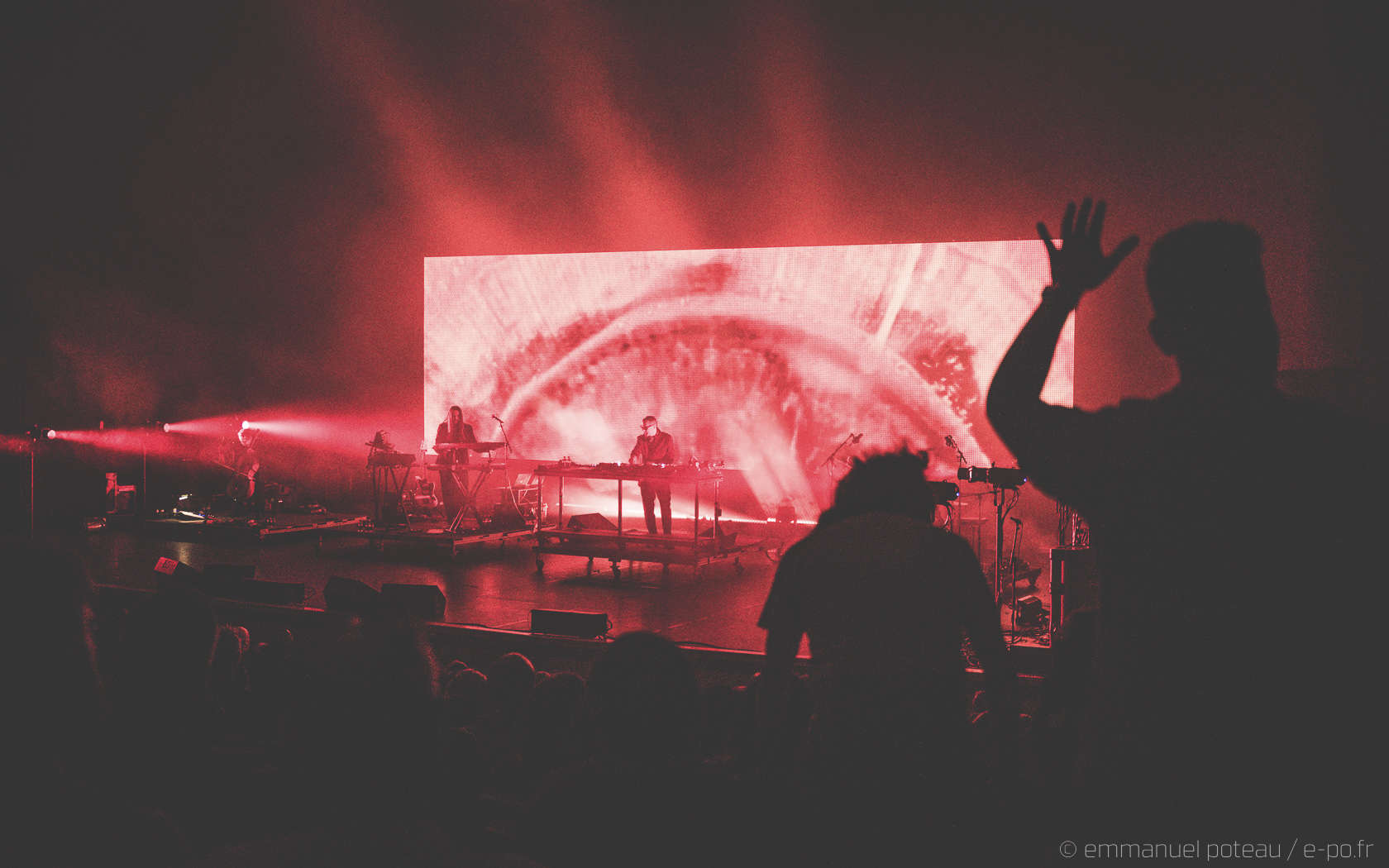 Heureusement et après une heure de mix, l’entracte arrive bien et sur le fond de la scène, « UNKLE : On The Road – Act 2 – Afterhours ». Et c’est bien ça qui va m’intéresser, cette fois James Lavelle s’empare du micro aux côtés de ESKA et Tom Smith pour reprendre le titre « Crucifixion » en chœur. Les machines à fumée sont bien poussées et je peine presque à reconnaitre un Tom Smith tout en cheveux longs mais cette fois, c’est bon, le concert que j’attendais est lancé. Dhani Harrison vient assurer son chant sur la fragile « Days And Night », The Big Pink sur la plus passable « Find An Outsider », Smith en solo sur la magnifique « The Other Side » mais clairement, ce soir, ce ne sont pas les mecs qui vont tuer le game. Ce sont bien les invitéEs ! ESKA en première ligne, qui assurera avec une véritable énergie le chant sur l’incontournable, l’indémodable « Lonely Soul » (Richard Ashcroft assurant initialement le chant sur ce titre vieux de 21 ans), on sent bien, d’ailleurs, que le concert se débride véritablement sur cette seconde partie.