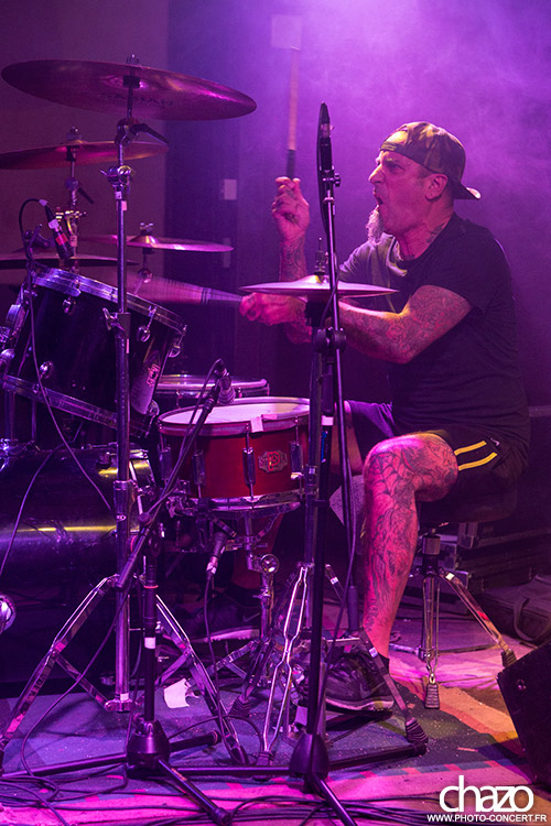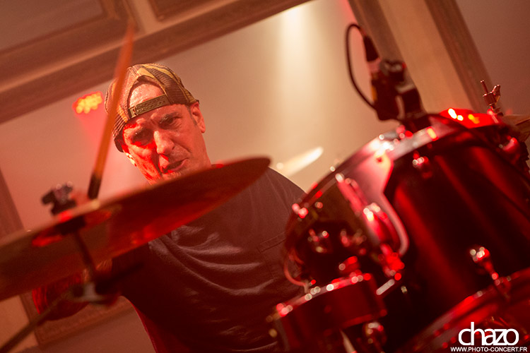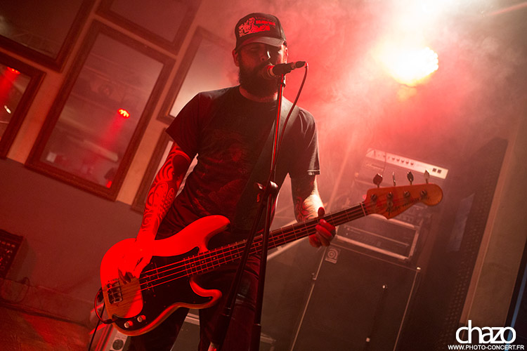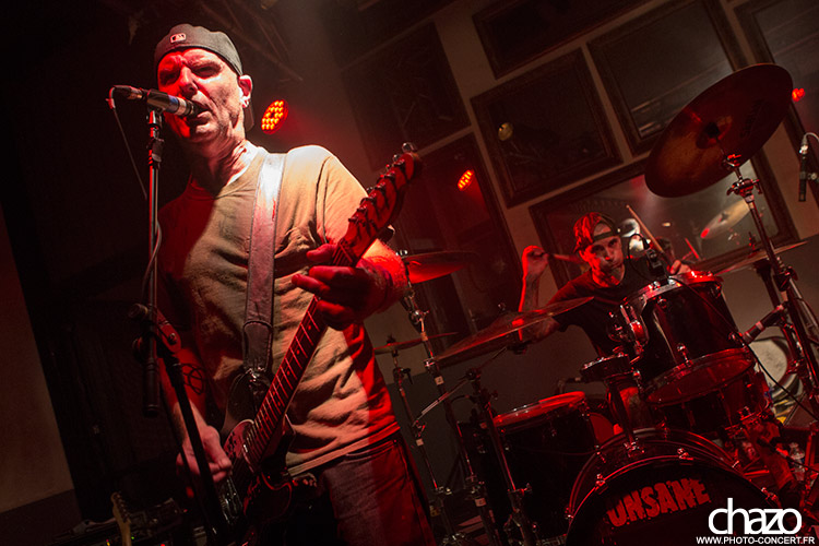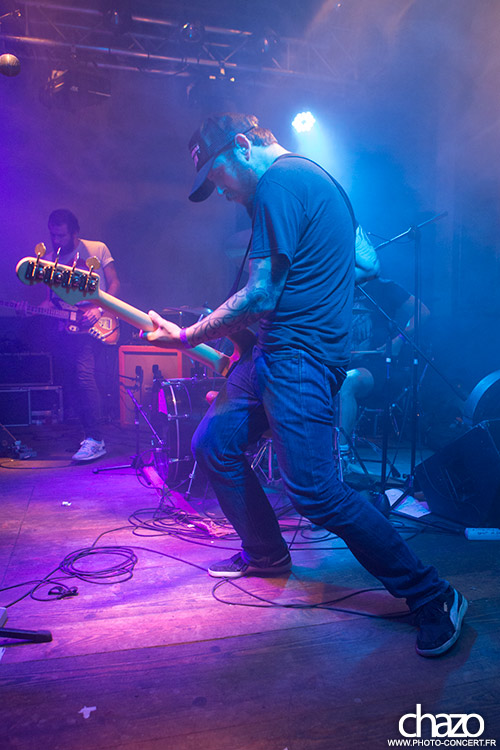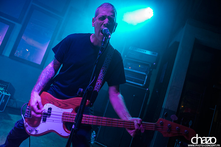 La mise en place est rapide et le groupe à casquettes ne tarde pas à rameter tout le monde, avec un peu de bruit. Le gap générationnel avec Sofy Major est notable, mais leurs têtes de vieux n’impactent en rien la hargne dans leur regard. Celui de Chris Spencer au chant est flippant et le son s’en ressent : les titres arrachent. Les intros de batterie ajoutées sur bon nombre d’entre eux sont la touche d’originalité par rapport aux albums. Et le talent de Vinnie Signorelli se fait sentir, ces intros étant 1000 fois plus appréciables que n’importe quel solo moisi de batteur superstar. Le public s’enflamme, ce qui est toujours amusant dans une salle aussi réduite que le Saint des Seins. Les quelques fervents supporters qui connaissent les titres sur le bout des doigts sont rejoints dans leur agitation par tous les premiers rangs qui s’animent. Les bières se renversent et monsieur bootleg devant moi commence à faire attention à son enregistreur. Le groupe, heureux d’avoir quitté le nord et sa pluie, perd le fil du temps et décide de jouer jusqu’à se faire dégager. C’est le moment où Chris, coulant et dégoulinant de sueur, arrêter de maltraiter sa Telecaster et sort l’harmonica pour « Alleged ». Au final, on a droit à une belle heure de concert, conclue sur le rigolo et effrayant « Ha Ha Ha », reprise de Flipper.