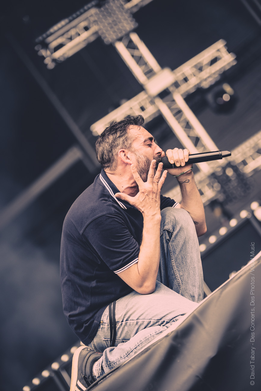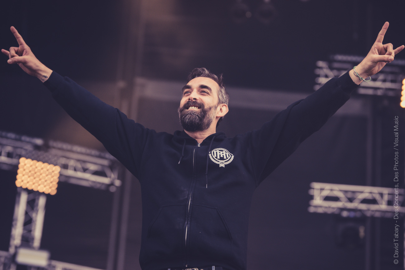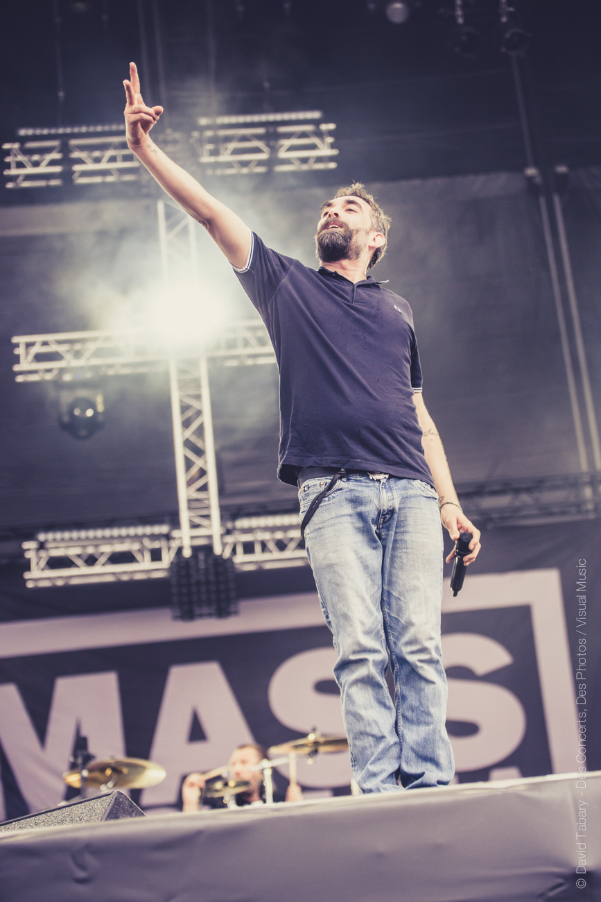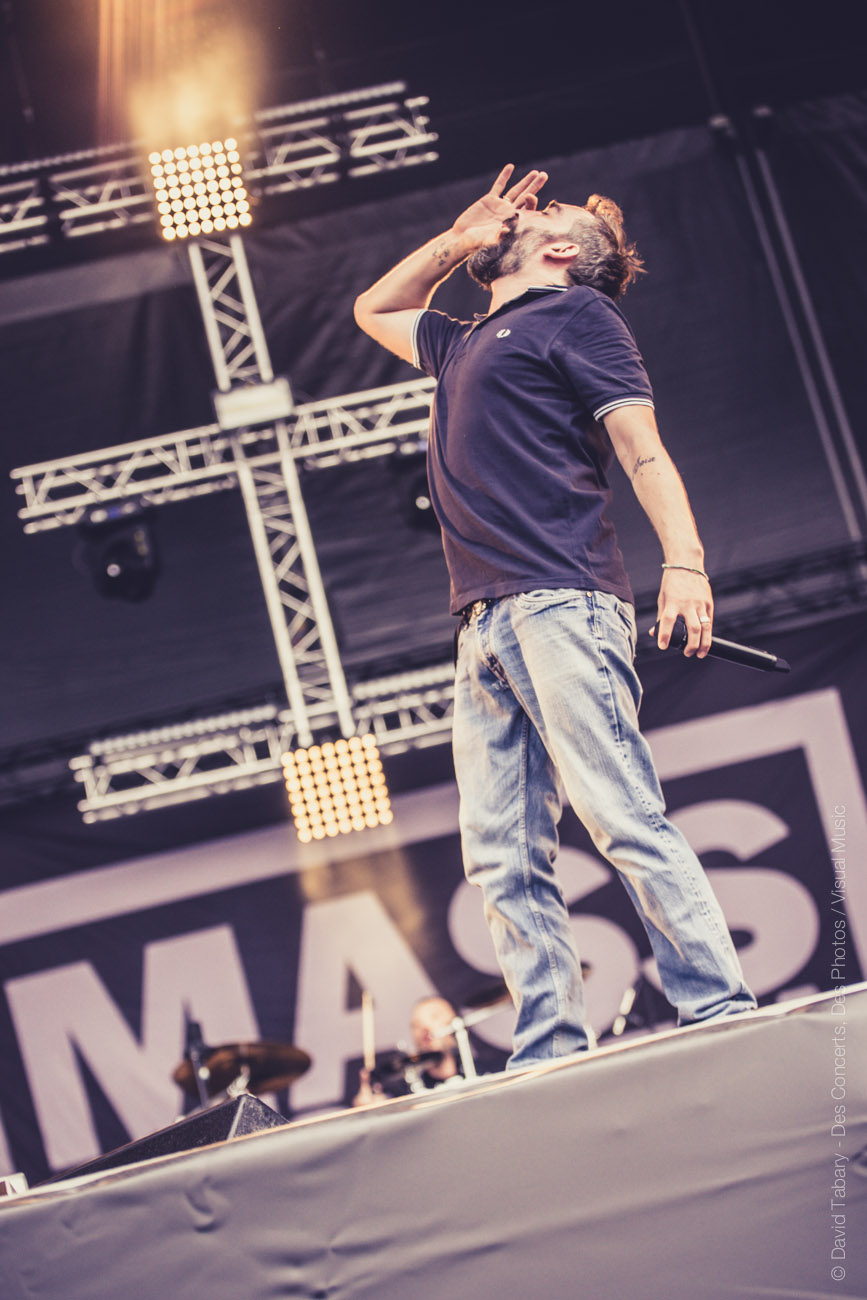 De l’autre côté sur la stage 2, c’est Mass Hysteria qui déverse un torrent d’énergie positive sur la foule. Il semblerait que Mouss Kelai et sa bande aient peu apprécié d’être programmés à 15h et non dans la soirée (« Merci d’être venus si nombreux à l’heure du petit déjeuner », « merci de soutenir la scène française », « on voulait passer à 19h mais ils n’ont pas voulu »). En guise de représailles, le groupe a donc décidé de foutre un énorme bordel devant la scène. Mouss demande au public de tourner, ça slamme de partout, jusqu’à ce que Mouss jète : « on va descendre avec vous au milieu ! » Et lui de se retrouver au milieu du public, entouré de membres de la sécurité. « Tournez tous autour de moi ! » se met-il à crier. Scène incroyable dont il avouera ensuite qu’elle lui a coûté un coup de micro dans les dents. « Mais c’est le jeu ! » Enorme claque que ce concert !