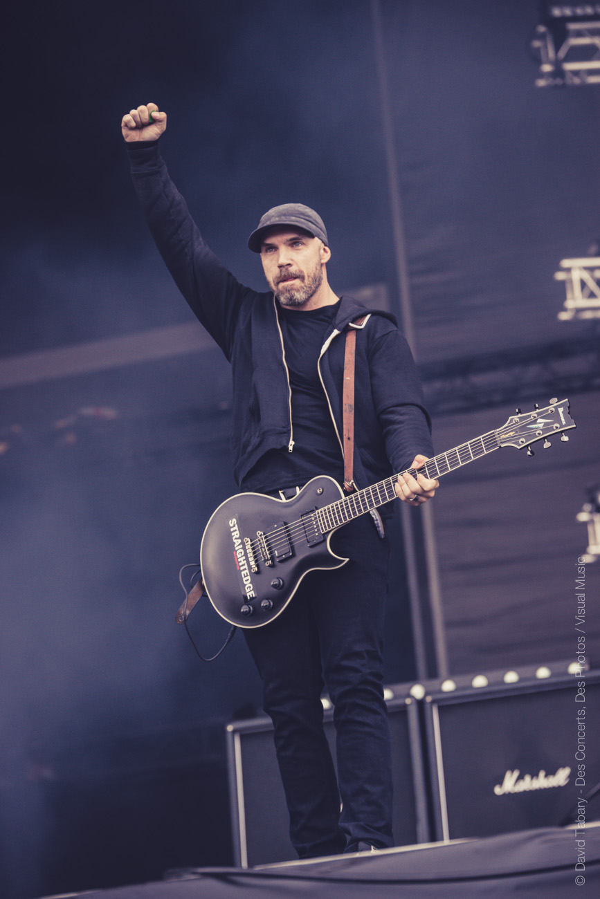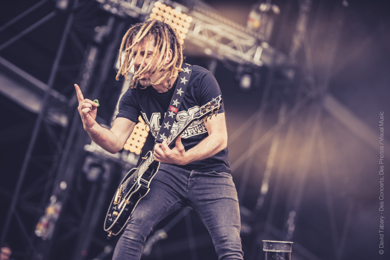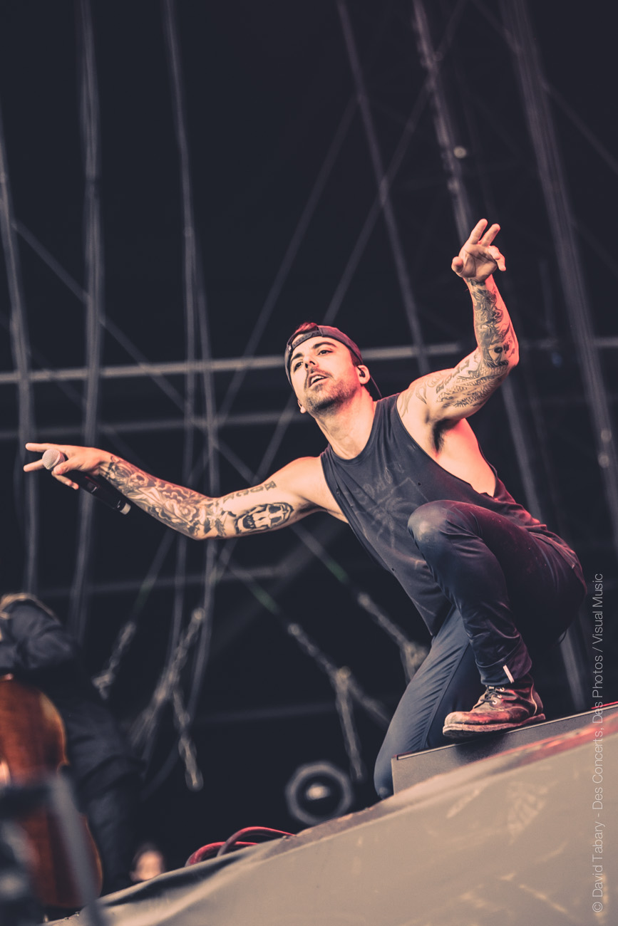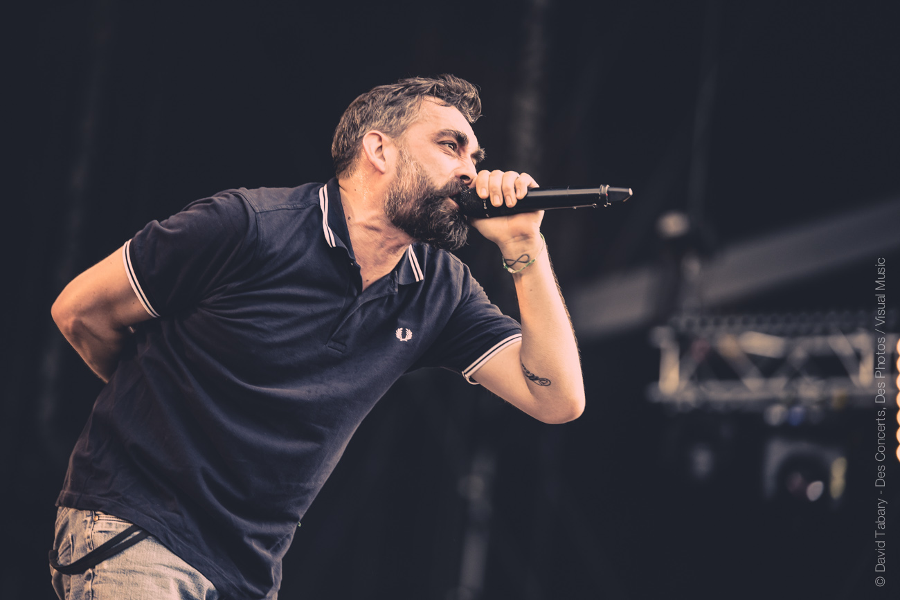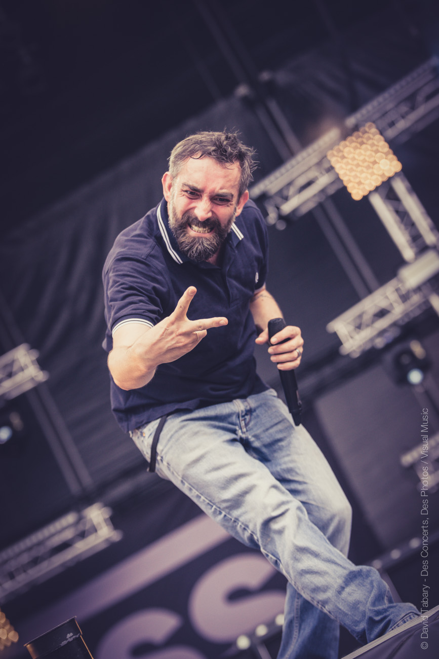 De l’autre côté sur la stage 2, c’est Mass Hysteria qui déverse un torrent d’énergie positive sur la foule. Il semblerait que Mouss Kelai et sa bande aient peu apprécié d’être programmés à 15h et non dans la soirée (« Merci d’être venus si nombreux à l’heure du petit déjeuner », « merci de soutenir la scène française », « on voulait passer à 19h mais ils n’ont pas voulu »). En guise de représailles, le groupe a donc décidé de foutre un énorme bordel devant la scène. Mouss demande au public de tourner, ça slamme de partout, jusqu’à ce que Mouss jète : « on va descendre avec vous au milieu ! » Et lui de se retrouver au milieu du public, entouré de membres de la sécurité. « Tournez tous autour de moi ! » se met-il à crier. Scène incroyable dont il avouera ensuite qu’elle lui a coûté un coup de micro dans les dents. « Mais c’est le jeu ! » Enorme claque que ce concert !