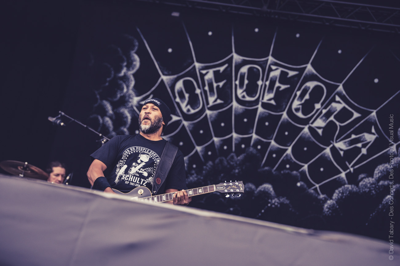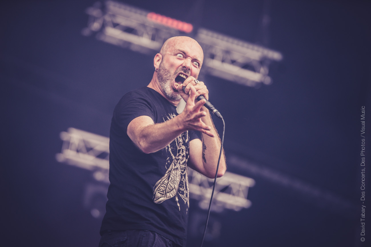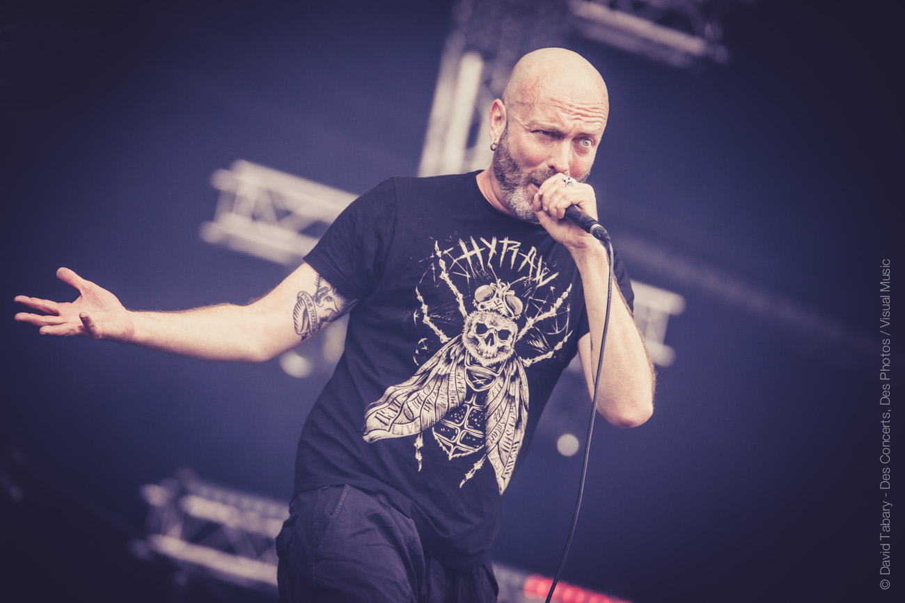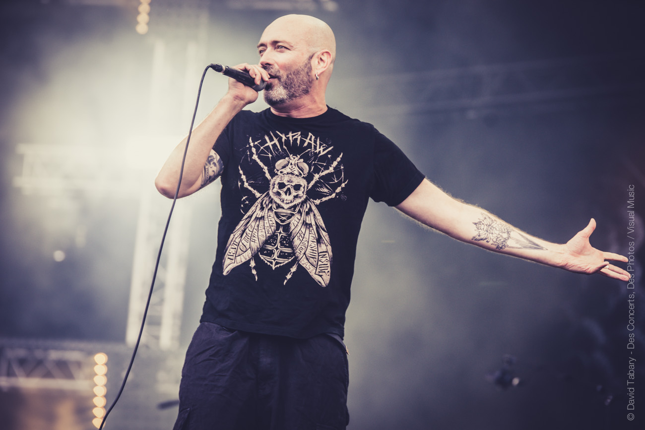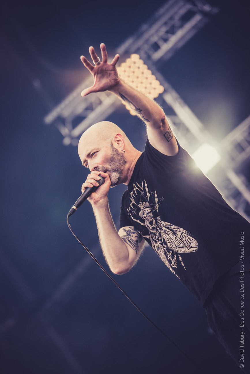 La pluie s’arrête et il est temps de foncer voir Lofofora sur la Stage 2. Comme les cousins de Mass Hysteria la veille, ce sont à ces vieux briscards de la scène française qu’incombe le soin d’ouvrir la journée. Et comme Mass Hysteria, le groupe va s’appuyer sur son expérience de la scène pour tout retourner, le tout en même pas deux titres. En attaquant bille en tête avec « l’oeuf » puis « le fond et la forme », Lofofora aurait presque pu s’arrêter là, personne n’aurait pu y redire. Ce sont pourtant bien 45 minutes de cette énergie et de ces textes engagés que nous offrira le groupe. Les commentaires de Reuno en prime, du genre : « putain ça fait bizarre de jouer face à la Défense, de jouer face à tous ces enculés, ça fout la rage en fait ! On est dimanche, on devrait pas dire de gros mots, mais on s’en braaaaaanle !!! »
