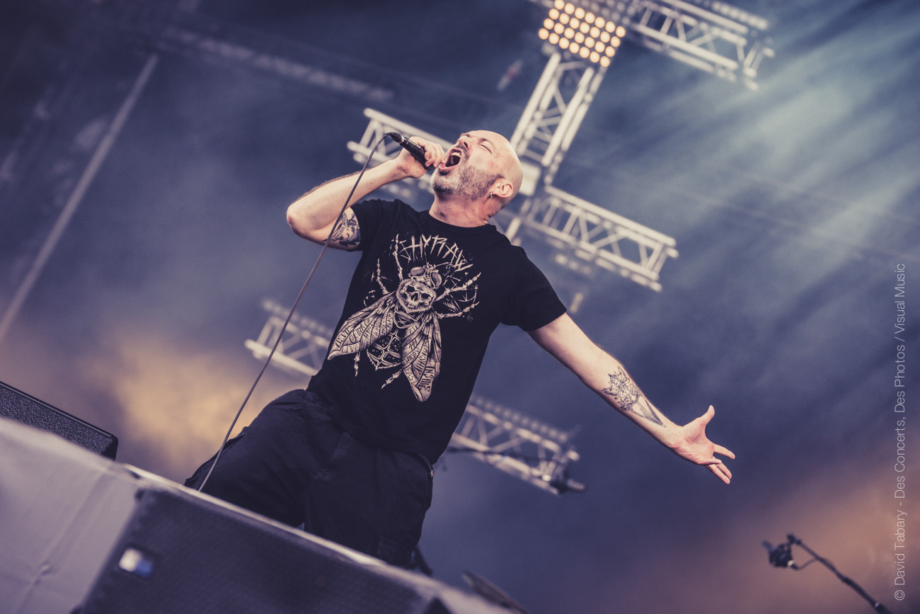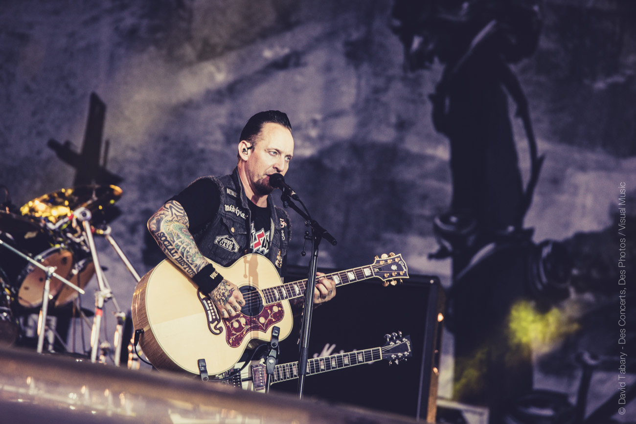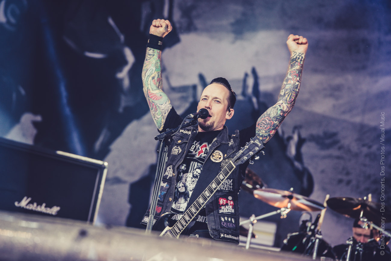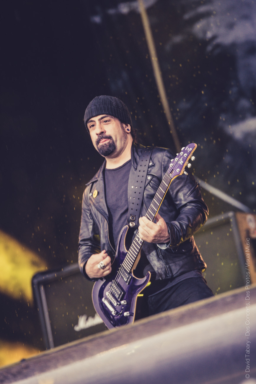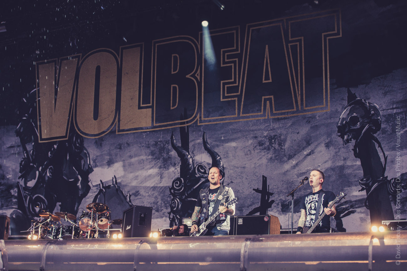 Avec l’arrivée de Volbeat (des Danois cette fois) sur la Main Stage, revoilà la pluie. Normal. Mais cette averse-là est de courte durée et laisse la place au show parfaitement rodé du groupe qui n’a pas cessé de tourner depuis plusieurs années. Marquant le début du concert de quelques reprises dont du Johnny Cash, le cadre est posé, entre metal viril et révérences aux racines du rock américain.