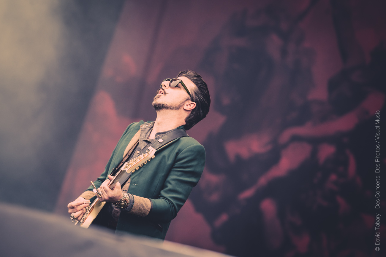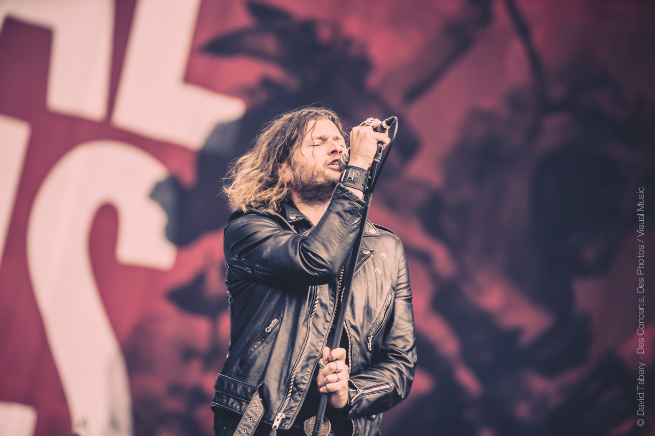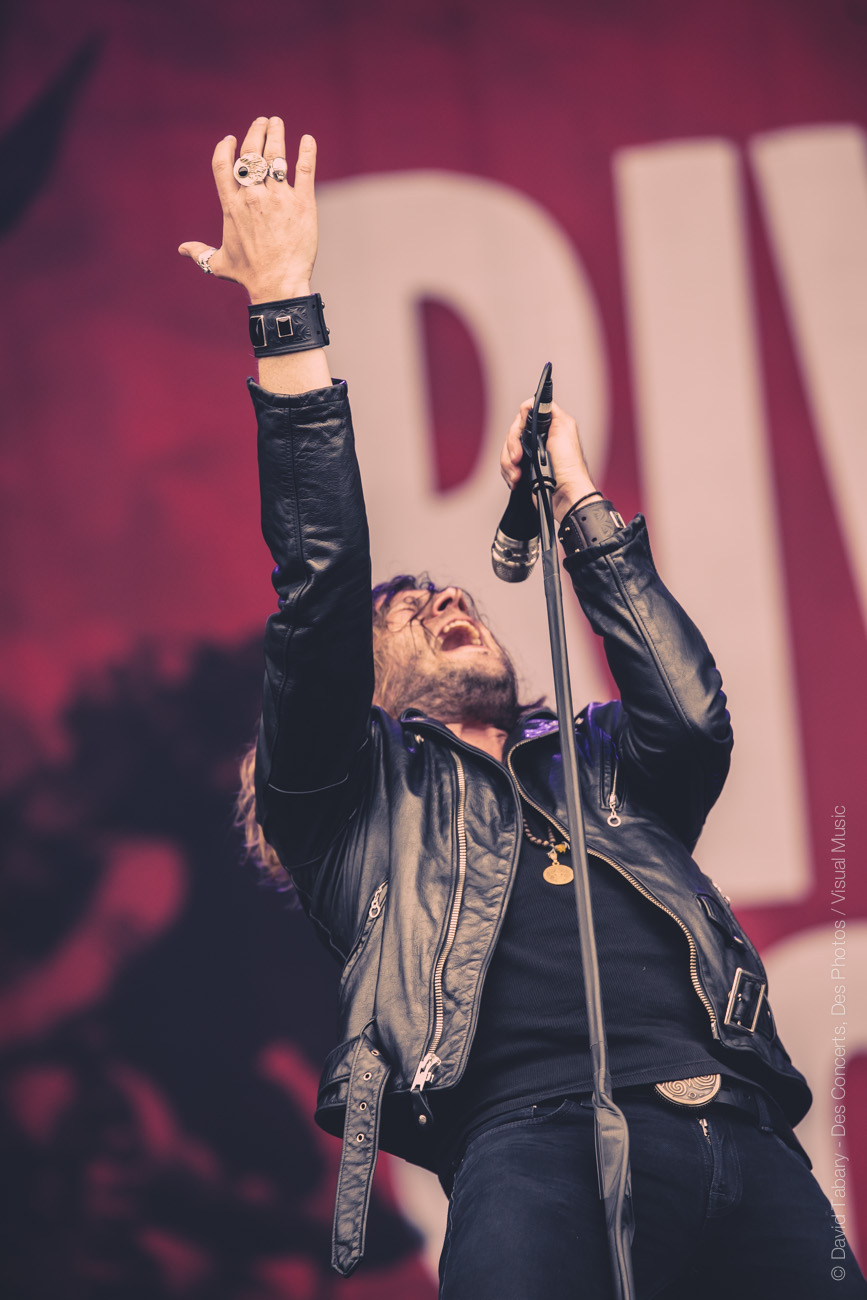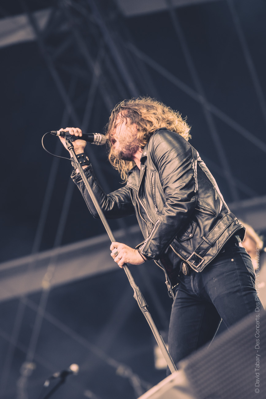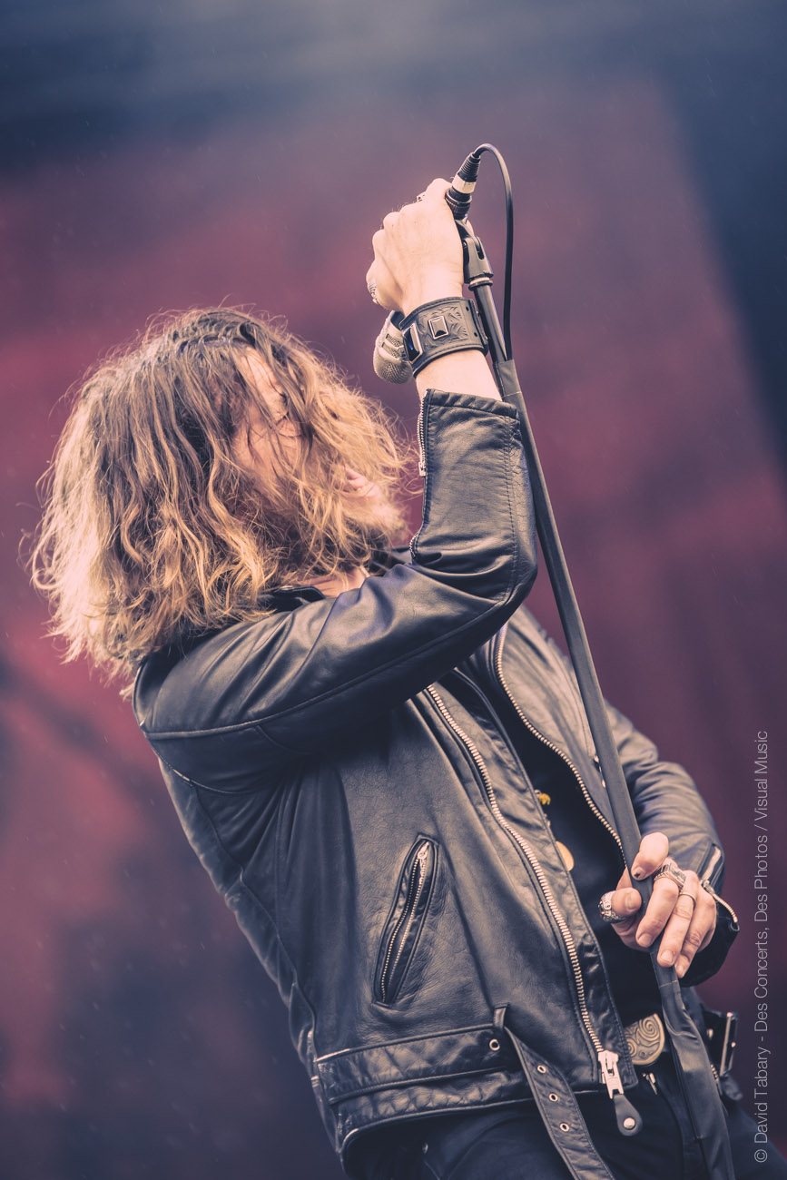 On ne va pas se mentir, cette journée du Download Festival France est jusque-là assez décevante, la météo n’aidant pas beaucoup. On se dirige alors vers la scène d’en face en se disant que si ce n’est pas du metal, peut-être que le salut viendra d’un rock plus classique avec la performance toujours attendue de Rival Sons. La pluie quant à elle a désormais décidé de tomber à chaque début de concert. C’est donc sous une pluie moins forte (mais qui mouille quand même) que Jay Buchanan et sa bande font leur entrée sur scène. Et le moins qu’on puisse dire c’est que Buchanan ne va pas ménager sa peine. Gesticulant, hurlant jusqu’à en devenir violet, l’homme vit toujours autant sa performance. C’est sa voix qui assure le liant entre les anciens morceaux et ceux, plus fades avouons-le, de l’album qui vient tout juste de paraître. On se permettra au passage de chambrer Scott Holiday, le guitariste, trop préoccupé par l’idée de garder son beau costume vert au sec pour sortir du milieu voire du fond scène. Pas très rock ‘n’ roll comme attitude…
