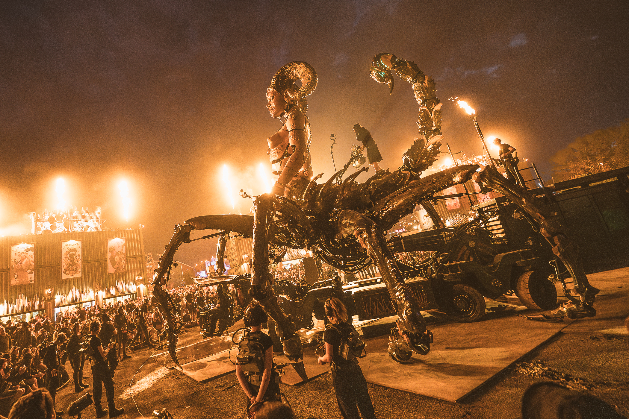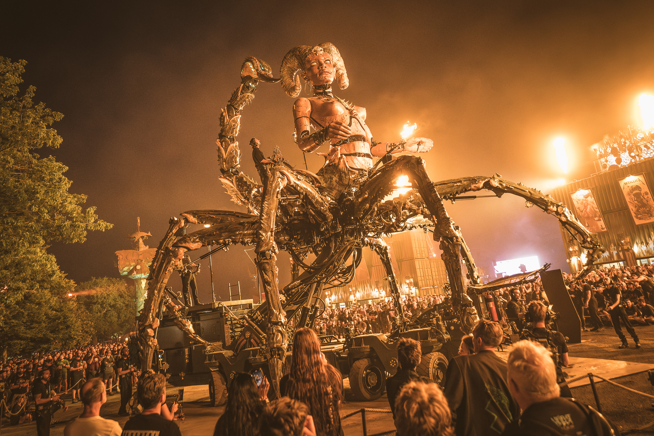 Réalisée par la compagnie La Machine responsable des Machines de l’Île à Nantes, elle rappelle leurs autres créatures et on a pu la voir cette année bouger ses membres, ouvrir les yeux et cracher du feu et de la vapeur. Initialement pensée pour « garder » l’entrée du festival dans le cadre d’un grand projet de parc pour le moment mis en pause, on l’a retrouvéer à l’emplacement de ce qu’on appelait auparavant « la place du feu ». Aussi impressionnante que les autres machines de Nantes, l’effet est réussi. On espère juste la voir passer devant la Valley la prochaine fois qu’Orange Goblin jouera au Hellfest, et récupérer le feu pour pouvoir de nouveau sécher et se réchauffer les soirs où la pluie nous a rincés.
