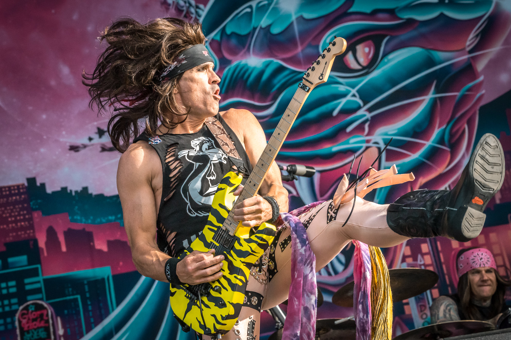 Parodie ou relecture premier degré de Motley Crue, les Steel Panther ont leurs habitudes au Hellfest puisqu’il s’agit de leur quatrième venue en 12 ans, dont la dernière fois en 2022. Vannes vaseuses, graveleuses, misogynes et racistes au menu : on se demande comment ce set peut exister mais cela semble quand même marcher. Il faut reconnaître que ce hard rock FM de beauf est efficace et que le ‘’Wall of Nichons’’ en fin de show a su engager plus d’une centaine de supportrices sur scène. Allez savoir si la blague est à nos dépends mais même si le sourire est souvent jaune et gêné, on n’aura pas passé un mauvais moment devant ces panthères métalliques.