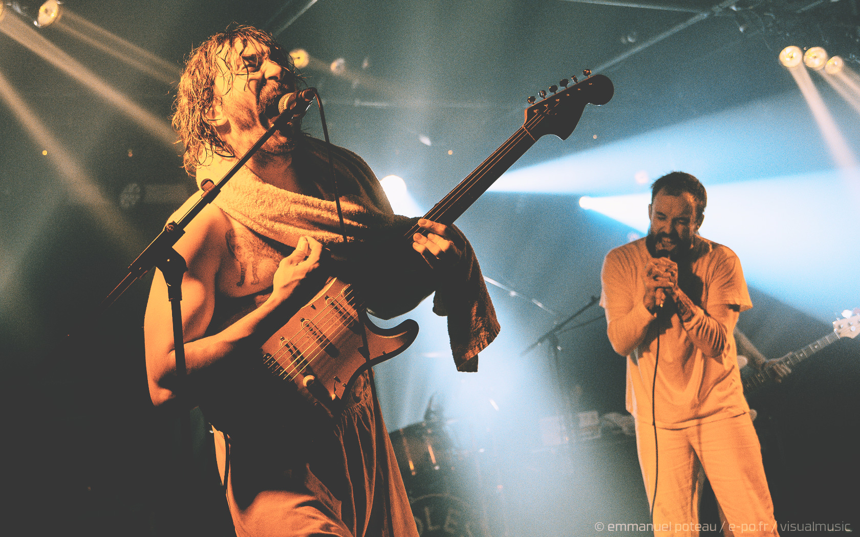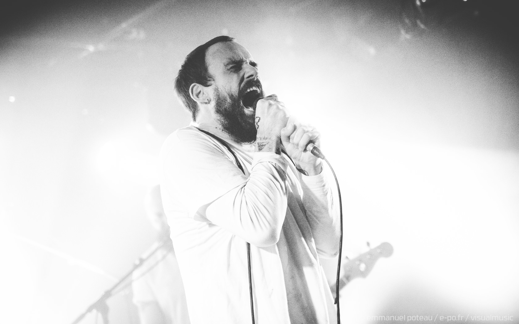 Difficile de ne pas déceler ce subtil mariage de puissance punk et d’ironie propre aux anglais, ainsi on ne s’étonne pas de les voir reprendre « All I Want For Christmas Is You » en mode bisounours pour mieux nous reprendre de volée avec un subtil mélange de bordel musical tout en contrôle, qui ne faillit jamais et finit de mettre le public dans les cordes, qui en redemande, mais ne plie pas ! Pas question ! Pas maintenant ! Se relever encore et encore pour épuiser la soirée, les musiciens n’hésitent pas même à venir au corps à corps, se jetant ainsi dans le public pour jouer de la gratte ou encore organiser un sitting. On ne pourra pas reprocher au groupe de ne pas communiquer, remerciant le public de sa présence, lâchant parfois même des mots en français, mais toujours doté d’une conviction sans faille, regardant le public les yeux dans les yeux, Talbot enchaine les uppercuts vocaux, soutenus par une pluie de riffs assénés en crochets du droit par Lee Kiernan (second gratteux) et Adam Devonshire (à la basse) quand Bowen nous reprend en crochet du gauche, on ne sait plus où donner de la tête, la batterie de Jon Beavis, venue du fond de scène finissant de nous achever. Les guitares se croisent, s’enchevêtrent, se bousculent mais derrière ce chaos, une approche méthodique, concentrée et faussement nonchalante.