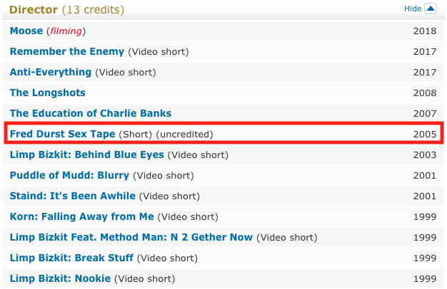 Pour vous replacer dans le contexte, notre Fred Durst intergalactique a une filmographie composée majoritairement de clips et courts-métrages, mais aussi d’un long métrage nommé « The Longshots » avec Ice Cube, sorti en 2008. Mais pas que(ue). On vous laisse savourer la filmographie de notre ancienne tête de turc préférée sur IMDb :