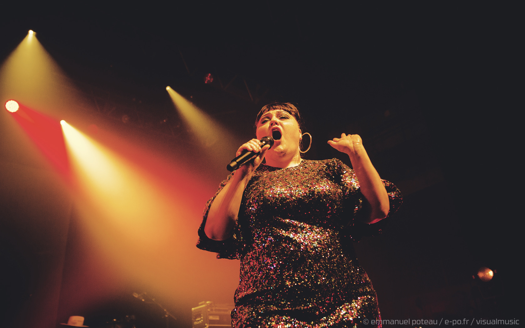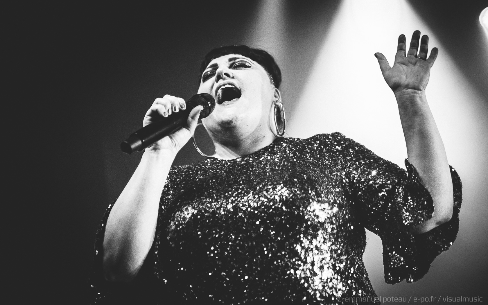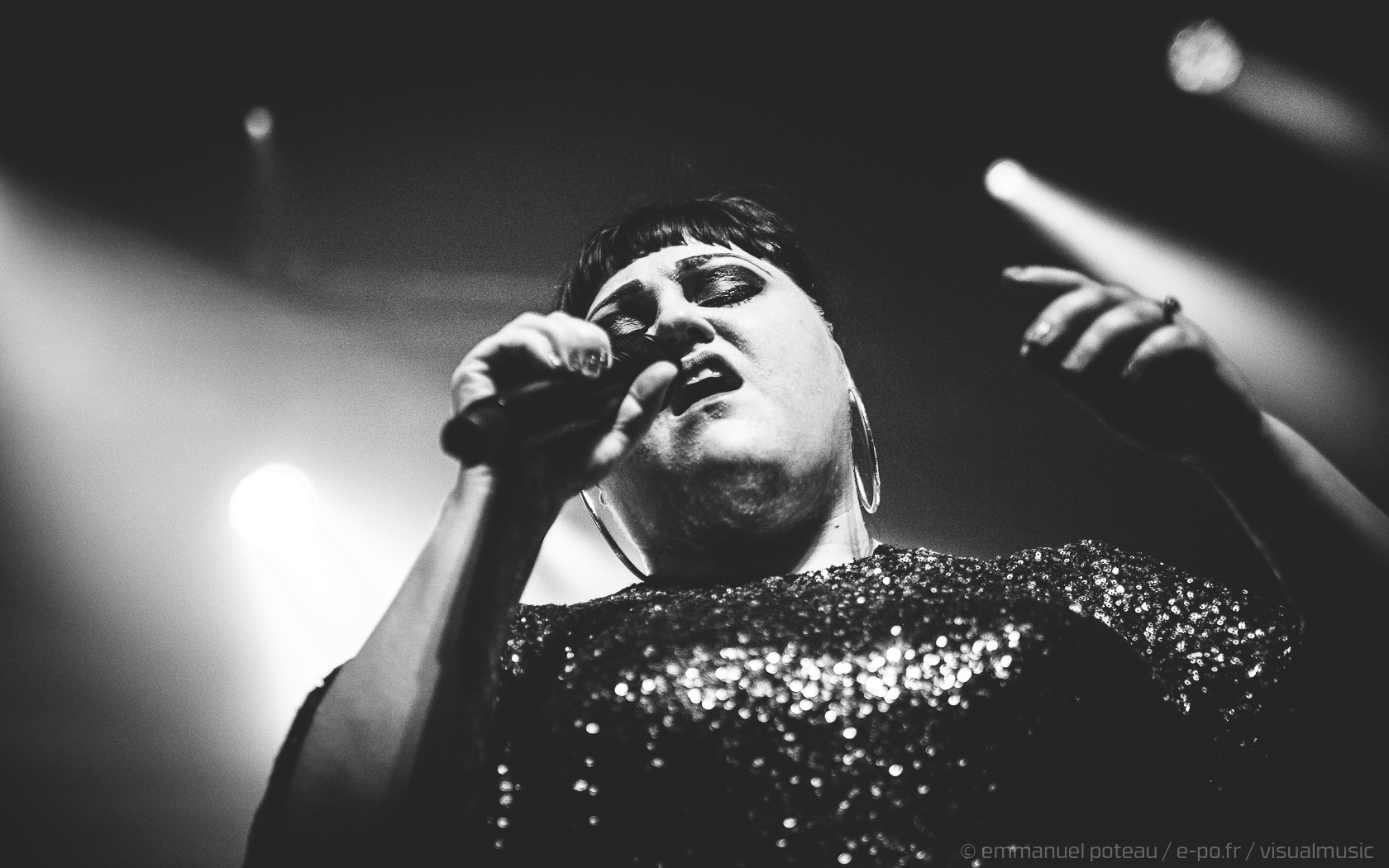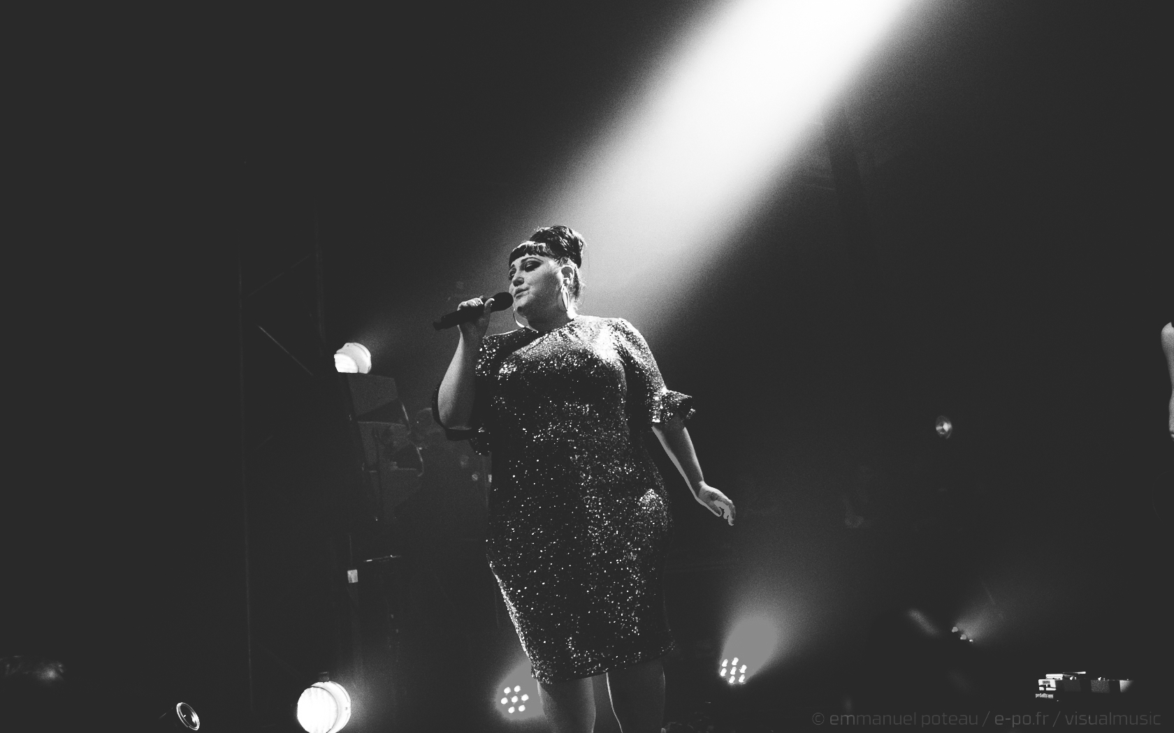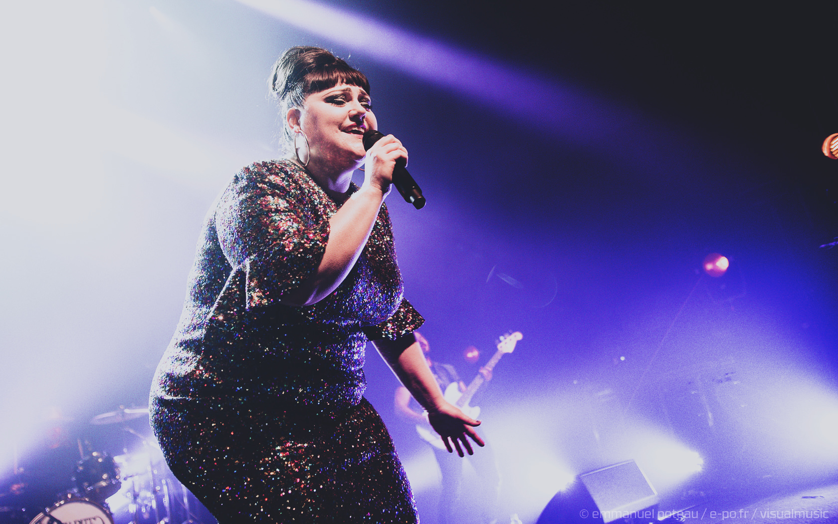On apprendra que ce jour-là, qui est aussi la dernière date française de Beth, que le concert allait être enregistré (et donc visible à cette adresse pour les amateurs). Télévision oblige, l’horaire sera bien respecté suite à la première partie d’Annabel Allum sans fioriture mais aussi sans éclat qui nous aura été proposé. Beth arrive donc sur scène habillée d’une saillante robe à facettes et chignon impeccable, on croirait voir arriver sur scène l’une de ces chanteuses à voix des années 60. On doute peu des compétences de Beth dans ce registre, tant chacun aura eu l’occasion d’apprécier en live ou en vidéo celles-ci dans ses années passées. En tout cas, la chanteuse va se montrer très affable toute la soirée que ce soit avec les photographes qu’elle saluera lors de notre départ de la fosse ou plus encore avec son public, car il m’aura rarement été donné l’occasion de voir quelqu’un arpenter le tout devant la scène de l’Aéro à ce point ! C’est simple, Beth semble tellement décidée à se donner au public qu’on en viendrait presque à craindre une chute pour celle qui squatte littéralement le bord du bord de la scène ! Elle salue, elle sourit à ses fans, quitte à trop s’approcher d’une enceinte et engendrer un larsen, c’est dire à quel point on l’imagine prête à donner son concert depuis le public !