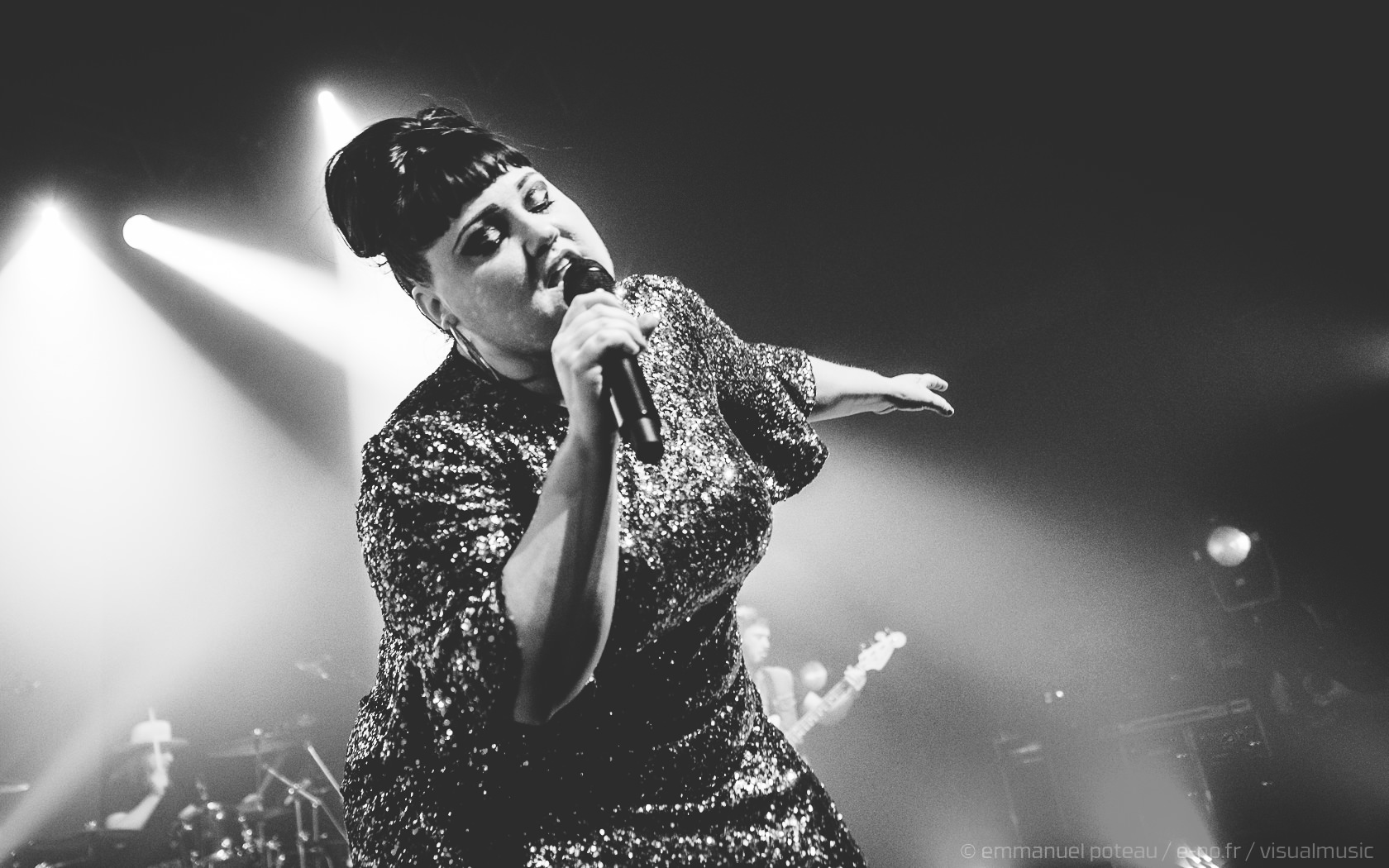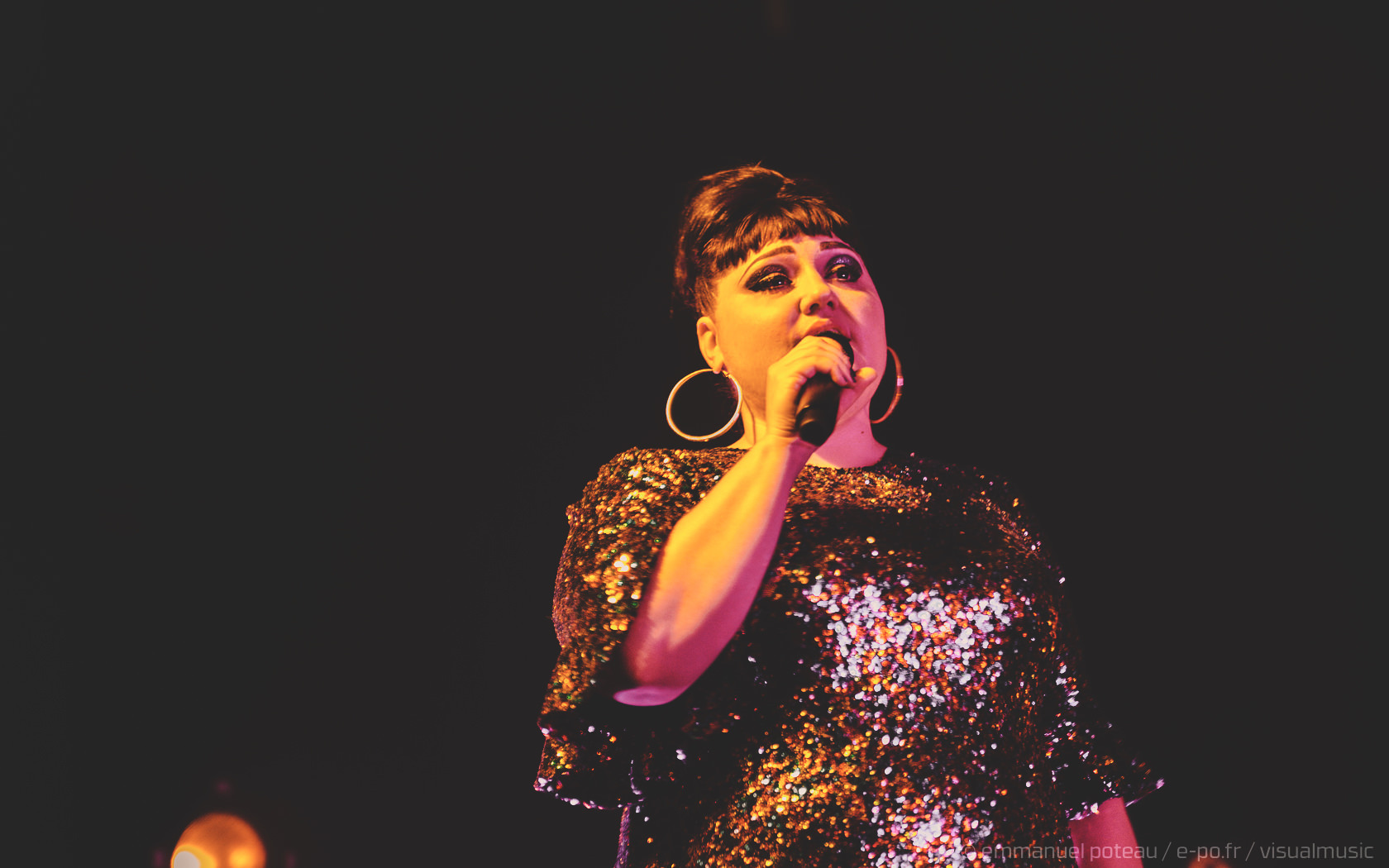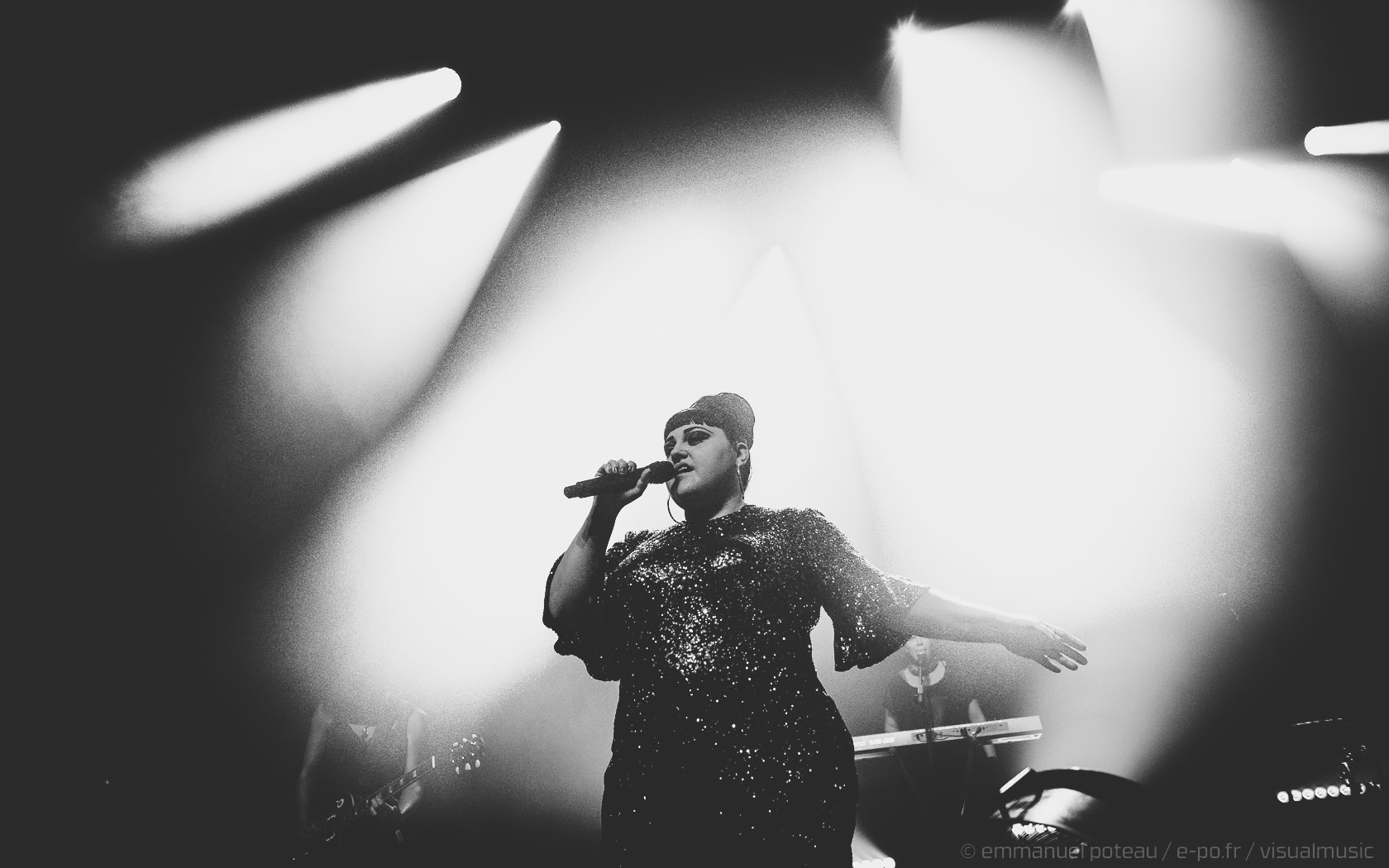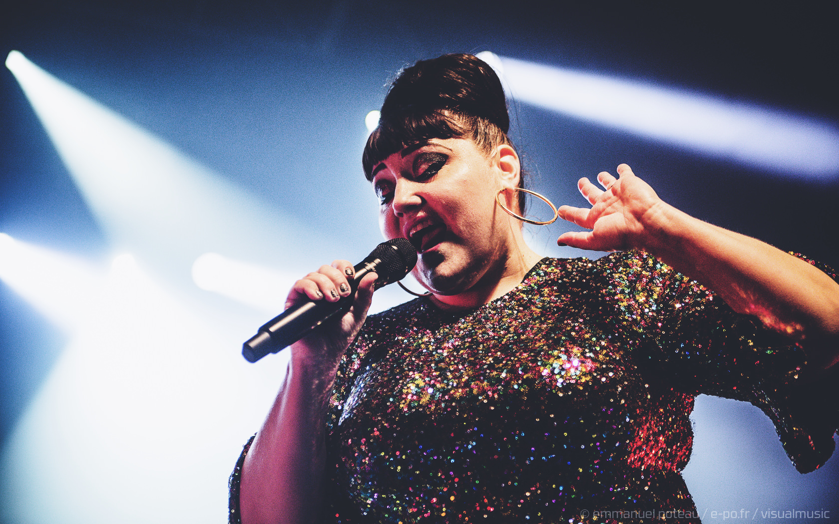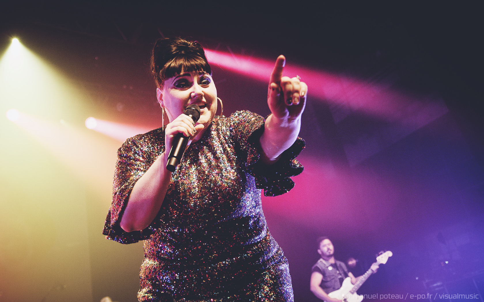 On apprendra que ce jour-là, qui est aussi la dernière date française de Beth, que le concert allait être enregistré (et donc visible à cette adresse pour les amateurs). Télévision oblige, l’horaire sera bien respecté suite à la première partie d’Annabel Allum sans fioriture mais aussi sans éclat qui nous aura été proposé. Beth arrive donc sur scène habillée d’une saillante robe à facettes et chignon impeccable, on croirait voir arriver sur scène l’une de ces chanteuses à voix des années 60. On doute peu des compétences de Beth dans ce registre, tant chacun aura eu l’occasion d’apprécier en live ou en vidéo celles-ci dans ses années passées. En tout cas, la chanteuse va se montrer très affable toute la soirée que ce soit avec les photographes qu’elle saluera lors de notre départ de la fosse ou plus encore avec son public, car il m’aura rarement été donné l’occasion de voir quelqu’un arpenter le tout devant la scène de l’Aéro à ce point ! C’est simple, Beth semble tellement décidée à se donner au public qu’on en viendrait presque à craindre une chute pour celle qui squatte littéralement le bord du bord de la scène ! Elle salue, elle sourit à ses fans, quitte à trop s’approcher d’une enceinte et engendrer un larsen, c’est dire à quel point on l’imagine prête à donner son concert depuis le public !