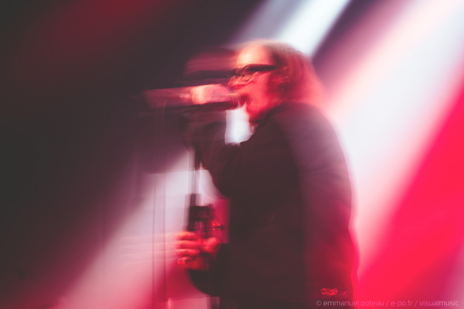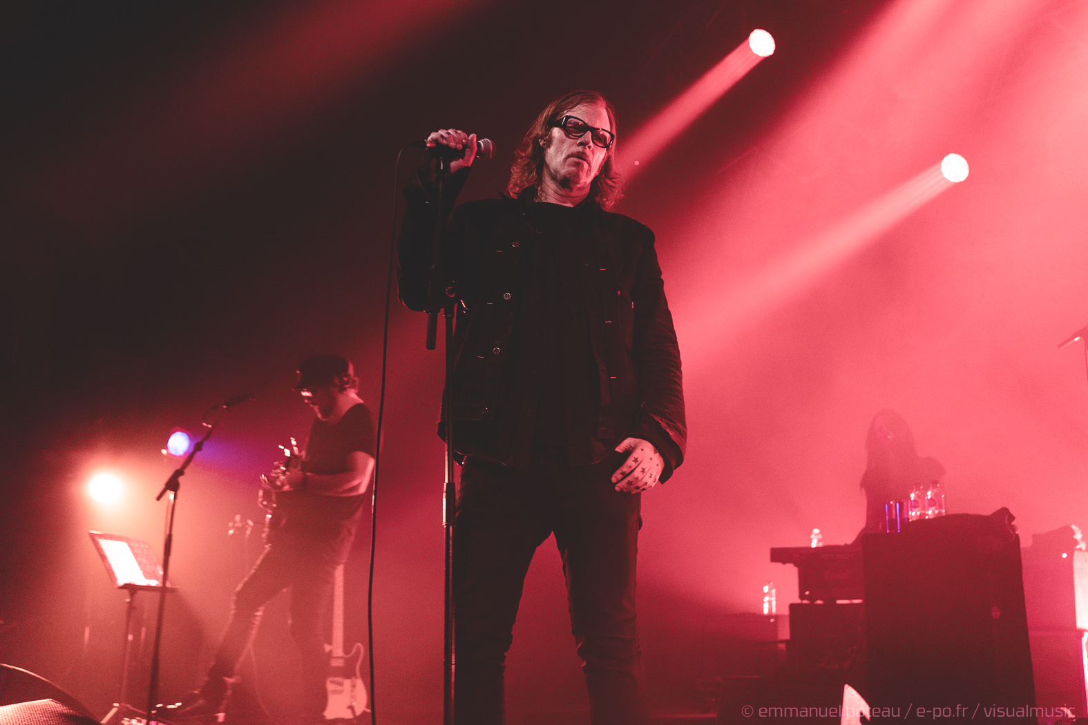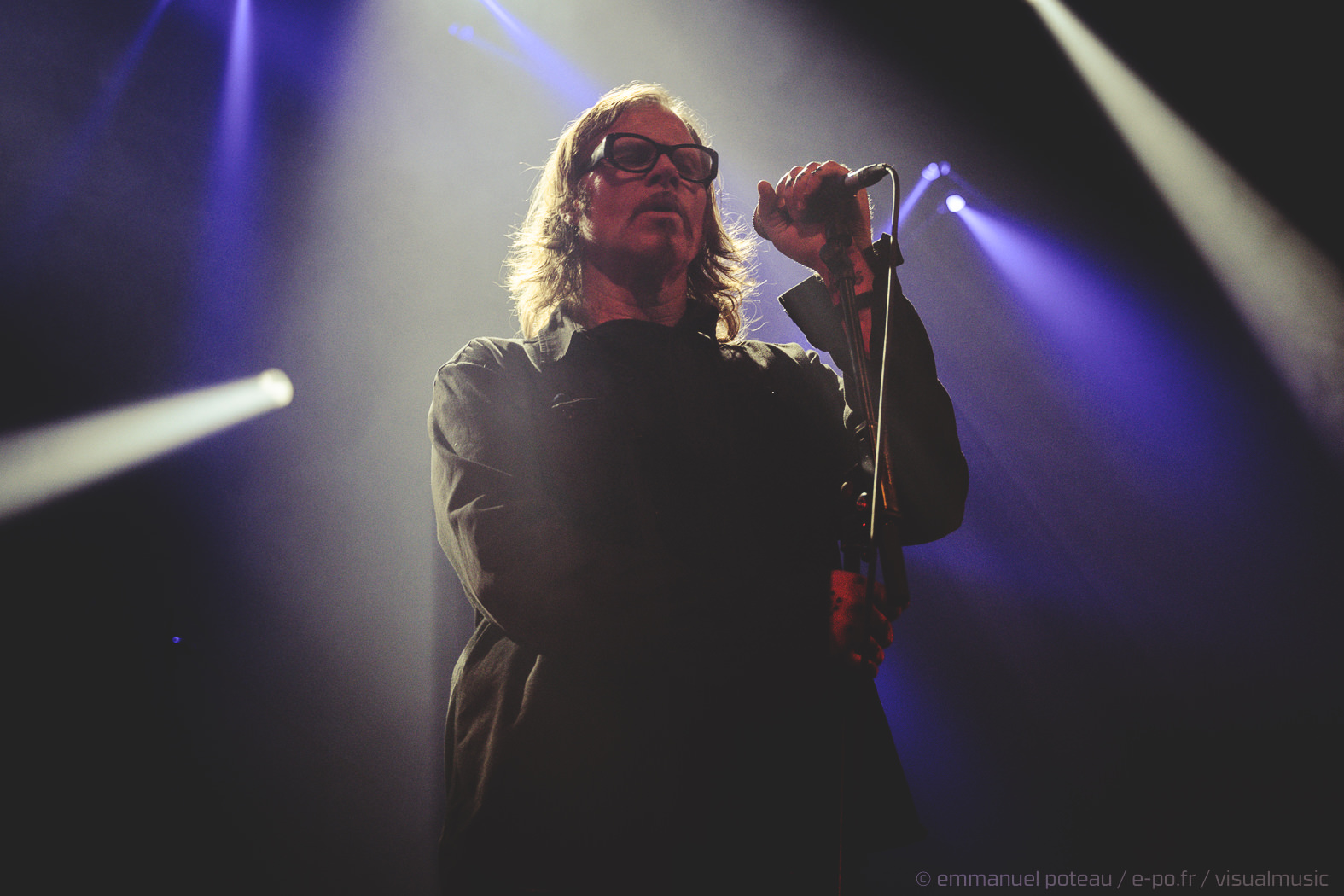 Soit ! On sort alors les cotillons, on gonfle les ballons, la fête est lancée. C’est ce que l’on a cru car si Mark aime faire l’andouille dans un clip, sur scène, il aime surtout se fondre dans le décor car c’est un roc, une muraille impassible à vous faire pleurer un clown d’anniversaire. S’il pouvait jouer toutes lumières éteintes, je pense qu’il le ferait. On ne va pas lui nier ce droit, Maynard James Keenan cultivant lui-même ce type de prestation scénique. Mais si ce second propose aussi un show, le premier n’en fait rien et d’entendre dans le public « quand même Mark Lanegan, c’est le seul artiste qui semble se faire chier à ses concerts ». Et ce n’est pas la bande de fans remontés comme un vendredi soir (on est mercredi) qui le déridera. Le concert semble donc mené pied au plancher mais le souci des vieilles muscle cars, c’est qu’il faut parfois savoir repérer les bons millésimes et malheureusement, Lanegan va tout de même décevoir car le dernier millésime musical n’est pas forcément son plus réussi. Sa discographie étant assez éclectique, cela peut aboutir à un show assez inégal, les compos électro que semblent kiffer le grand frontman ne sont pas, à mon humble avis, ses meilleures compositions (« Dark Disco Jeg », « Ode To Sad Disco » et leurs rythmiques passéistes qui lui font pourtant, FOLIE, taper du pied).