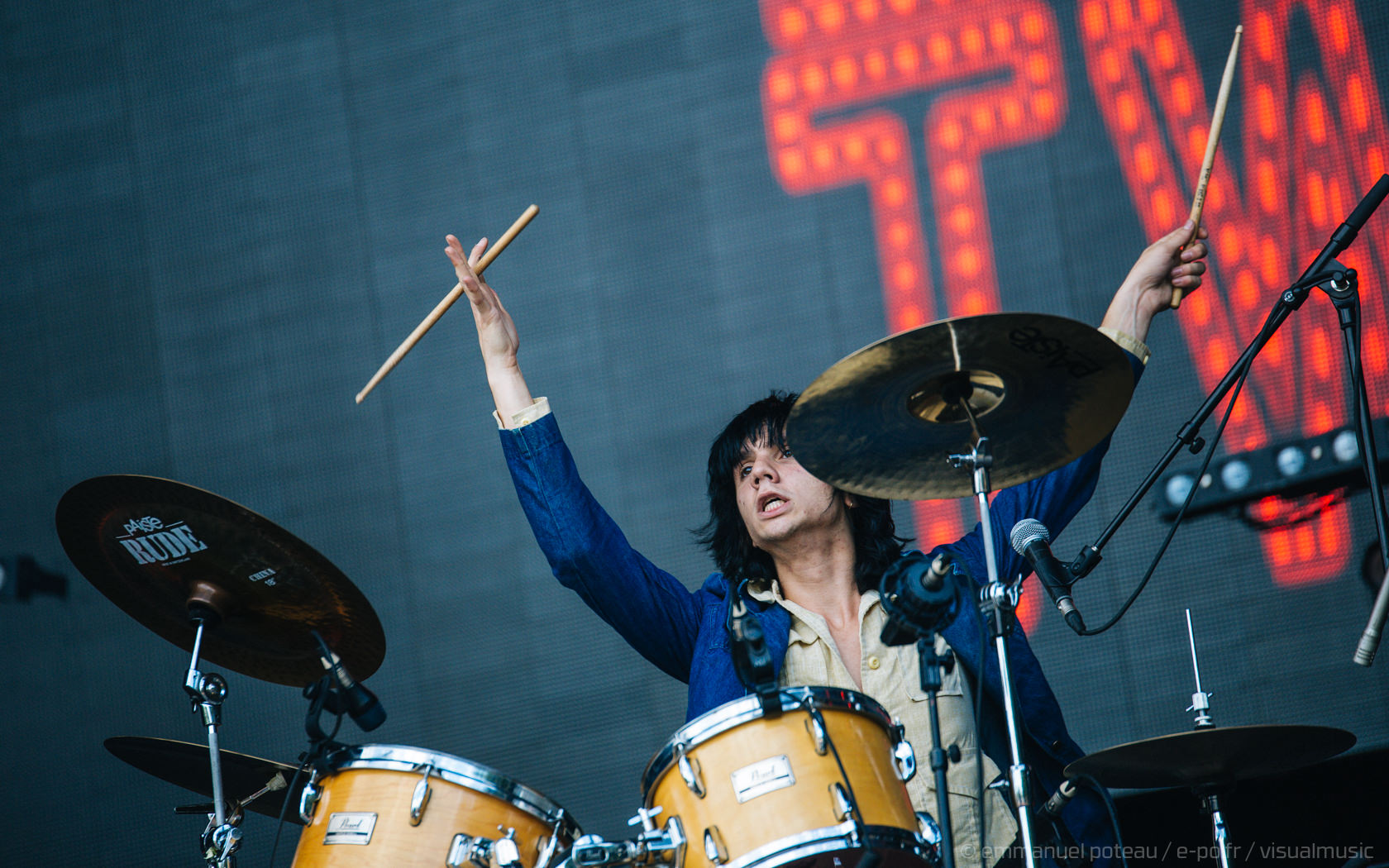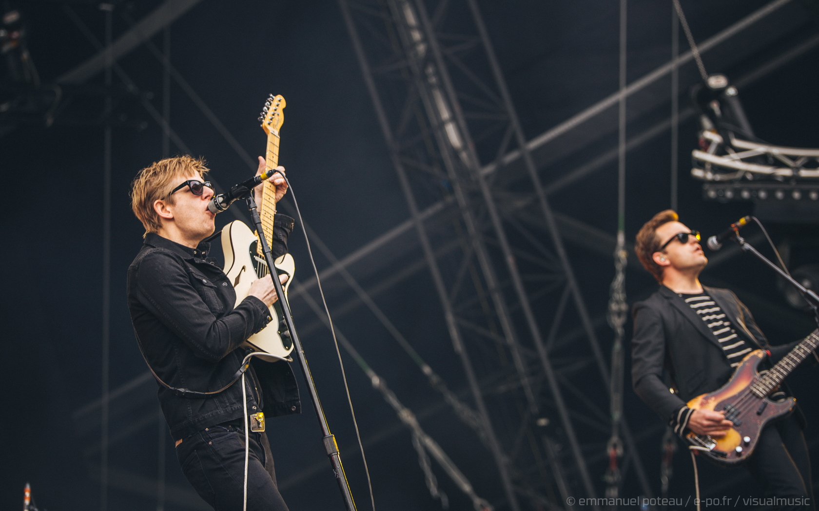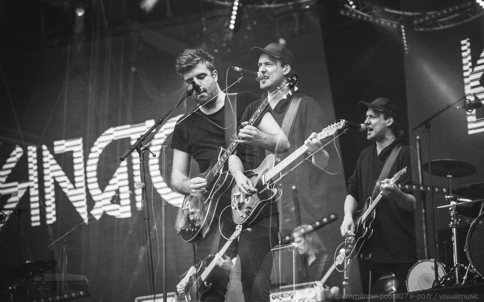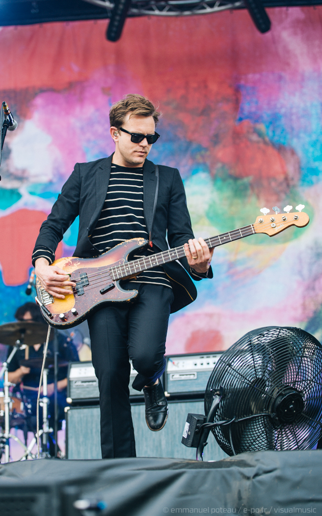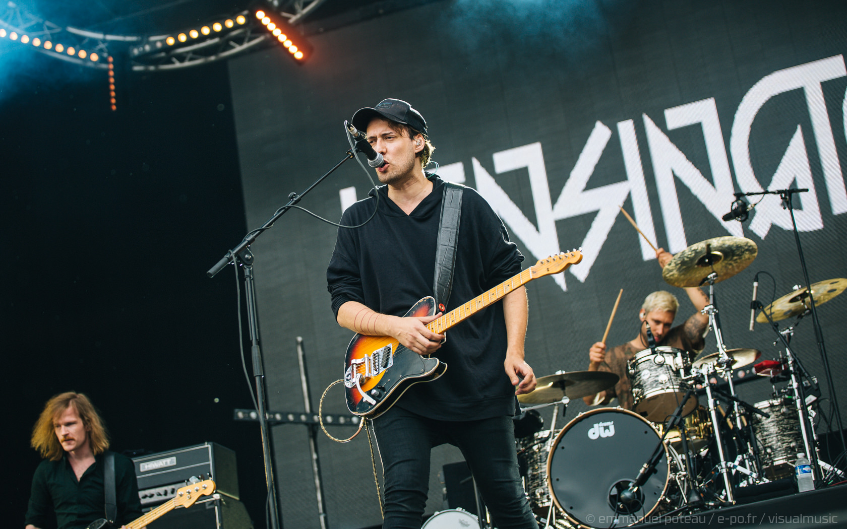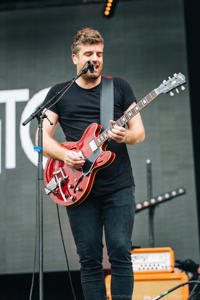 Comme d’habitude, je ne pouvais arriver trop tôt et n’ai donc pu profiter des sets des lillois Vertigo (coucou Sylvain) ou encore Highly Suspect. Non, j’arrive en fait pour le set de Kensington, que l’app du festival nous annonce qualifié de « relève de l’indie rock européen ». Gasp ! Ha oui, comparé aussi à Coldplay et Muse. Bon, là on sent qu’on se fait balader et sur scène, je ne peux pas dire que le groupe m’aura enflammé, pas plus que le public, je pense. Un groupe pour démarrer la journée.