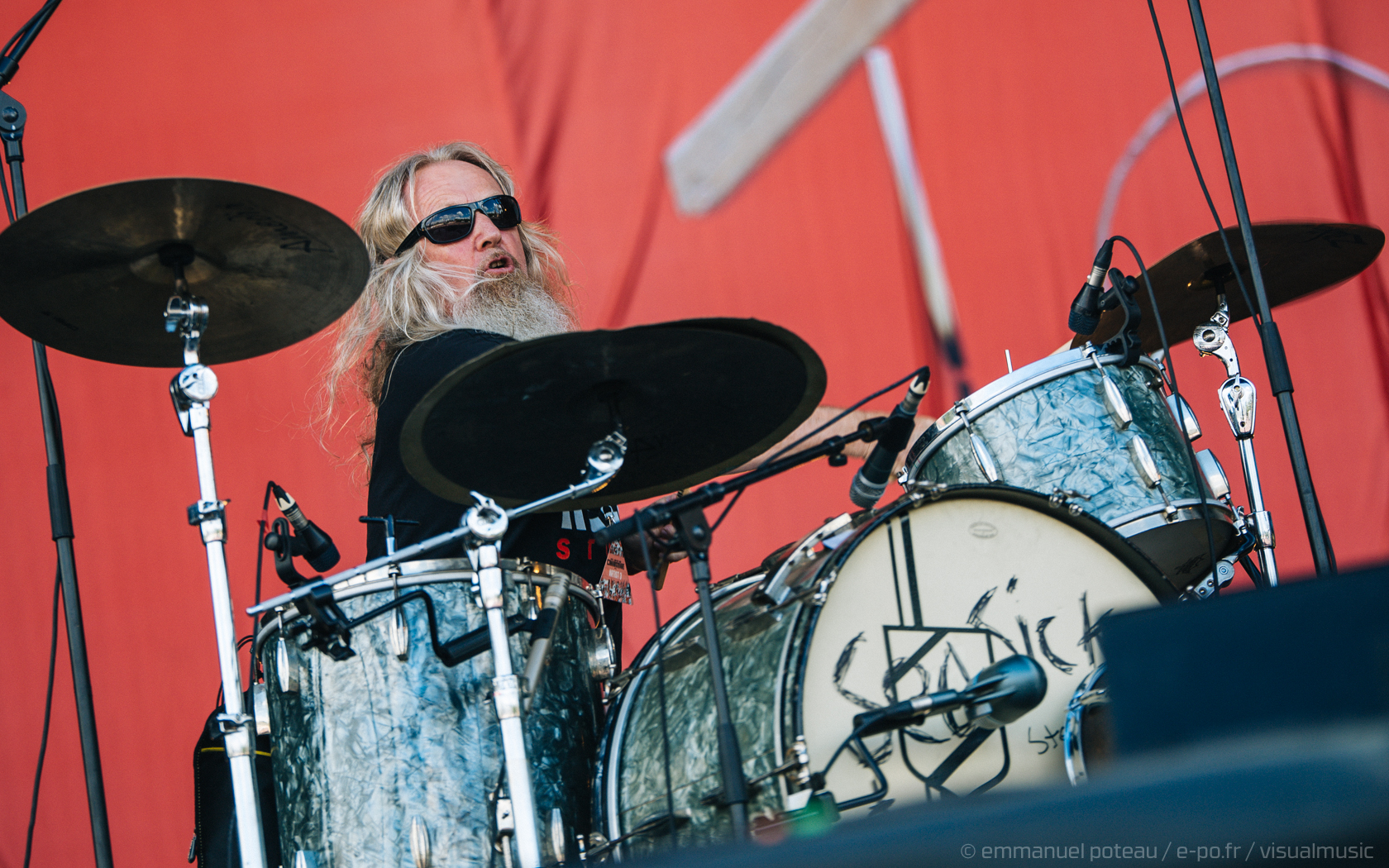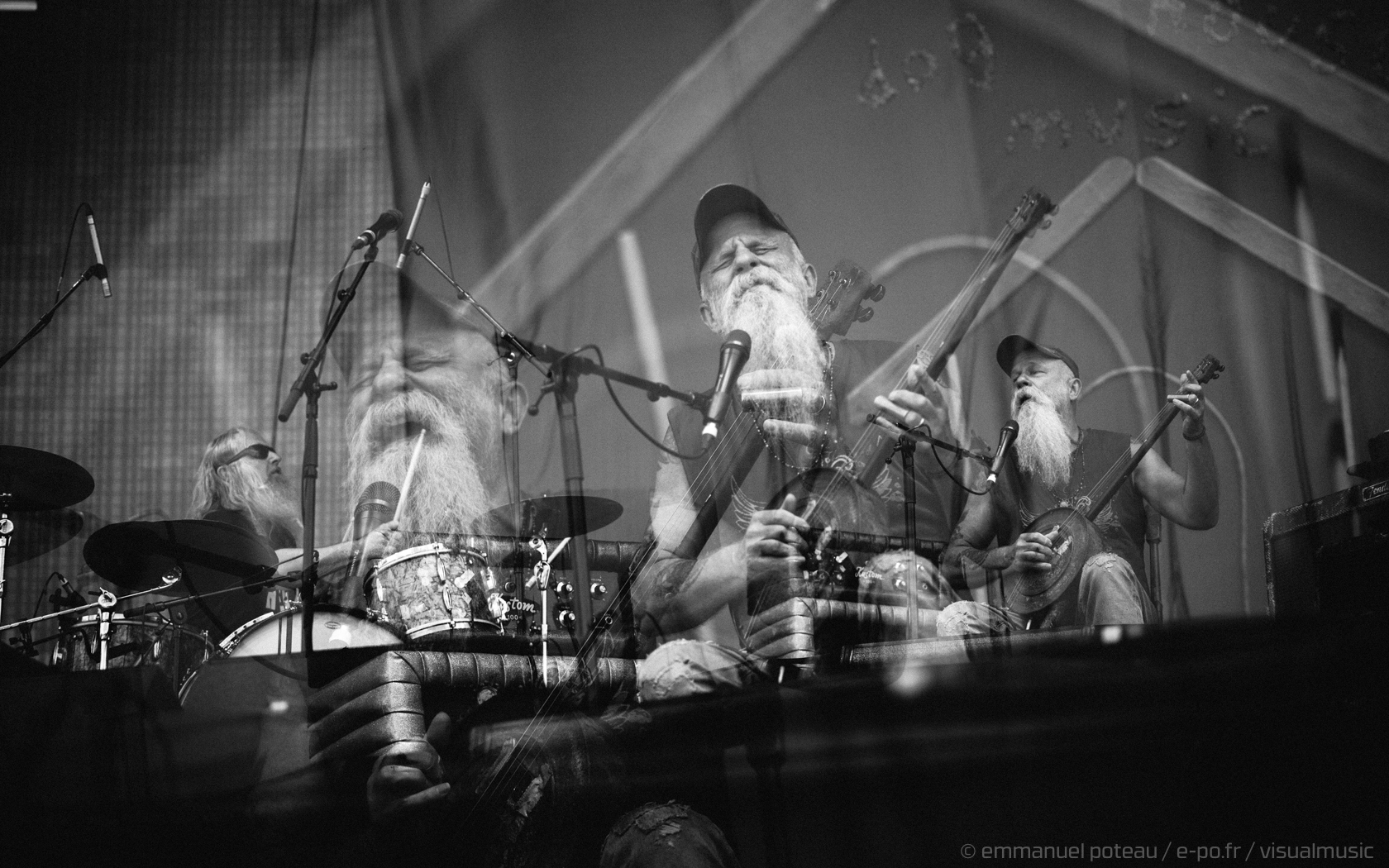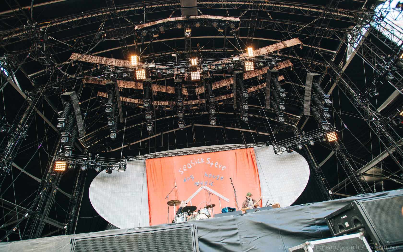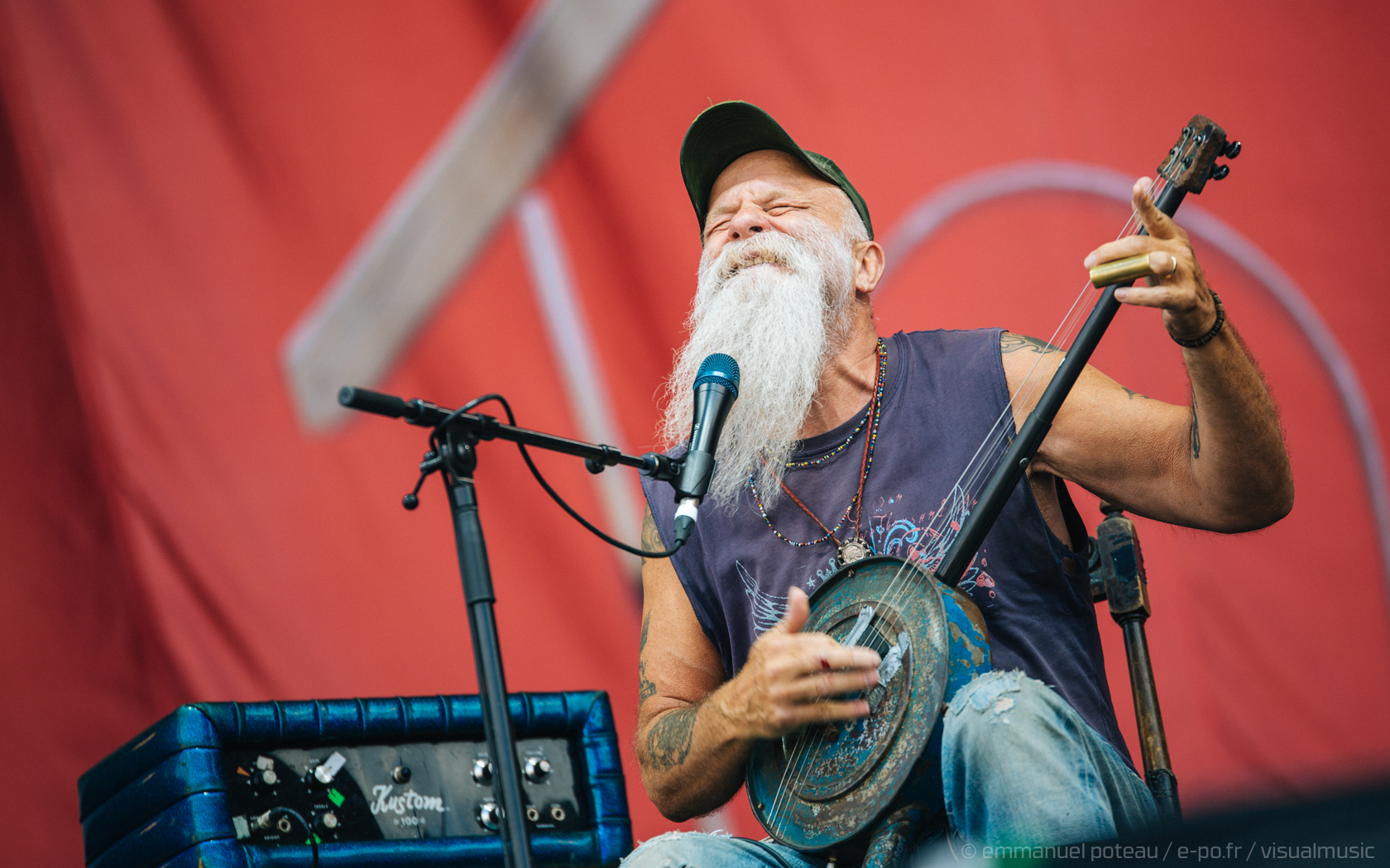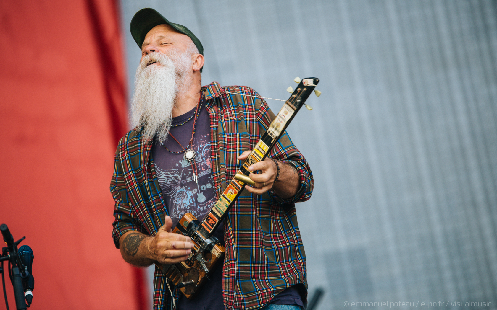 Dimanche, j’arrive toute impatiente de voir LE CONCERT que j’attendais au Main Square (qui l’eût cru), Seasick Steve. 76 balais, une barbe de bûcheron blanche et un marcel bien large et bariolé, c’est un vrai bluesman américain que l’on attend là. Juste accompagné d’un batteur bien costaud, il nous livre un set blues, boogie, rock, qui nous emporte avec sa voix rauque et chaude : on se sentirait presque au milieu du désert californien… Entre deux morceaux, Steve nous présente les guitares ( à quatre cordes ! ) sur lesquelles il joue et qu’il a bricolées lui-même ! Et Dieu qu’elles sonnent la musique brute, authentique.