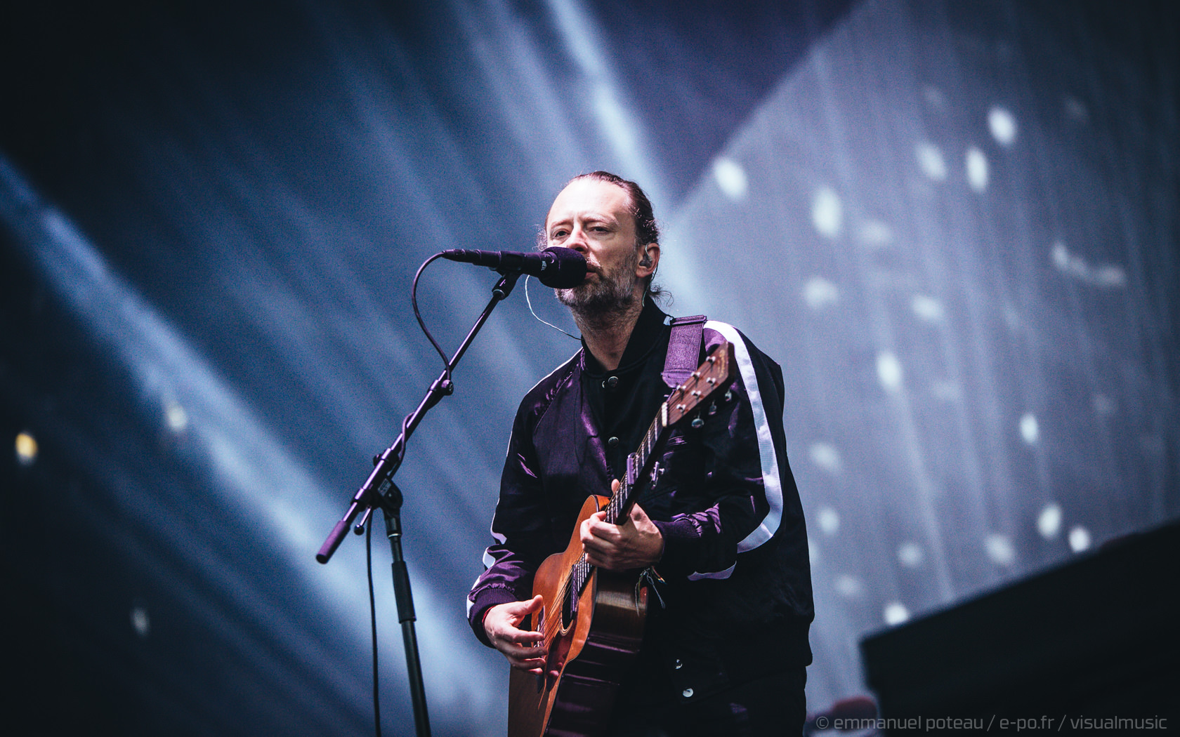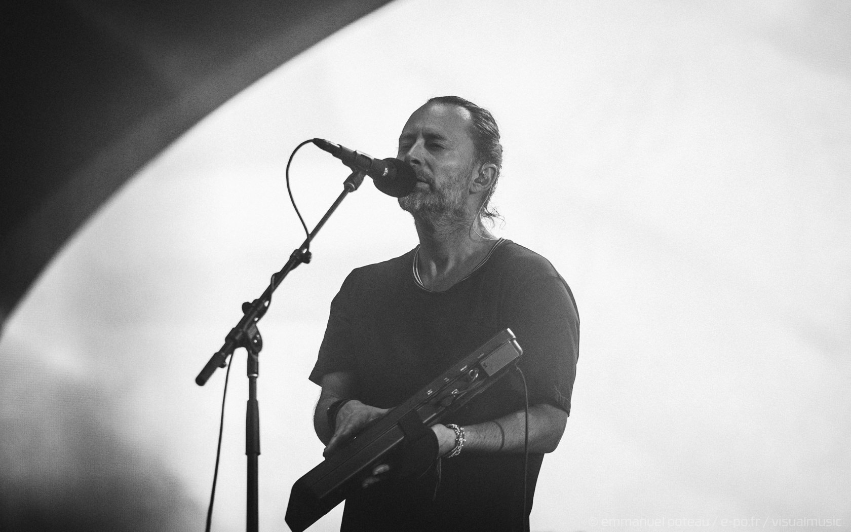 Soyons clairs, Thylacine sur la Green Room, c’était injouable, à l’autre bout de l’espace presse, j’ai décidé de faire un break repas qui n’aura pas lieu car blindé de monde, tant pis ! Ce soir, j’ai l’estomac un peu serré, j’ai la chance de faire partie des rares photographes retenus pour immortaliser le passage de Thom et sa bande. Il est 21h45 quand le légendaire groupe anglais entre sur scène. Si le temps de 3 morceaux, je n’ai pas vraiment pu prendre de recul sur le début du concert, deux personnages attirent indubitablement le regard, Thom bien sûr mais aussi Jonny Greenwood muré dans sa musique et que l’on apercevra très rarement entre deux mèches de son imposante chevelure. Malheureusement, je dis apercevoir car une fois revenu dans le public, un point me semble problématique, les écrans géants du festival ne diffusent pas une retransmission même du concert mais des effets visuels mêlés tant bien que mal aux images des musiciens mêmes. Autant dire que les personnes qui n’auront pas joué des coudes pour se positionner n’auront pas vu grand chose du groupe lui-même malheureusement. Reste à voir qui aura eu cette prise de décision mais en voilà une qui n’aura pas été judicieuse (surtout qu’en VIP, ils avaient les gros coussins -encore- et une réalisation vidéo classique déjà plus intéressante). Bref ! Un concert ça se vit de l’intérieur et pas depuis un gros coussin.