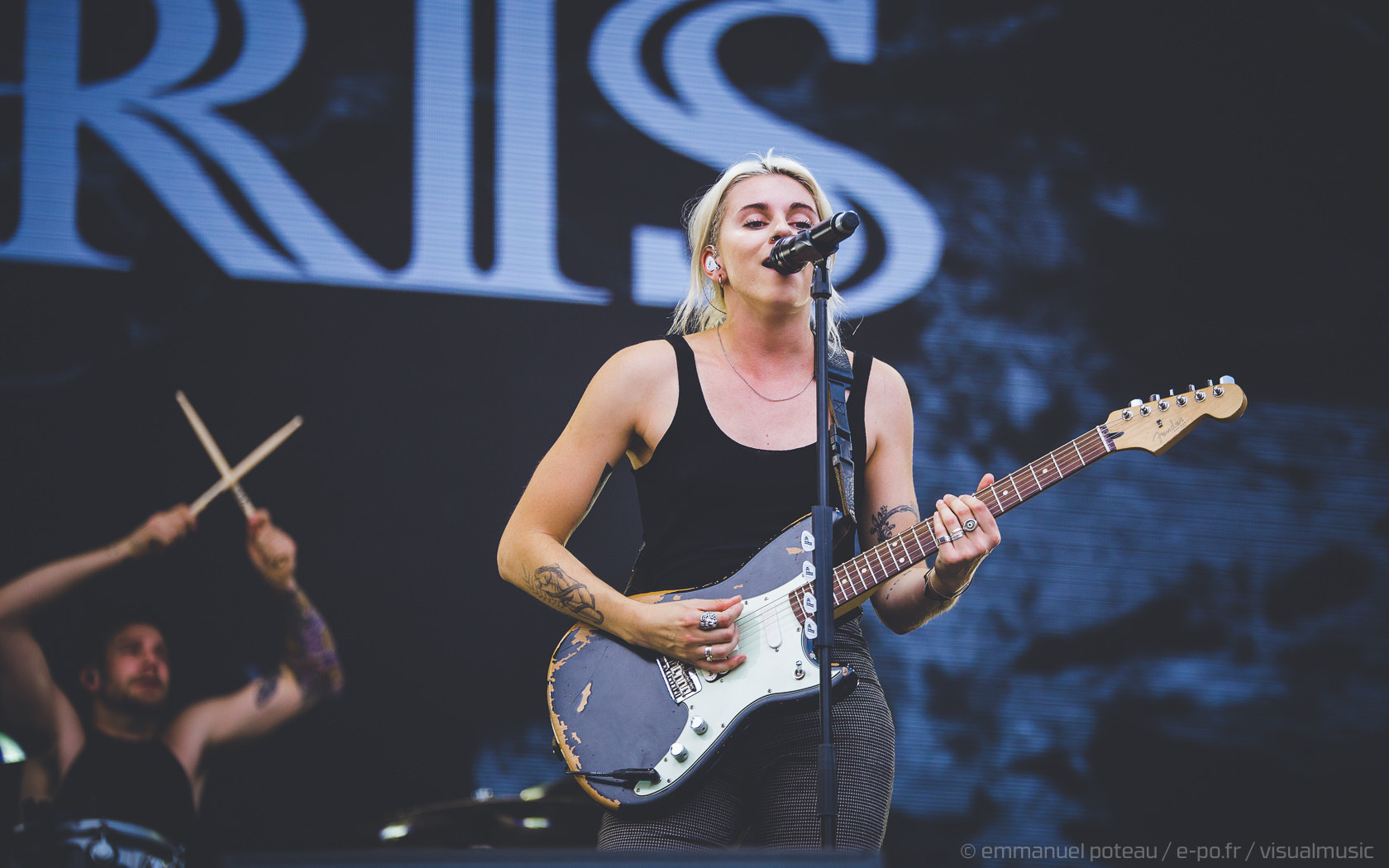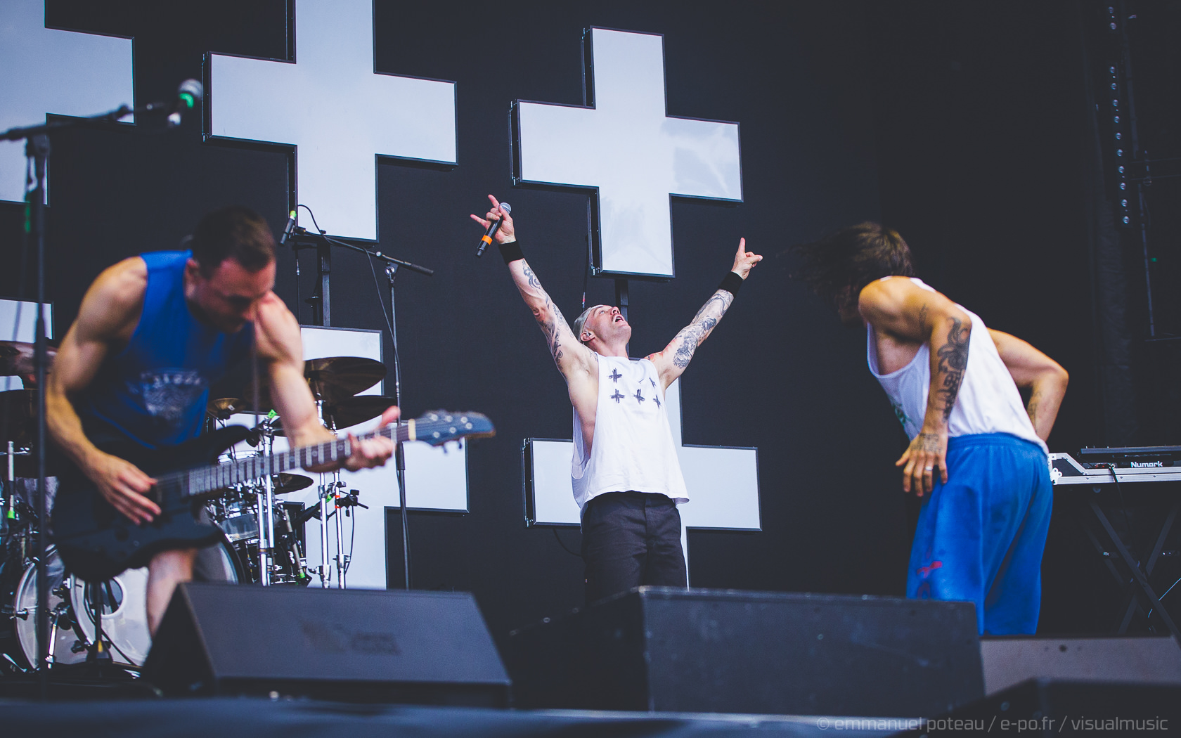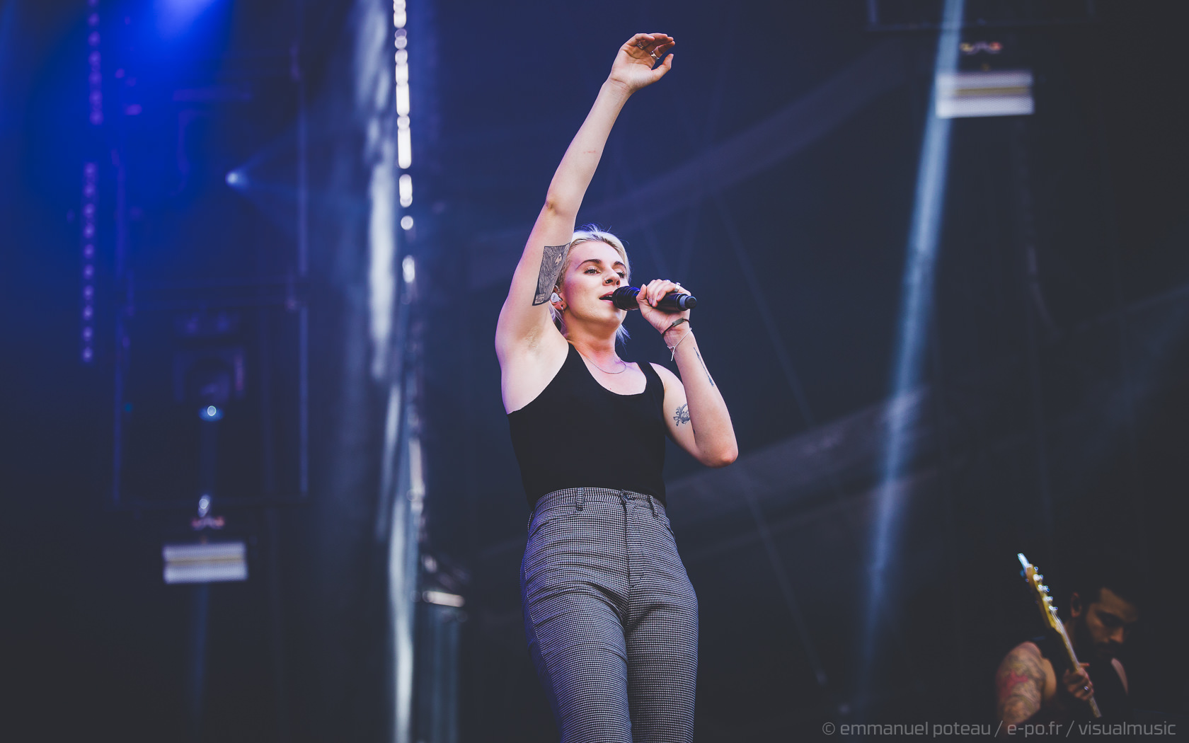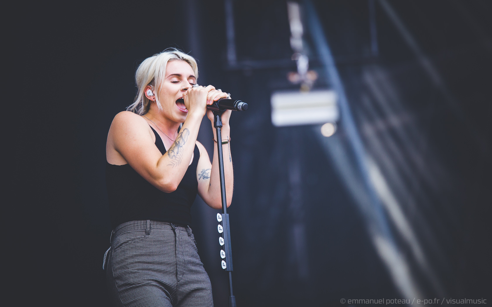 Ce sont donc les américains de PVRIS (ndlr : prononcez « Parisse ») qui ouvre les hostilités ! Emmenés par leur chanteuse aux cheveux blonds décolorés mais à la voix cristalline, Lynn Gunn. D’apparence frêle et fragile, elle va vite révéler son jeu de scène, demandant au public de les accompagner en frappant dans les mains pour mettre tout le monde d’accord sur le plan vocal. Quelle coffre ! Quelle énergie ! Ça saute de partout dans le public (plutôt jeune). Vous l’aurez compris, cette apparente timidité est littéralement mise de côté dès qu’il s’agit de pousser la voix et d’enchaîner les morceaux rock/électro toujours plus puissants… Plaisant et une belle manière d’entamer ce festival.