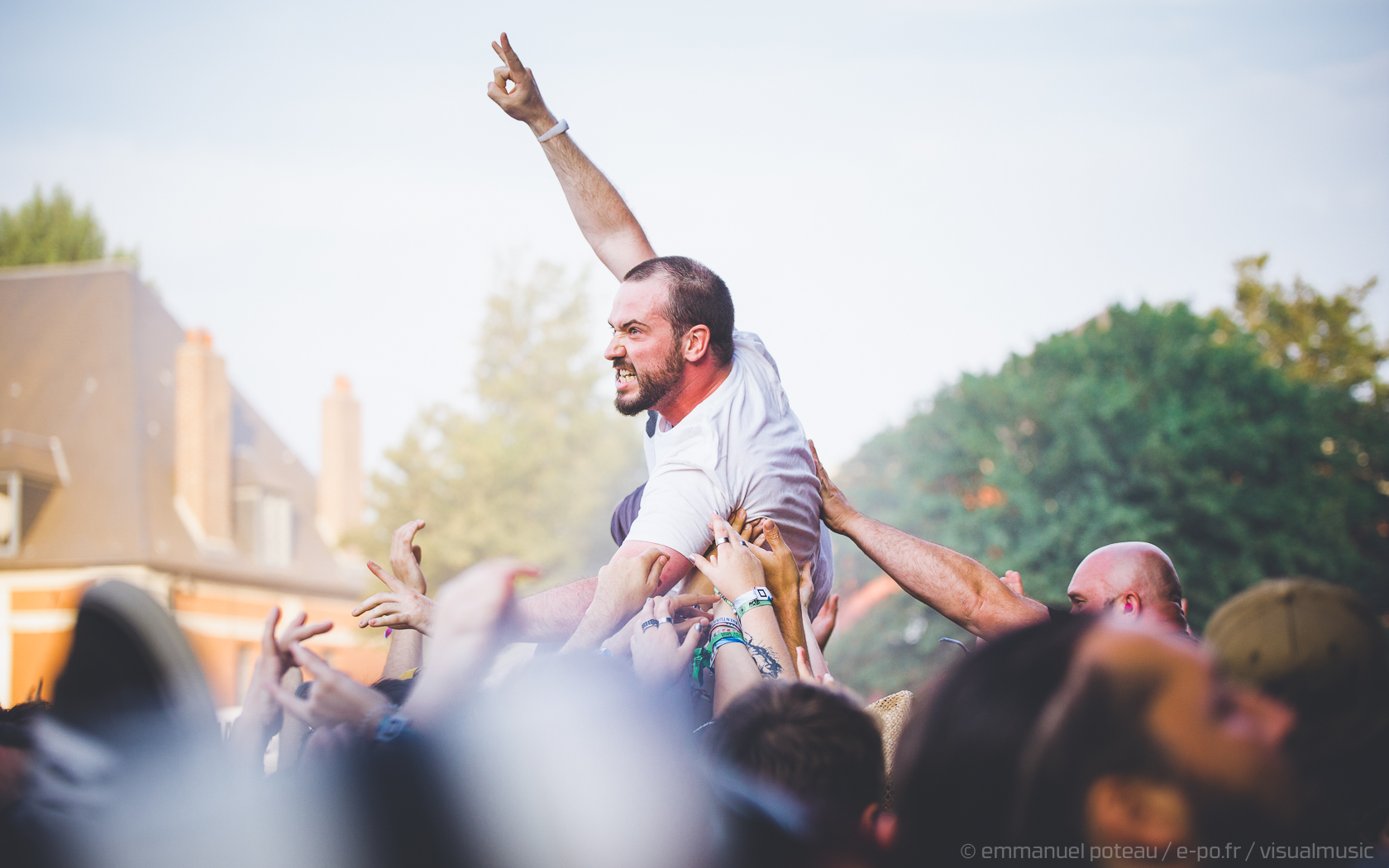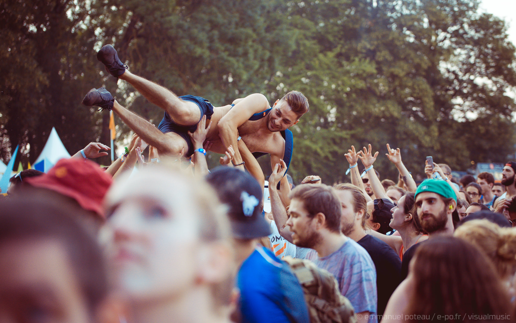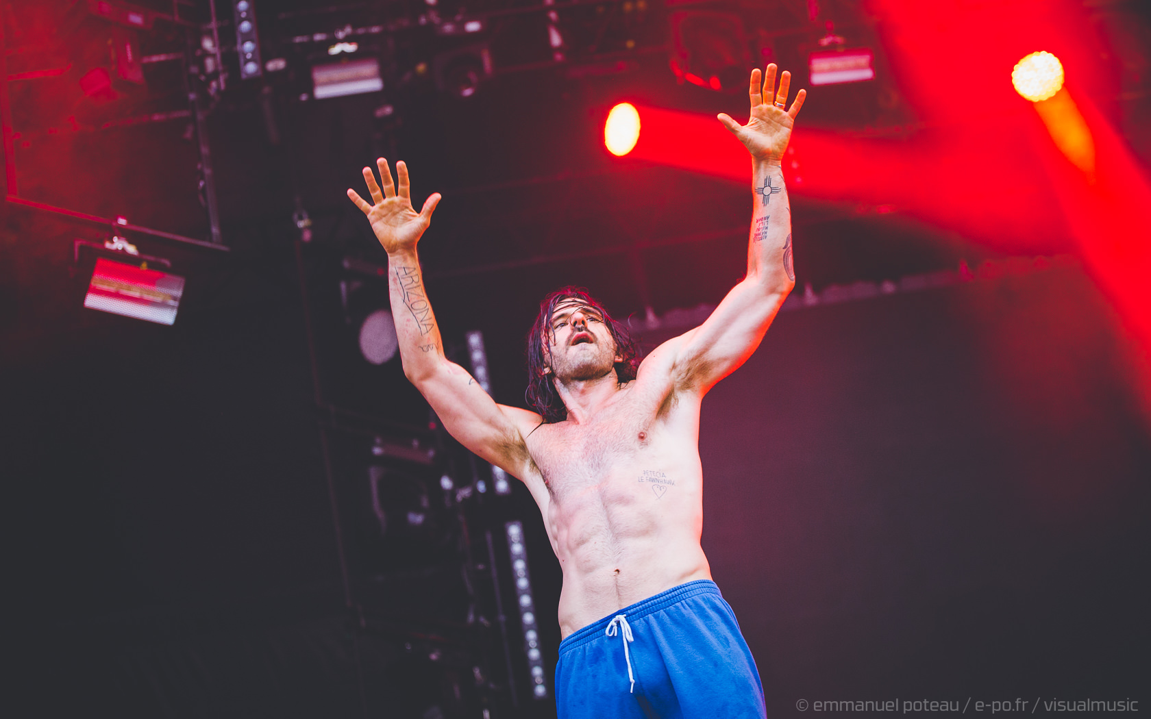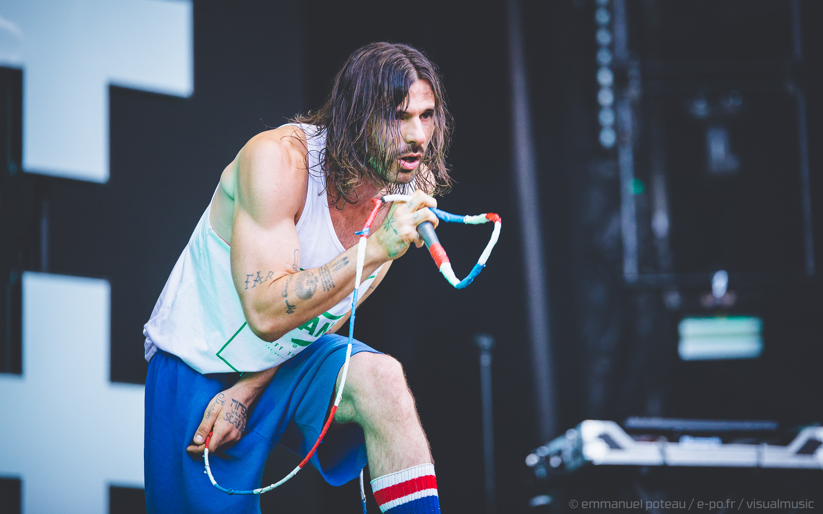 J’avoue, nous sommes arrivés dans une zone de méconnaissance totale, Roméo Elvis, on sait juste que le mec a du succès auprès des plus jeunes du public, déjà très présents sur la Green Room pour l’une des stars de la journée. Le rappeur belge, arborant un maillot de l’équipe nationale à son nom, parle foot, match de coupe du monde oblige, évoquant même la demi-finale (perdue depuis) espérant que les français sauront rester humbles. Néanmoins il n’en oublie pas son concert épaulé par 3 musiciens et un public reprenant en choeur le moindre titre. On s’amusera de la queue de crocodile dépassant de la cape même de l’artiste, originalité, quand tu nous tiens ! C’est un vrai retour à l’adolescence : compressés comme des navets, à échanger nos sueurs, ça pogote, ça profite de la vie voire du bac puisque les résultats étaient le même jour ! En tout cas, le succès est total, son jeune public me déclarant même : « c’est un peu vulgaire mais Romeo Elvis met l’ambiance quand même ! »