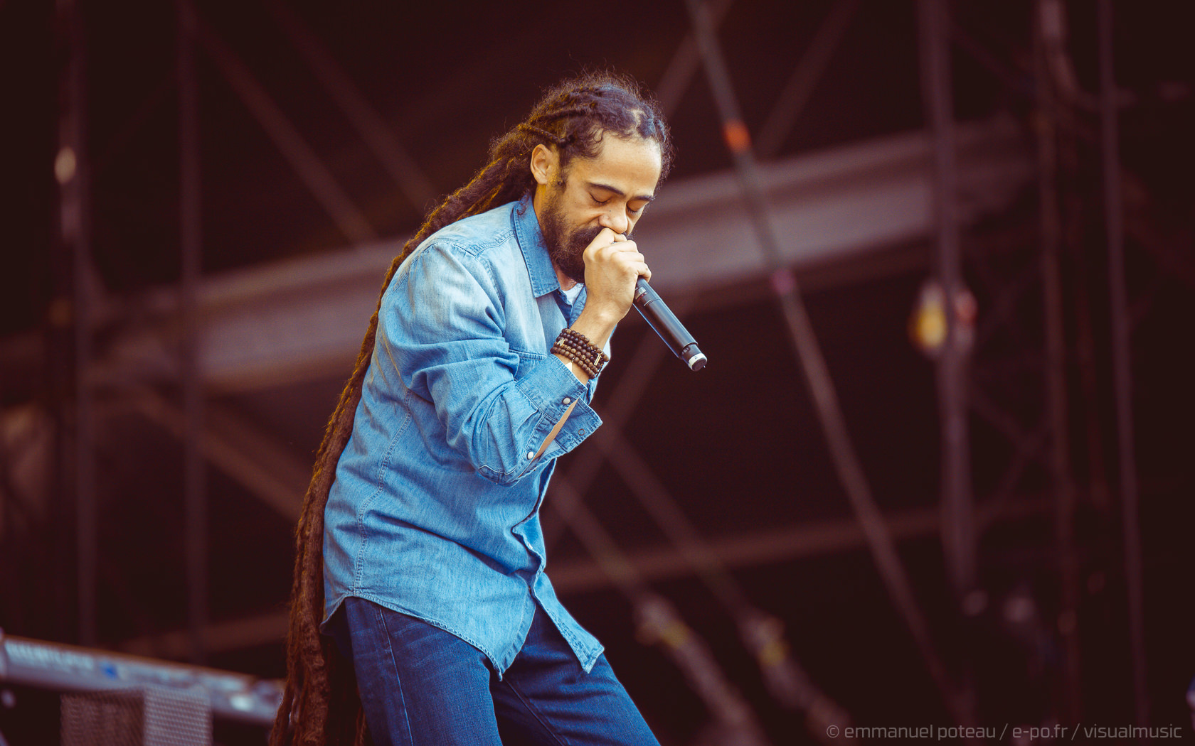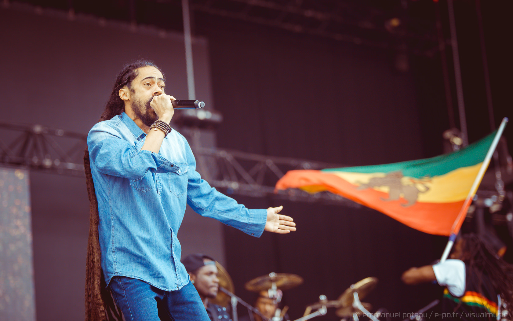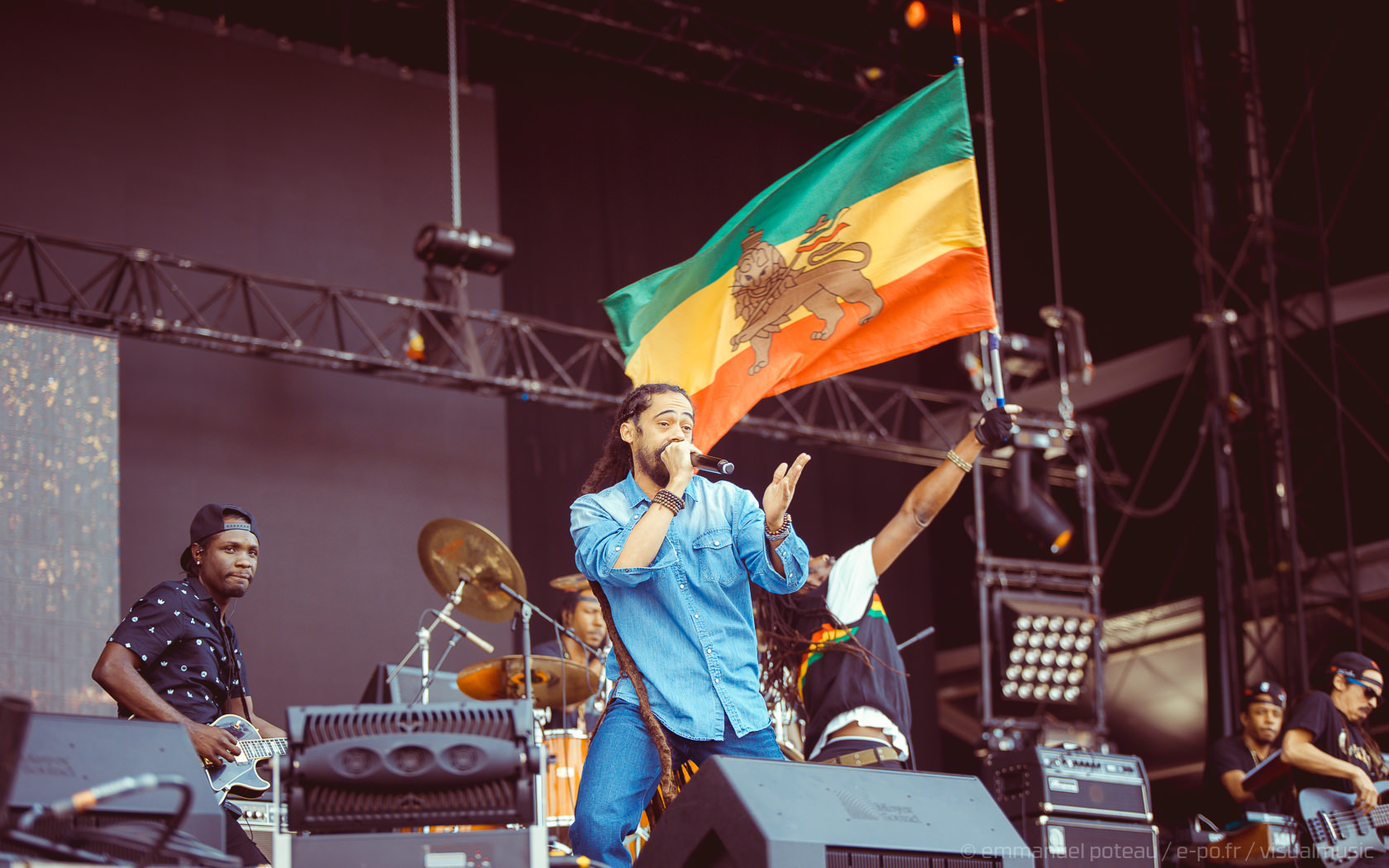 Damien Jr. Gong Marley, le fils de celui qu’on ne présente plus ! Hommage poussé jusqu’au bout puisque le public n’était pas venu qu’avec des cigarettes pour accueillir son passage. Petite séance photos, mains en l’air, devant son public pour notre futur quarantenaire qui pose et c’est parti ! Ou presque ! Le temps pour le public de laisser éclater sa joie en chantant très fort et à l’unisson: « on est en demiiii, on est en demiiii, on est, on est… » Vous connaissez la suite ! Un petit hymne national, un p’tit clapping et cette fois, on est bons ! Ou presque ! Sur scène, un présentateur aux couleurs locales déboule afin de présenter le fils prodigue en toute simplicité. Et ça y est ! Ou presque ! On entend sa voix mais toujours pas d’apparition de la star ! Mais que vois-je ?!! Est-ce lui ?!! Non. Juste l’apparition d’un membre du staff agitant un drapeau orné du lion rastafarien et le voilà enfin !! Tout de jean vêtu, des dreads jusqu’aux chevilles, les mains se lèvent dans le public, le drapeau danse toujours sur scène et 2 choristes viennent s’ajouter aux côtés du chanteur, pour montrer comment on fait. Ça se lâche dans le public, ça danse, ça se libère… Les jeunes et même les moins jeunes… On fait chanter le public… Bravo Marley ! Mission accomplie, on se croirait à un concert de ton père sur fond d’ordonnance médicale bien sûr ! « Do you know the medical benefits of marijuana ? Do you like marijuana ? » Yeeeeaaaah !!!
