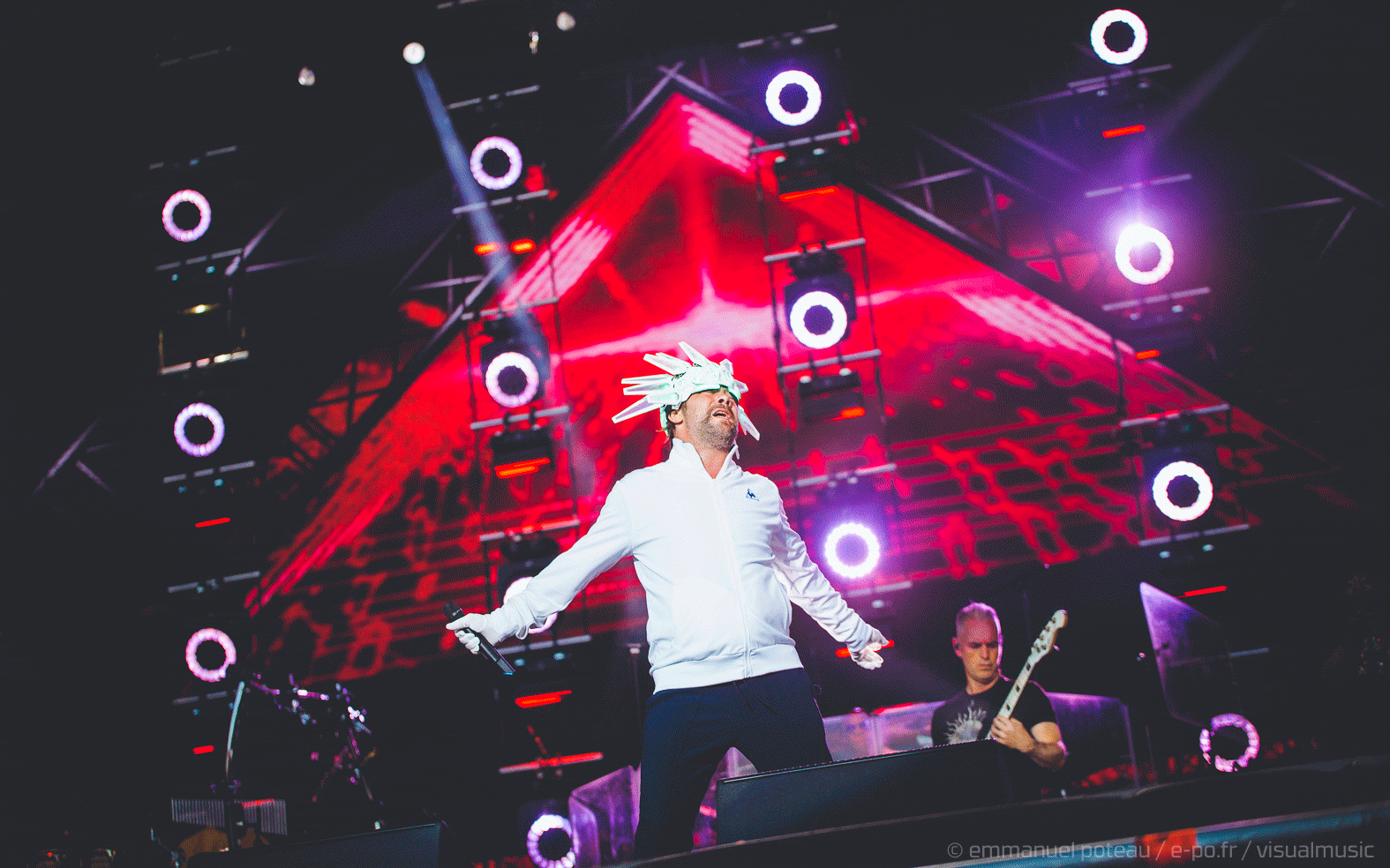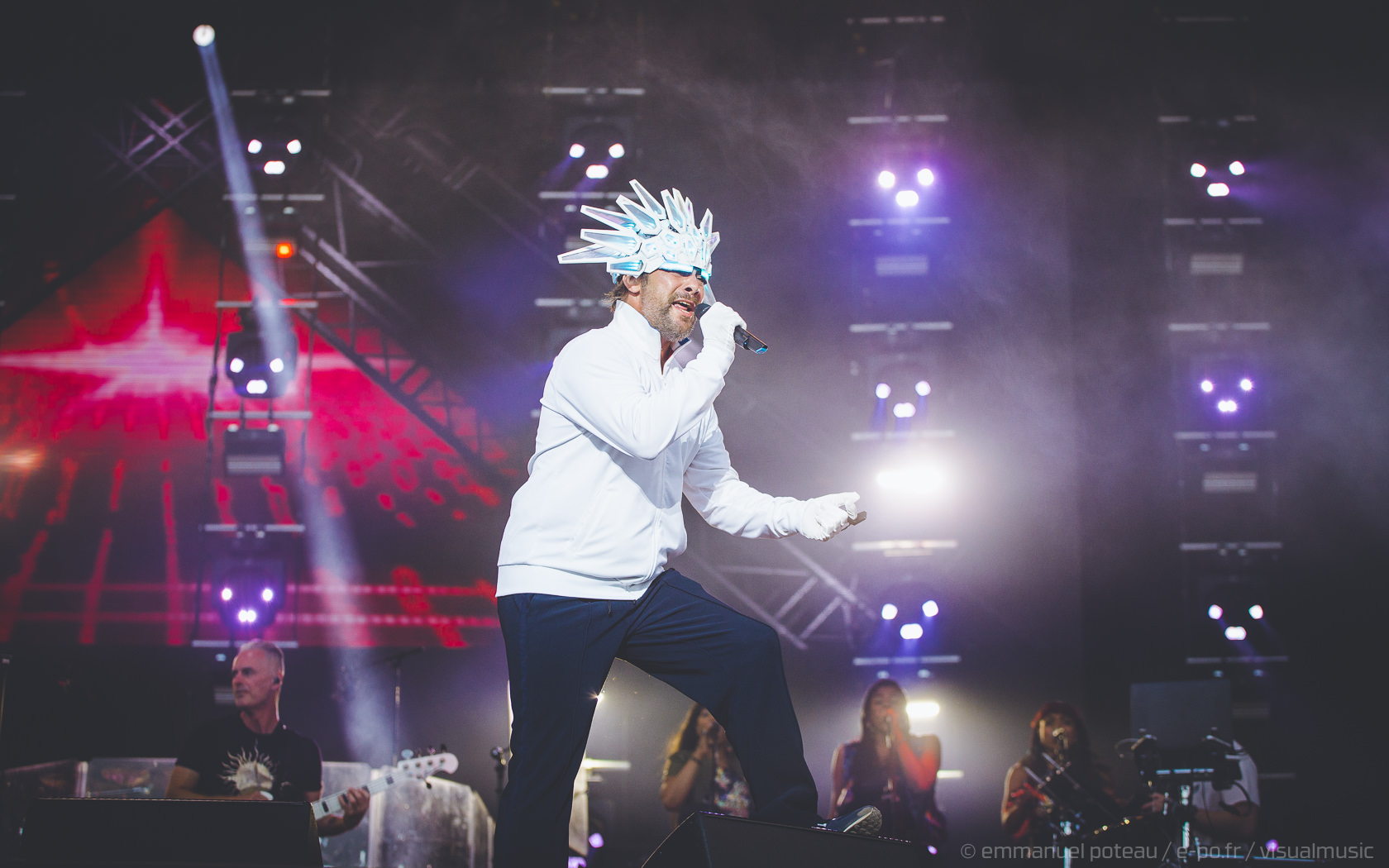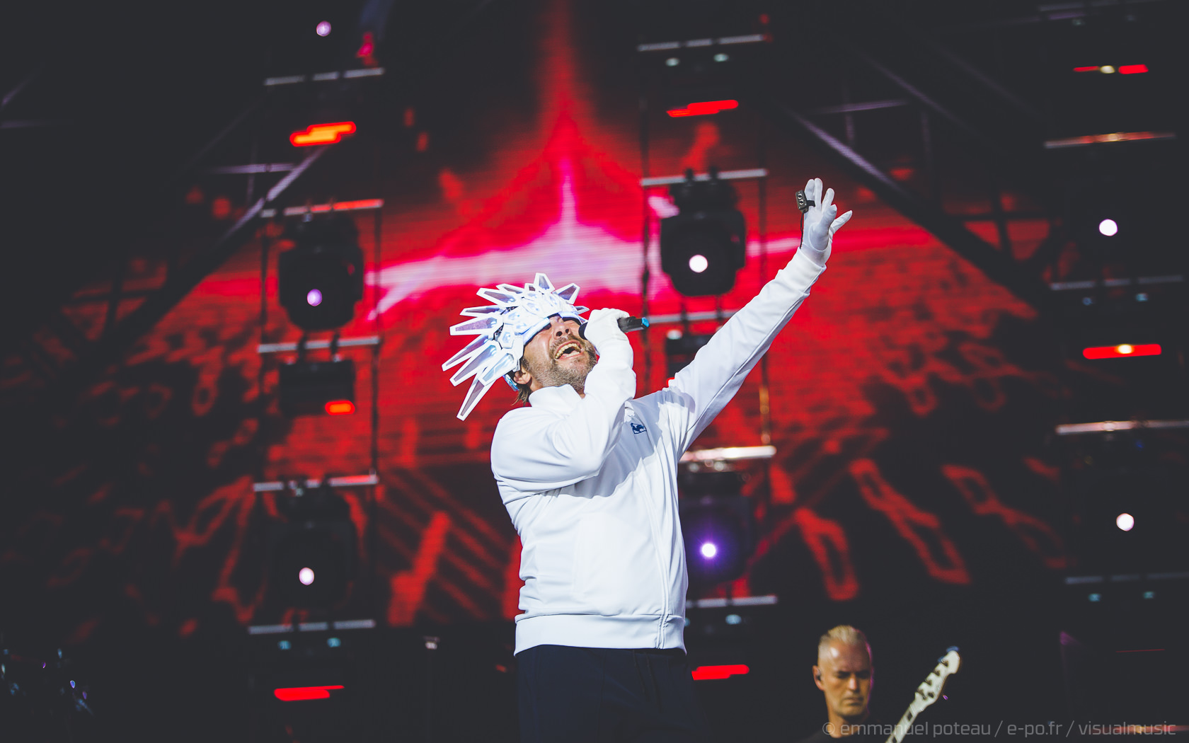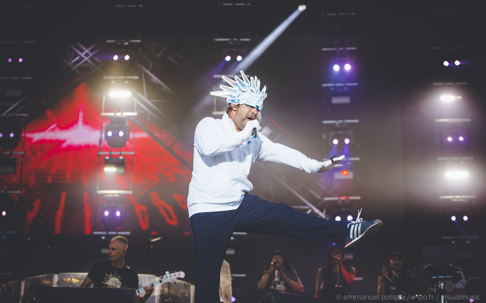Nous y voilà, la tête d’affiche du dimanche, c’est le remuant « J Kay », Jamiroquai pour les non initiés. Gros show en perspective avec patate de lights, 2 batteries, 3 choristes et tous les musiciens qui vont bien, guitare, basse, etc… Et le voilà, le roi de la funk, toujours coiffé d’un chapeau original : cette fois, ce sera un casque futuriste blanc avec des sortes de grosses écailles à led et… et… un jogging… Normal, comme d’hab’ !