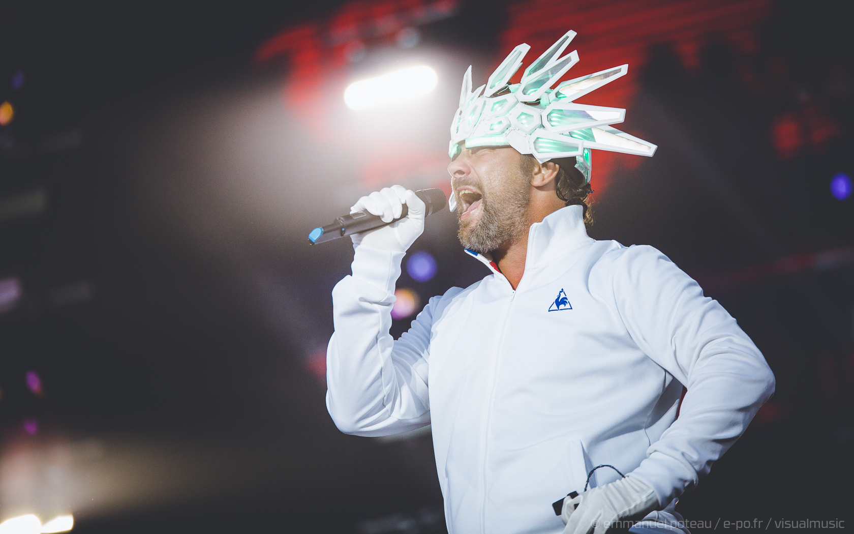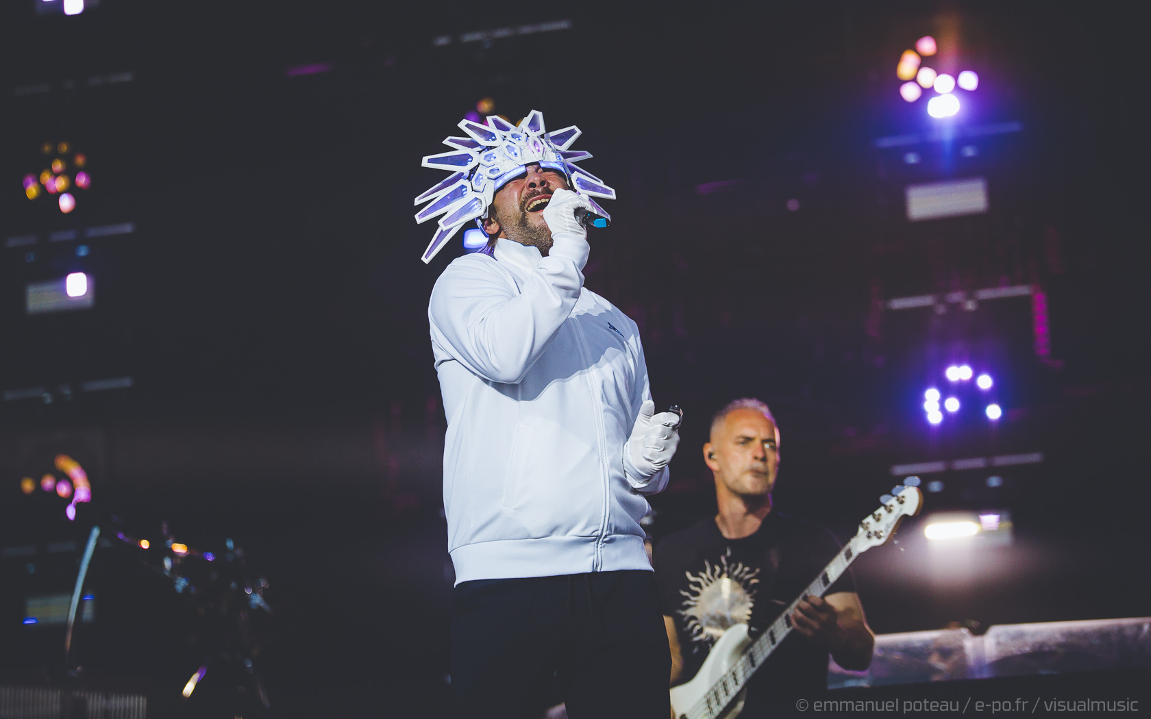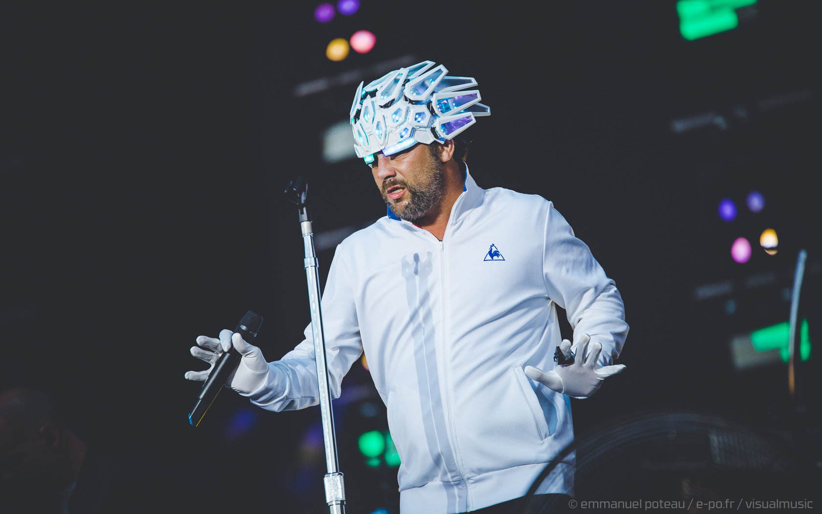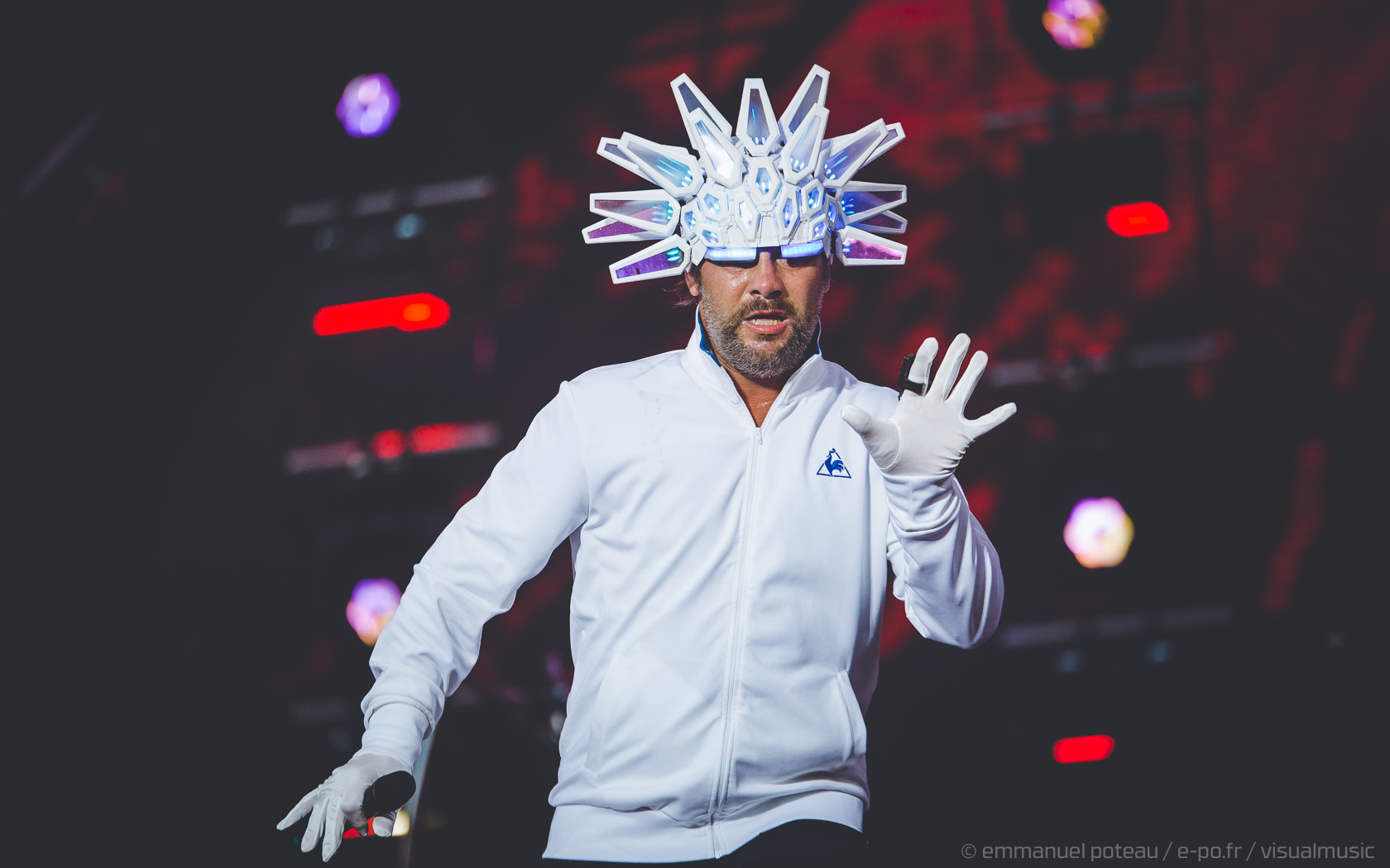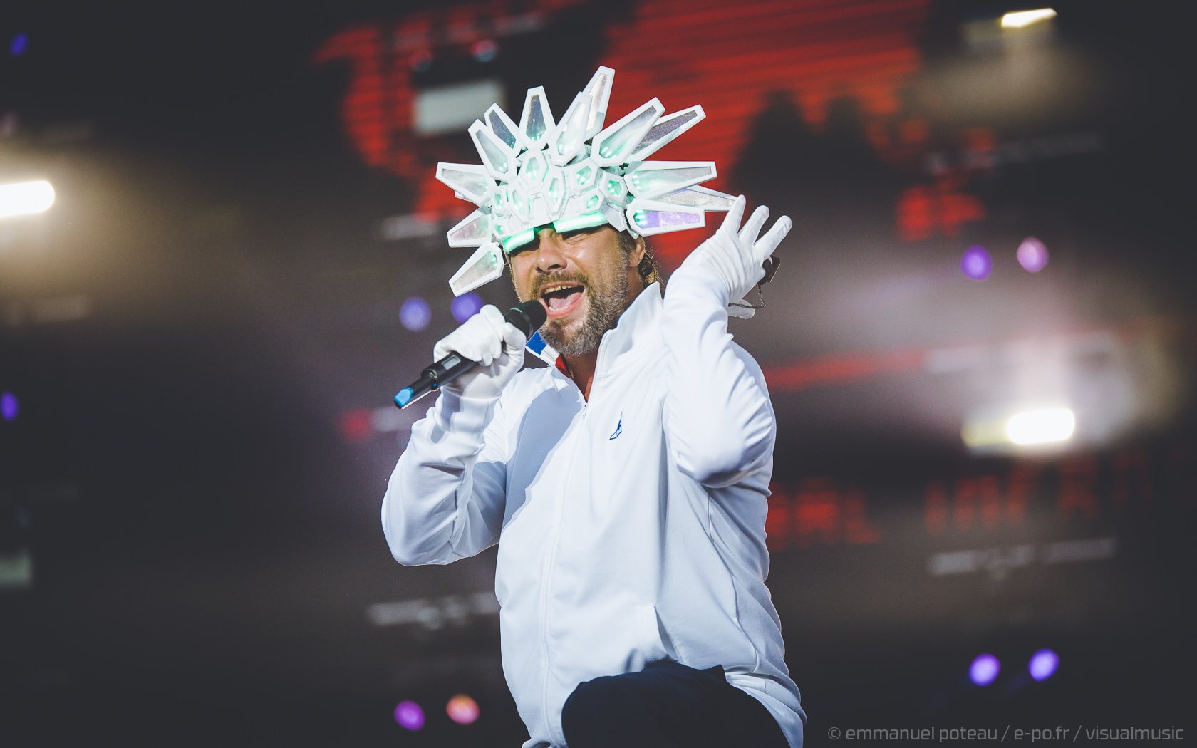 Nous y voilà, la tête d’affiche du dimanche, c’est le remuant « J Kay », Jamiroquai pour les non initiés. Gros show en perspective avec patate de lights, 2 batteries, 3 choristes et tous les musiciens qui vont bien, guitare, basse, etc… Et le voilà, le roi de la funk, toujours coiffé d’un chapeau original : cette fois, ce sera un casque futuriste blanc avec des sortes de grosses écailles à led et… et… un jogging… Normal, comme d’hab’ !