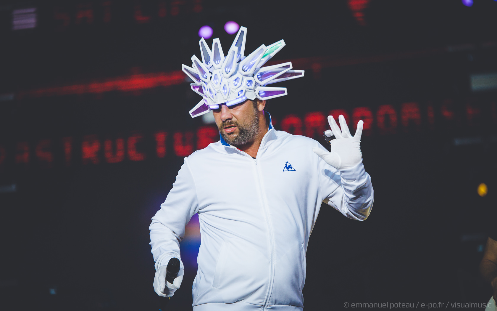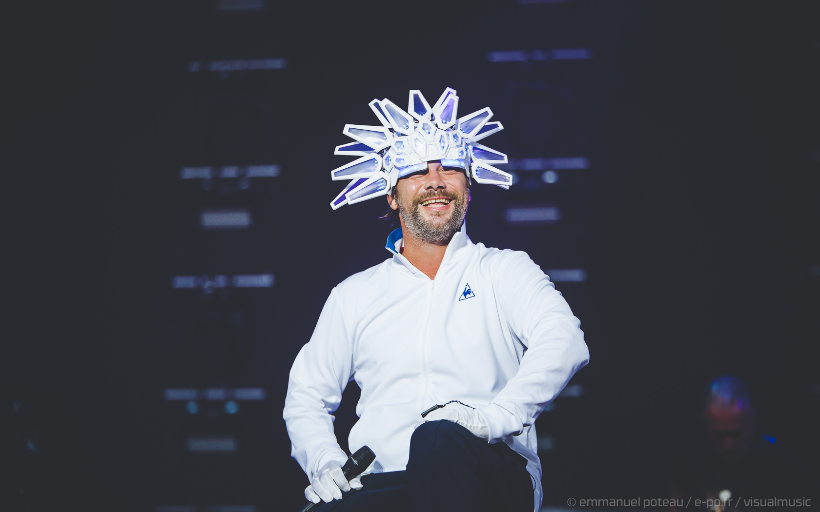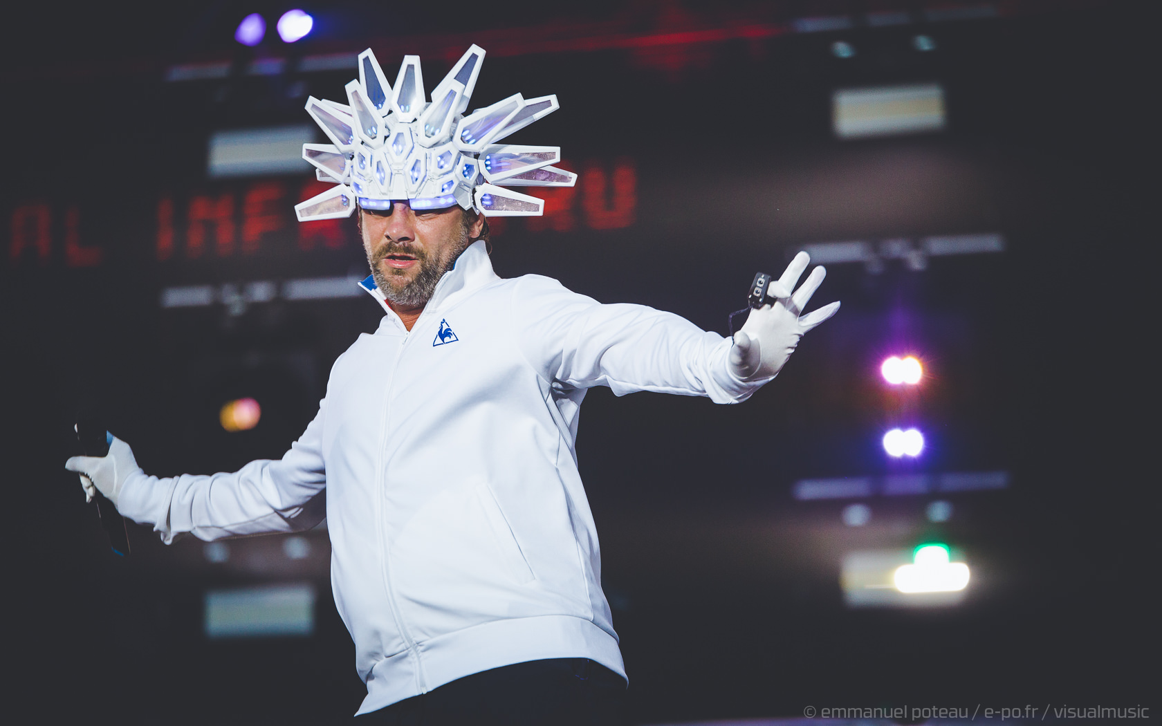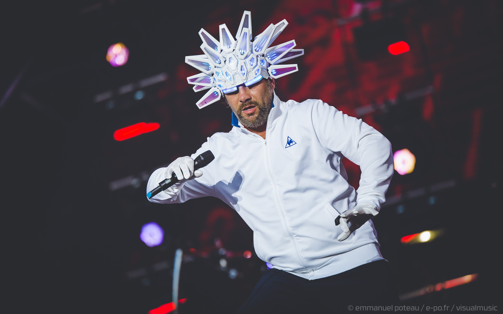 Nous y voilà, la tête d’affiche du dimanche, c’est le remuant « J Kay », Jamiroquai pour les non initiés. Gros show en perspective avec patate de lights, 2 batteries, 3 choristes et tous les musiciens qui vont bien, guitare, basse, etc… Et le voilà, le roi de la funk, toujours coiffé d’un chapeau original : cette fois, ce sera un casque futuriste blanc avec des sortes de grosses écailles à led et… et… un jogging… Normal, comme d’hab’ !