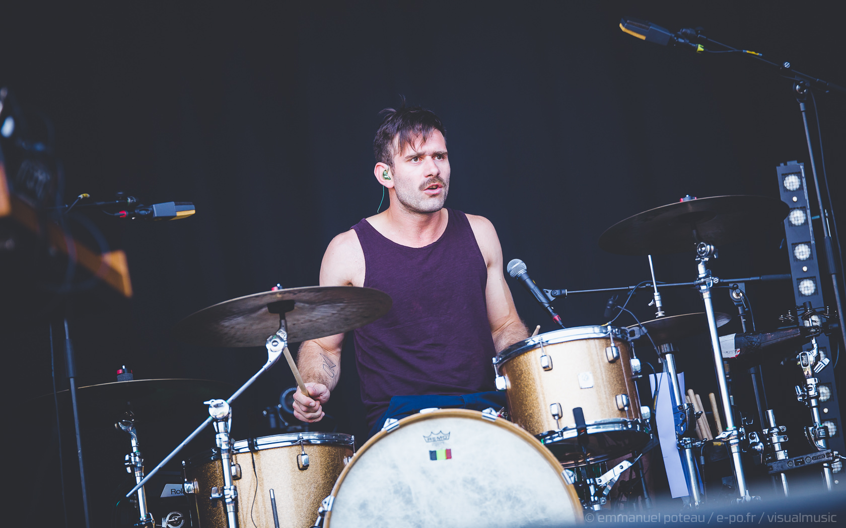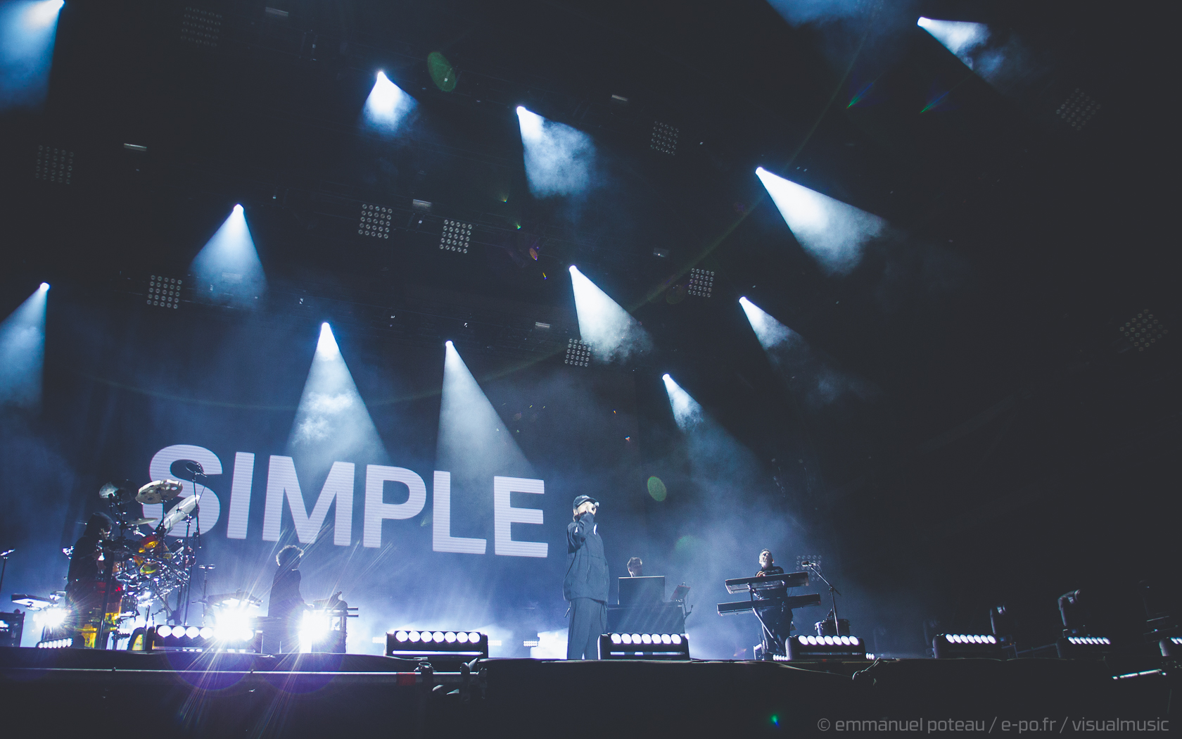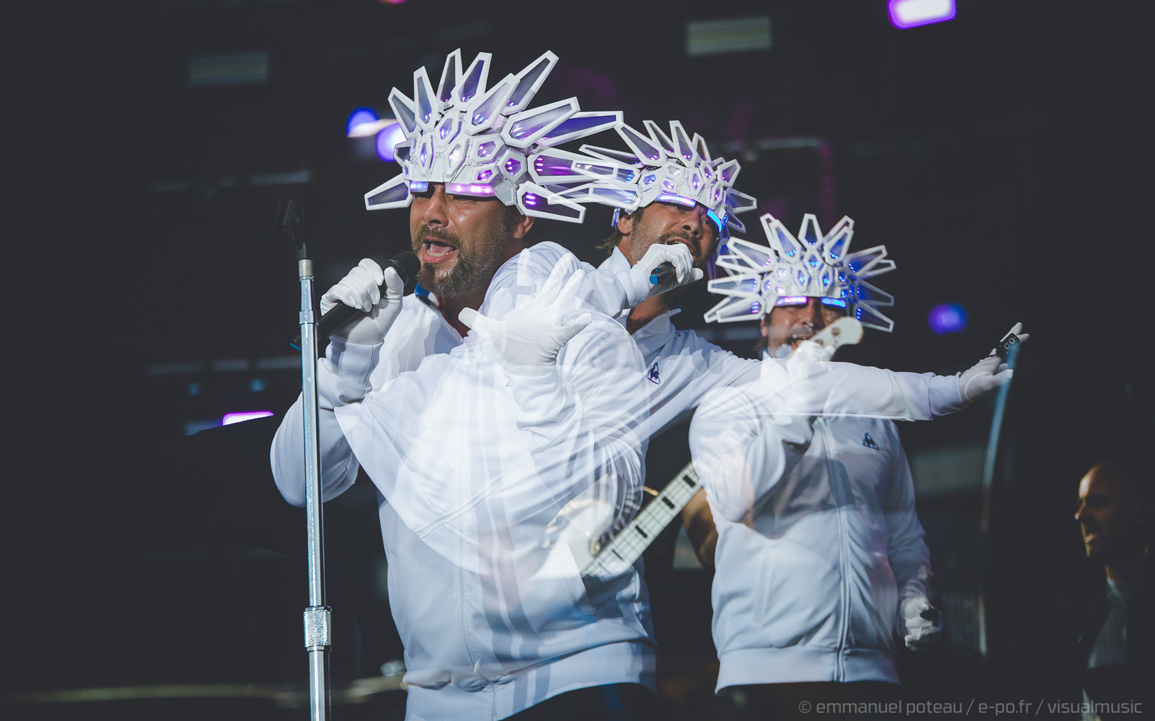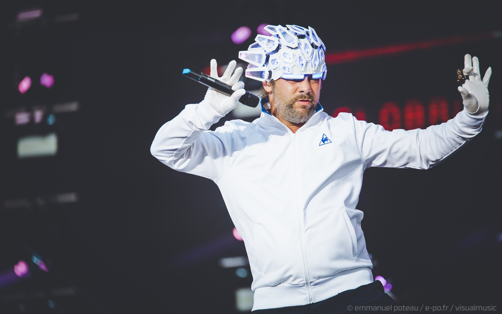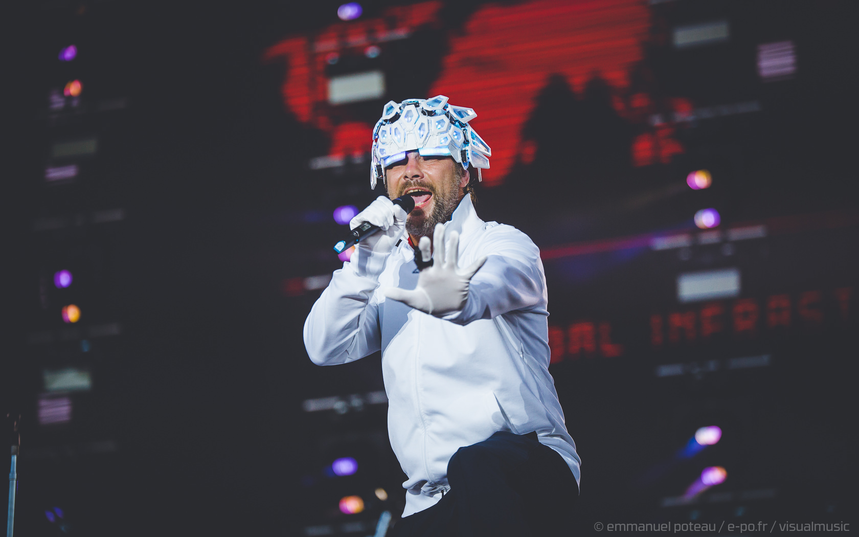 Nous y voilà, la tête d’affiche du dimanche, c’est le remuant « J Kay », Jamiroquai pour les non initiés. Gros show en perspective avec patate de lights, 2 batteries, 3 choristes et tous les musiciens qui vont bien, guitare, basse, etc… Et le voilà, le roi de la funk, toujours coiffé d’un chapeau original : cette fois, ce sera un casque futuriste blanc avec des sortes de grosses écailles à led et… et… un jogging… Normal, comme d’hab’ !