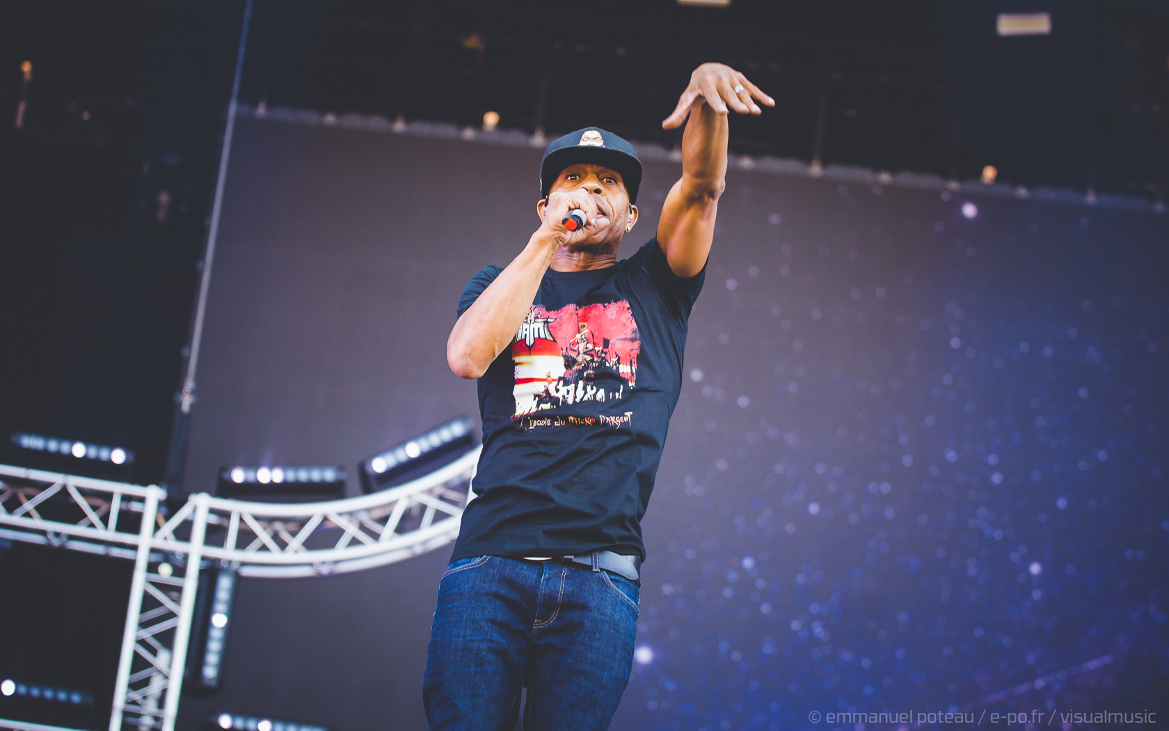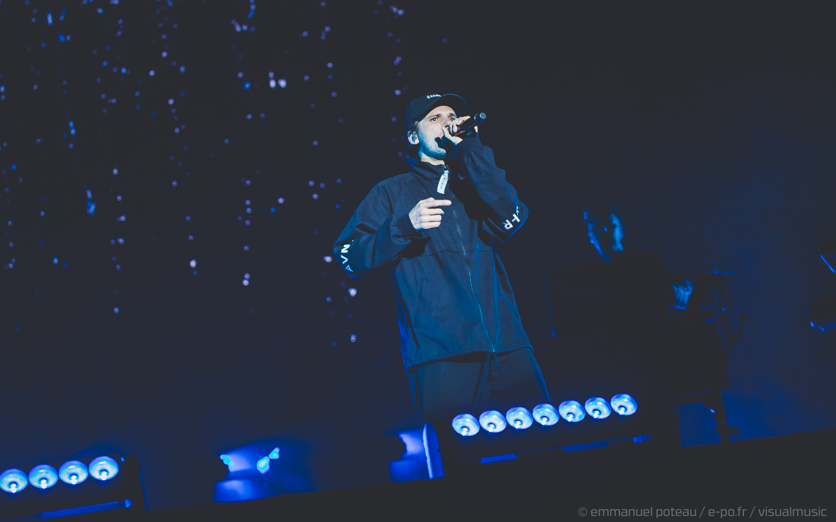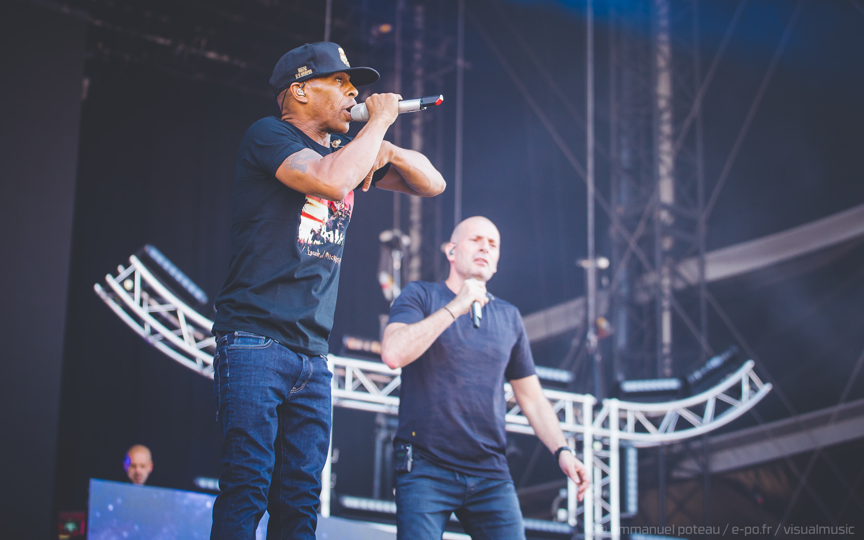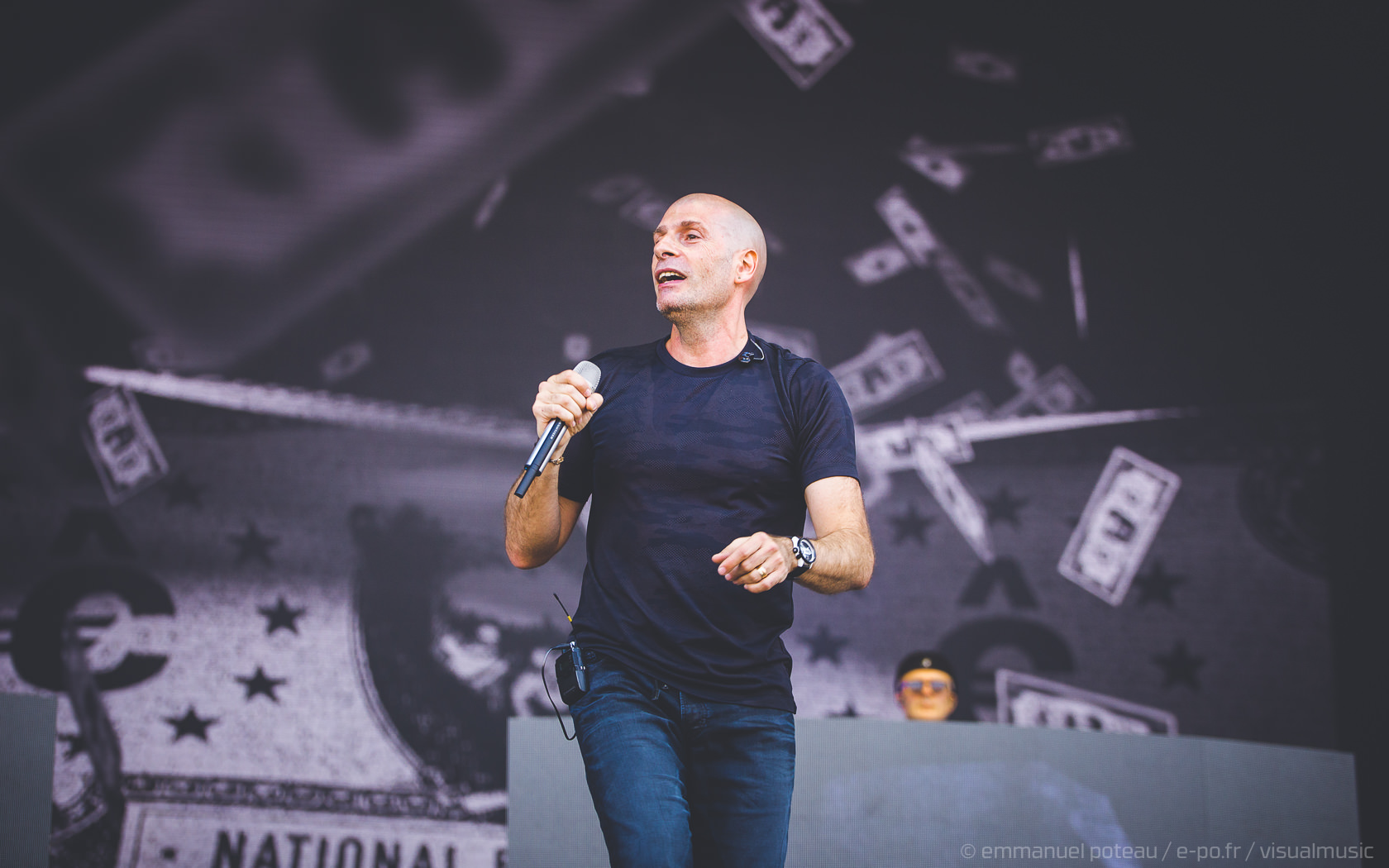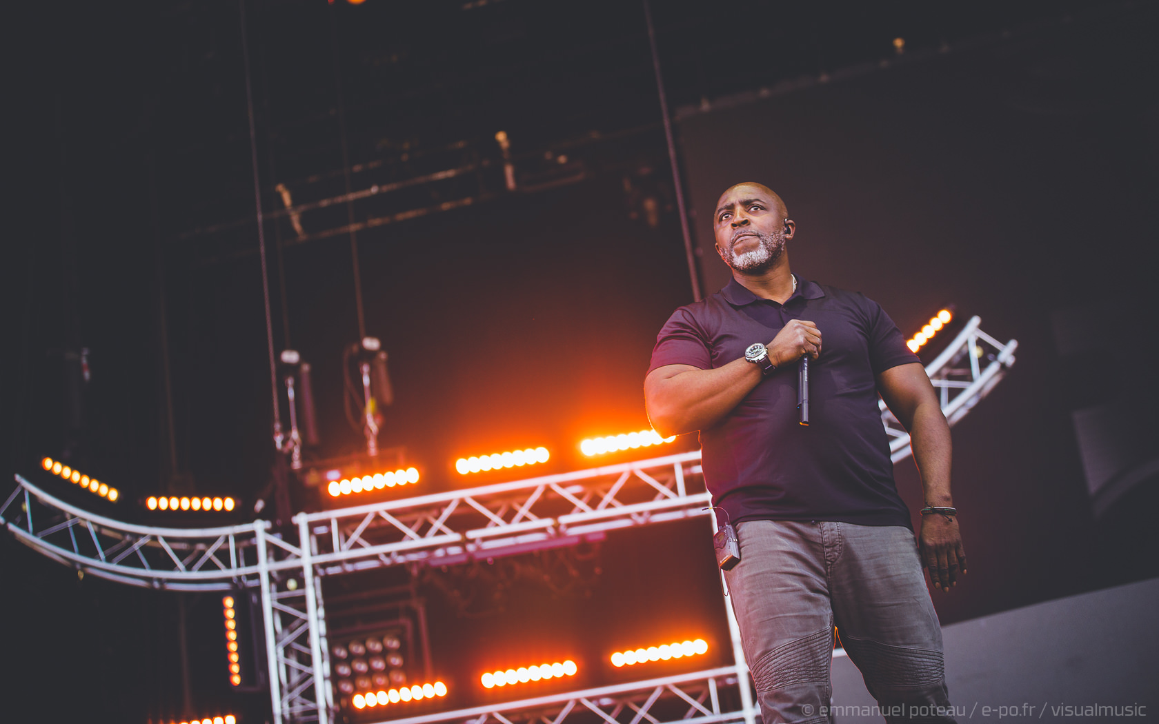 La vraie tête d’affiche, ce n’était pas uniquement Jamiroquai mais aussi Orelsan vu l’énorme foule massée devant les barrières de la main stage ! La même scène et on a presque l’impression que le matos prévu pour le rappeur français est encore plus important mais en fait, pas vraiment, c’est aussi comparable avec de gros écrans et des musiciens dispatchés un peu partout sur l’énorme scène du festival. Puis apparait Orelsan, en jogging noir, simple, basique.