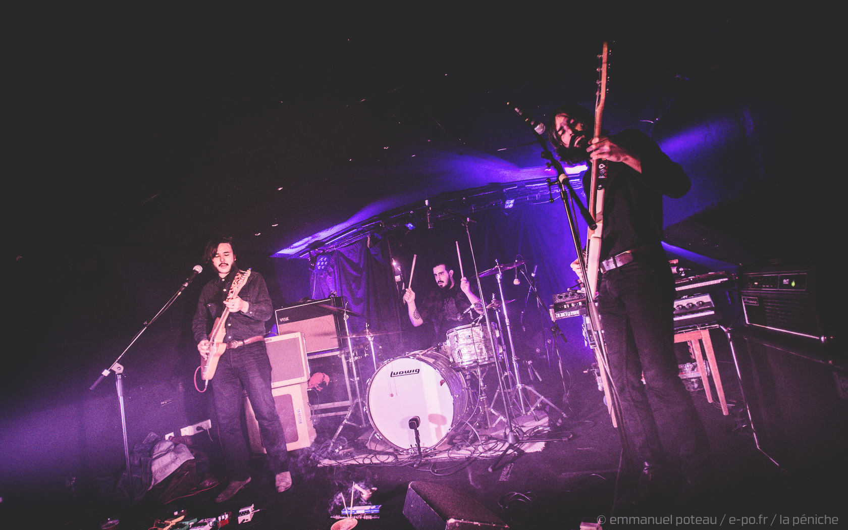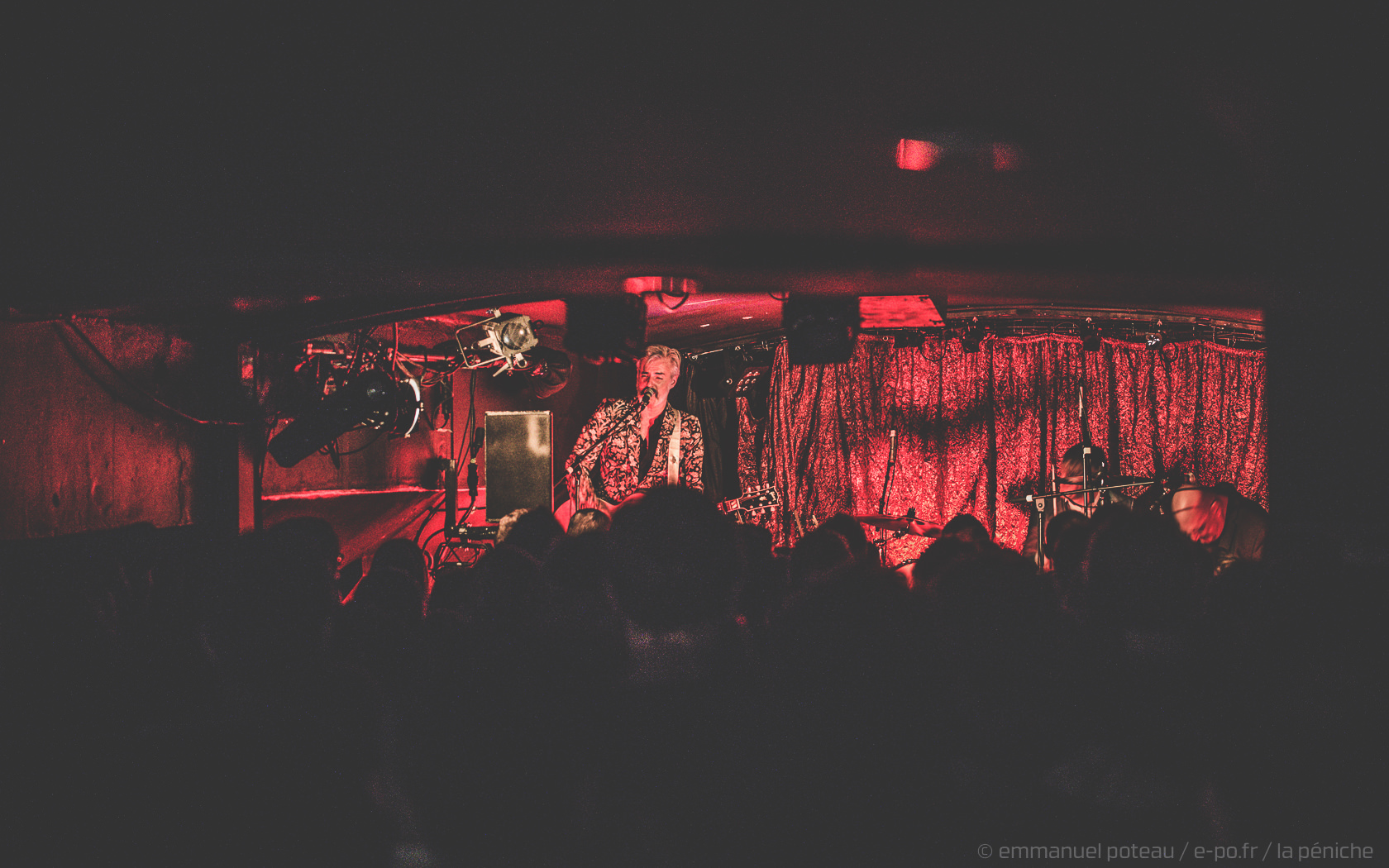 À titre personnel, j’ai quand même l’impression d’avoir loupé de trop nombreuses dates au sein de la Péniche, l’organisation m’aura permis d’amoindrir mes regrets puisque pour le second week-end, clairement porté par la vague d’amitié que de nombreux groupes auront à l’égard de la salle, ce n’est rien de moins que Triggerfinger qui ouvrira les hostilités. Travaillant actuellement sur un prochain album, le groupe claque là une date exceptionnelle. Entre amis. Et que dire de ce privilège rare d’avoir pu assister aux balances du groupe ? Vautré dans l’intimité même de la salle, me voici à profiter de l’échauffement musical du trio belge. Une heure de « concert » durant laquelle il m’aura fallu une ou deux fois me rappeler que personne ne s’attend à ce que quelqu’un applaudisse. Pourtant, difficile de résister au refrain d’un « By Absence Of The Sun » ou du groove de « Perfect Match ». Le soir venu, Ruben enfilera son plus beau costume papier peint à motif floral pour nous épater de toute sa classe rock n’roll épaulé par Mario (batterie) et Paul (basse) impeccables dans le rôle de section rythmique.